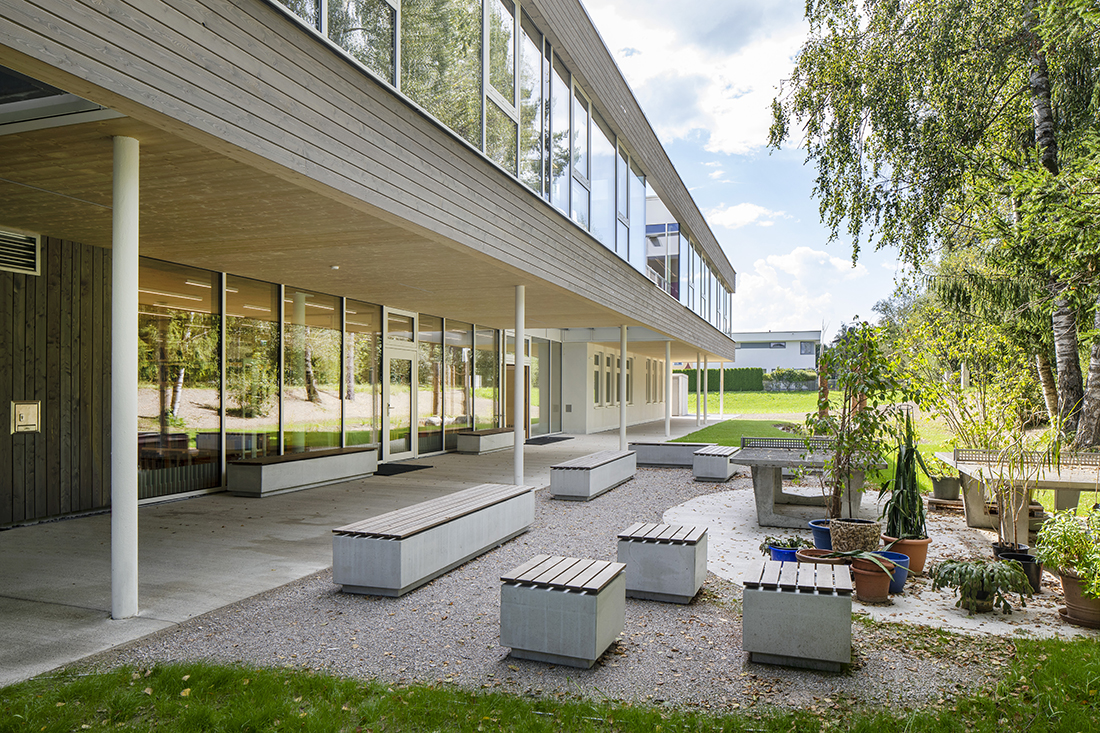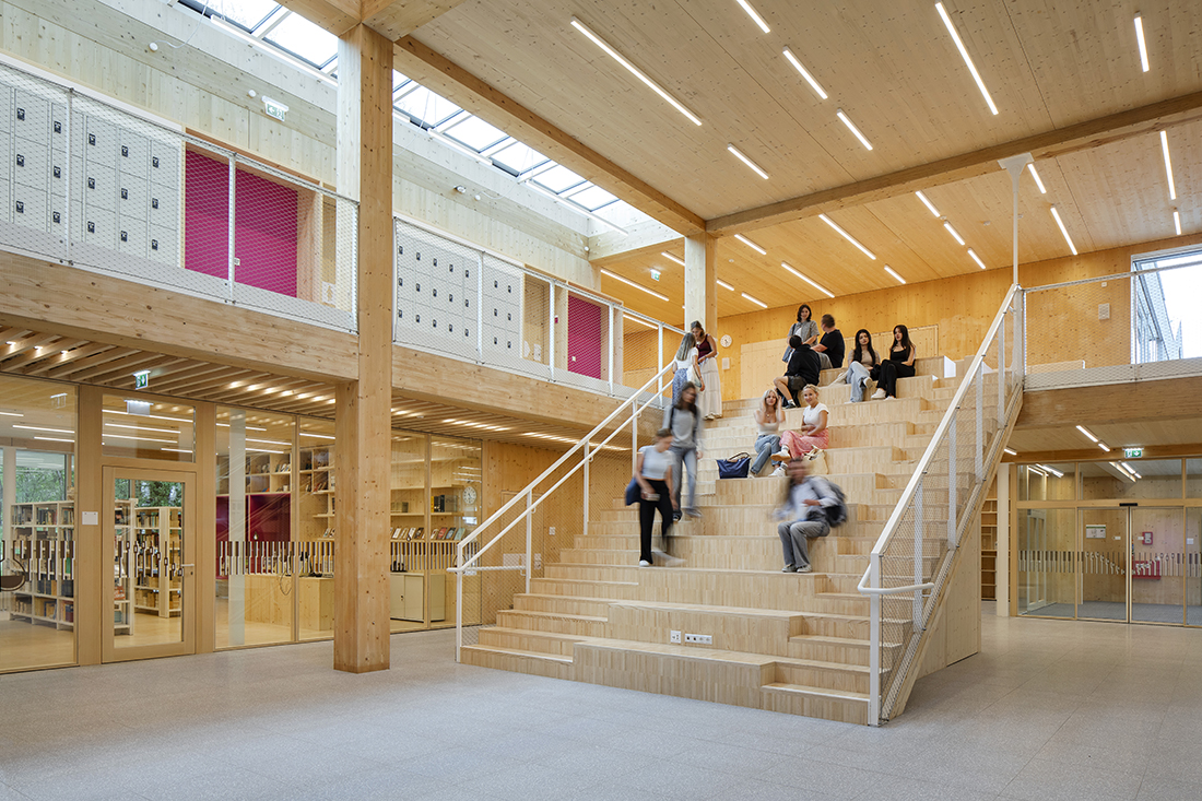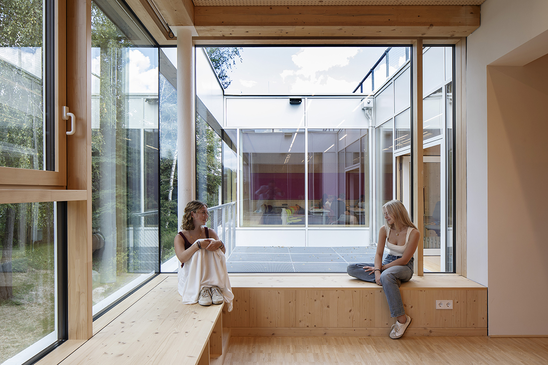 Open learning zones, generous open spaces, and perforated façades create an exciting spatial structure that seamlessly integrates the existing building with new elements. The concept is characterized by sustainability: existing structures have been preserved and integrated resourcefully, while new components have been added using timber construction.