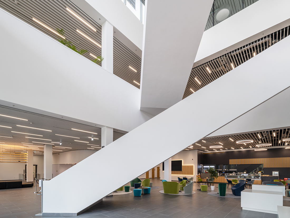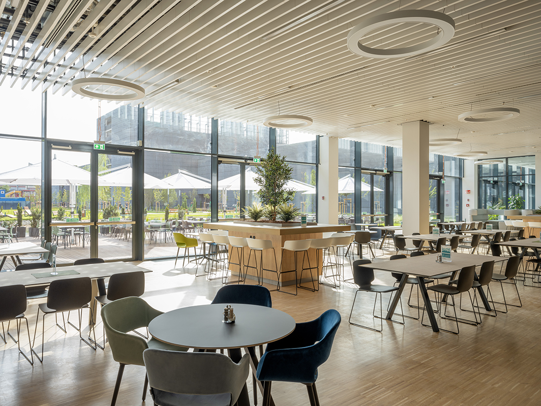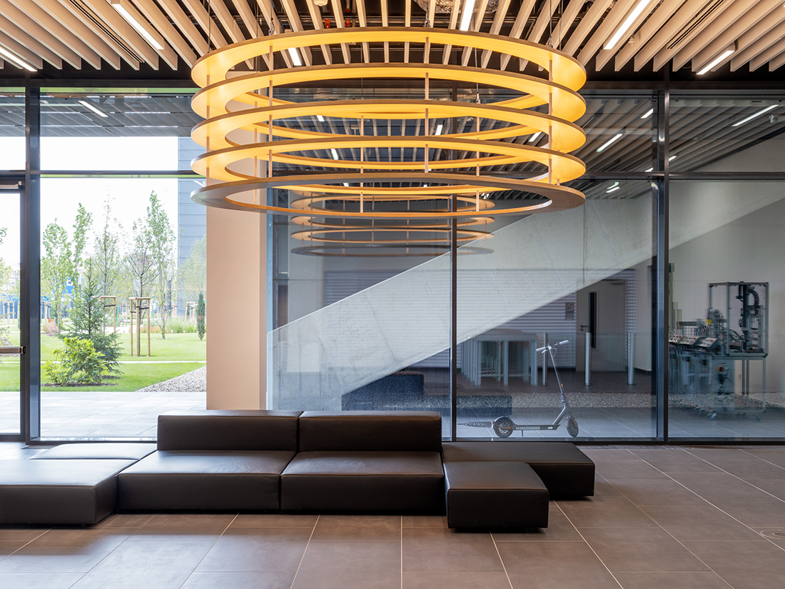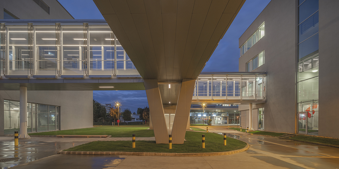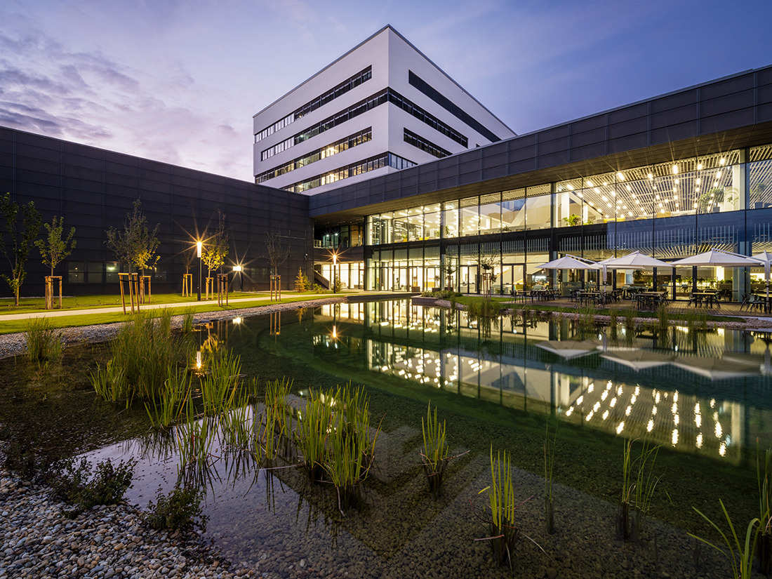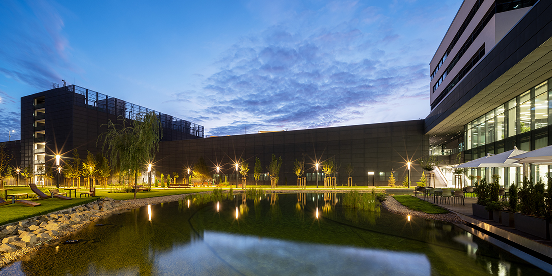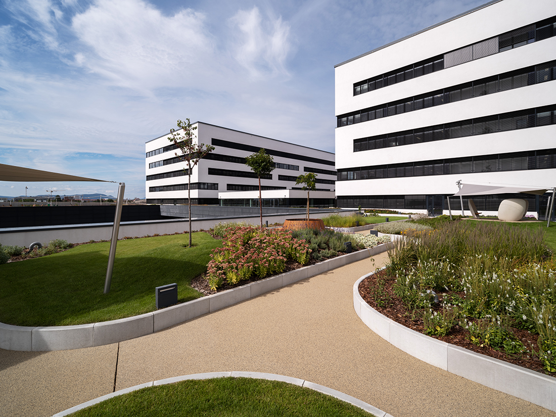 During the Campus2 development, office and laboratory rooms, a vehicle assembly hall, a canteen, a large lecture hall, a multistory parking garage, and a test track were designed. Covered pedestrian passageways were established between the individual Campus2 buildings to provide pedestrian connections within the area. The heart of Campus2 is the inner green yard, which includes an artificial pond situated in front of the main entrance and the restaurant. All buildings have functional green roofs, which have been connected to the green roof of the pedestrian bridge as well. In addition to the Campus2 offices, various research, development, and testing laboratories, as well as industrial laboratory facilities, have been installed.