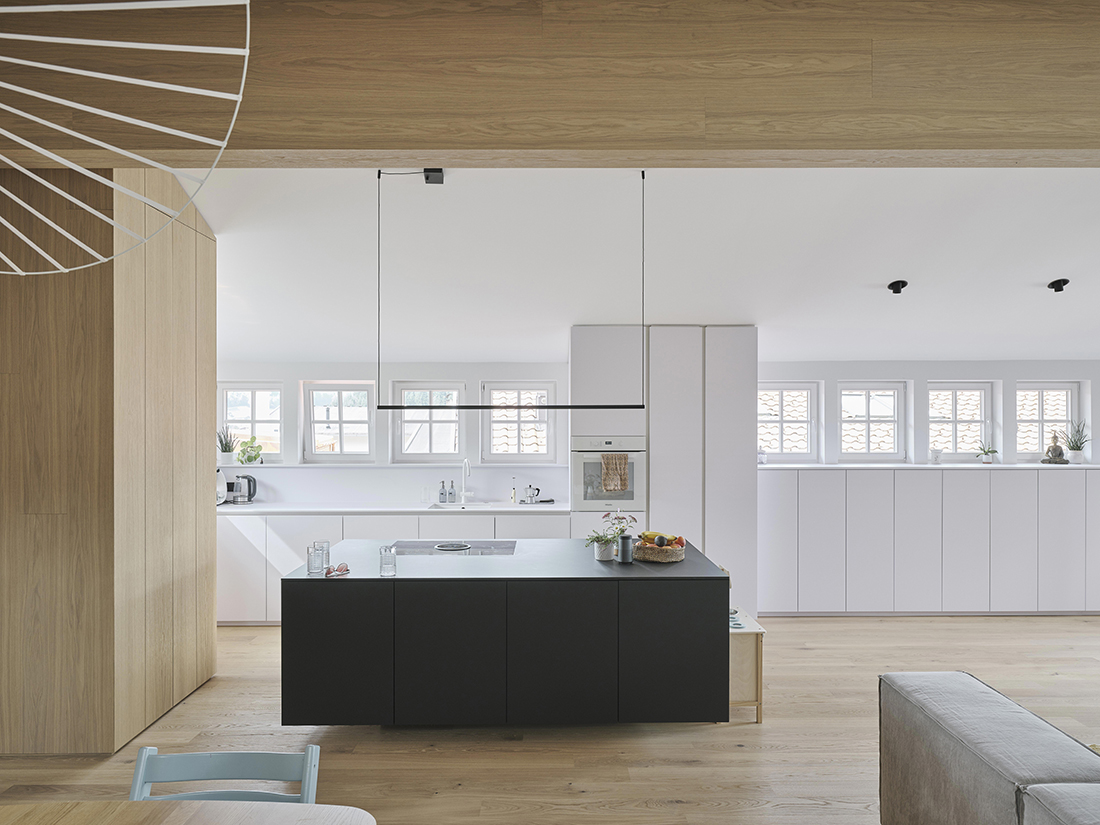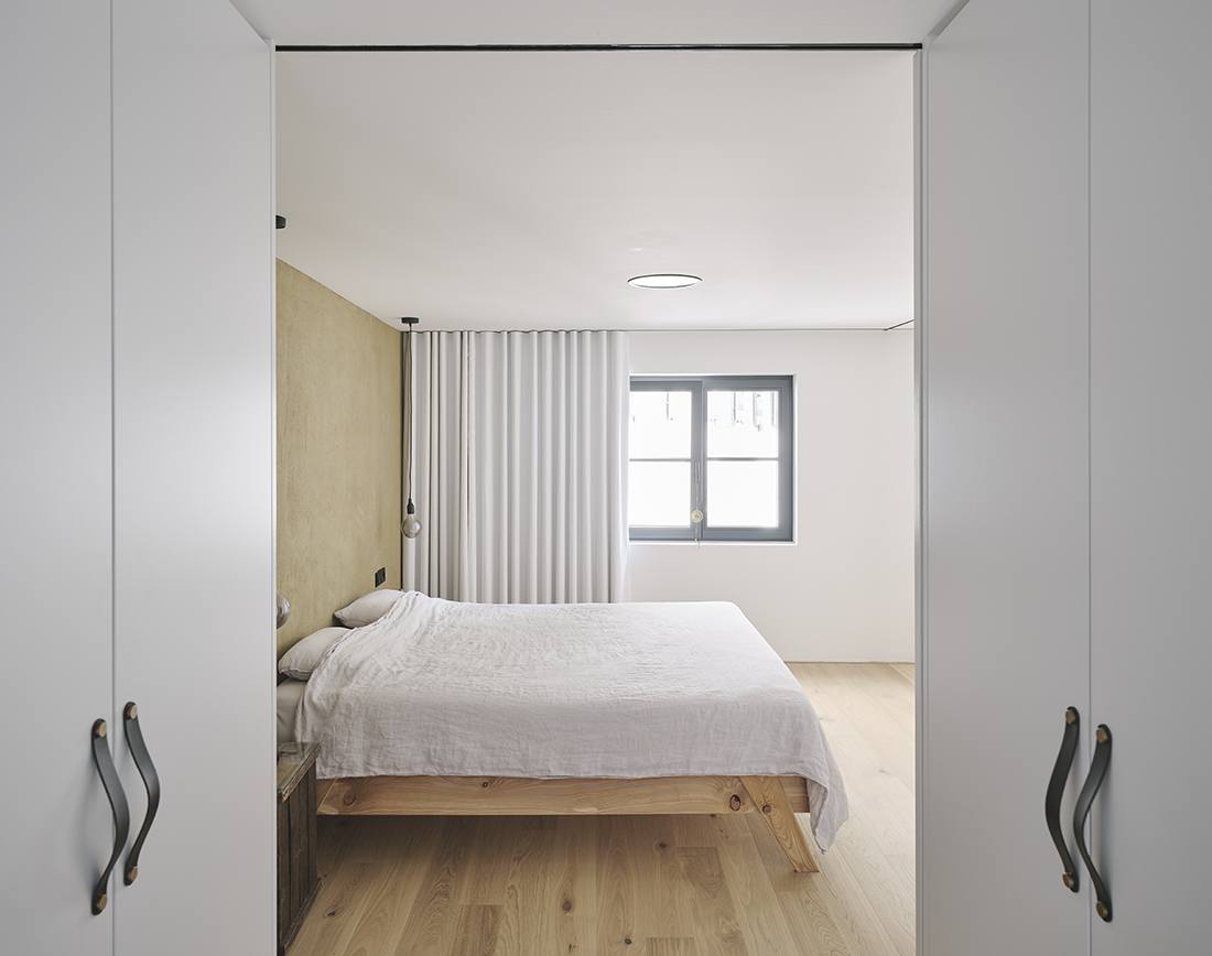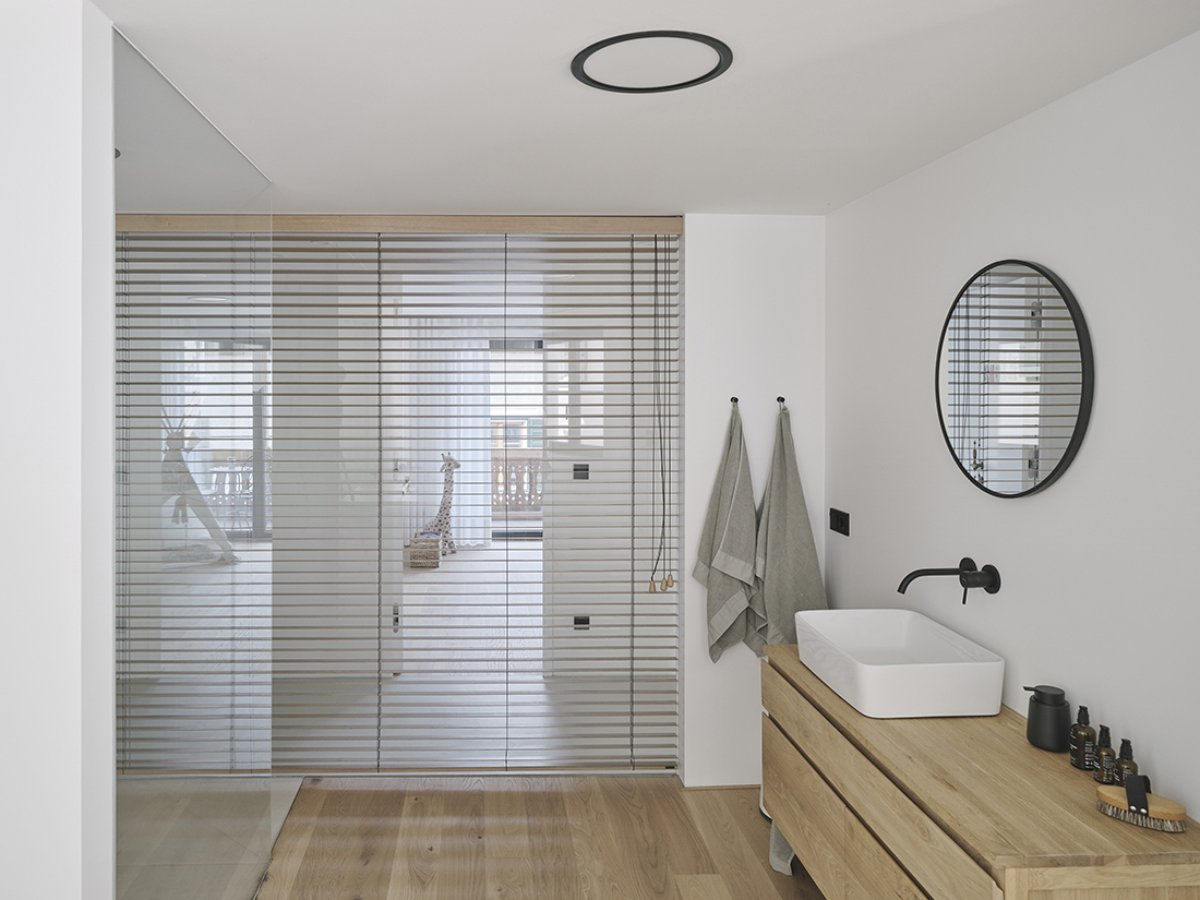 From the entrance in the picturesque ground-floor zone of the neighborhood to the rooftop terrace, views of the historic town center are framed through variations of a continuous wooden furniture element. Great emphasis was placed on preserving historical architectural features while carefully identifying, restoring, and thoughtfully complementing materials and surface finishes using traditional techniques.