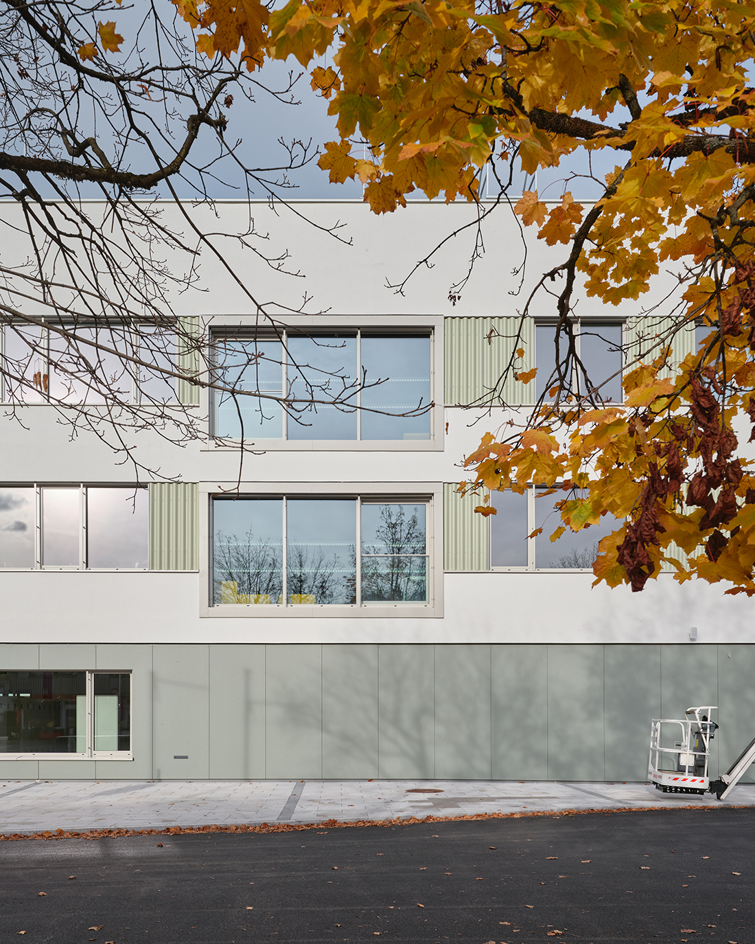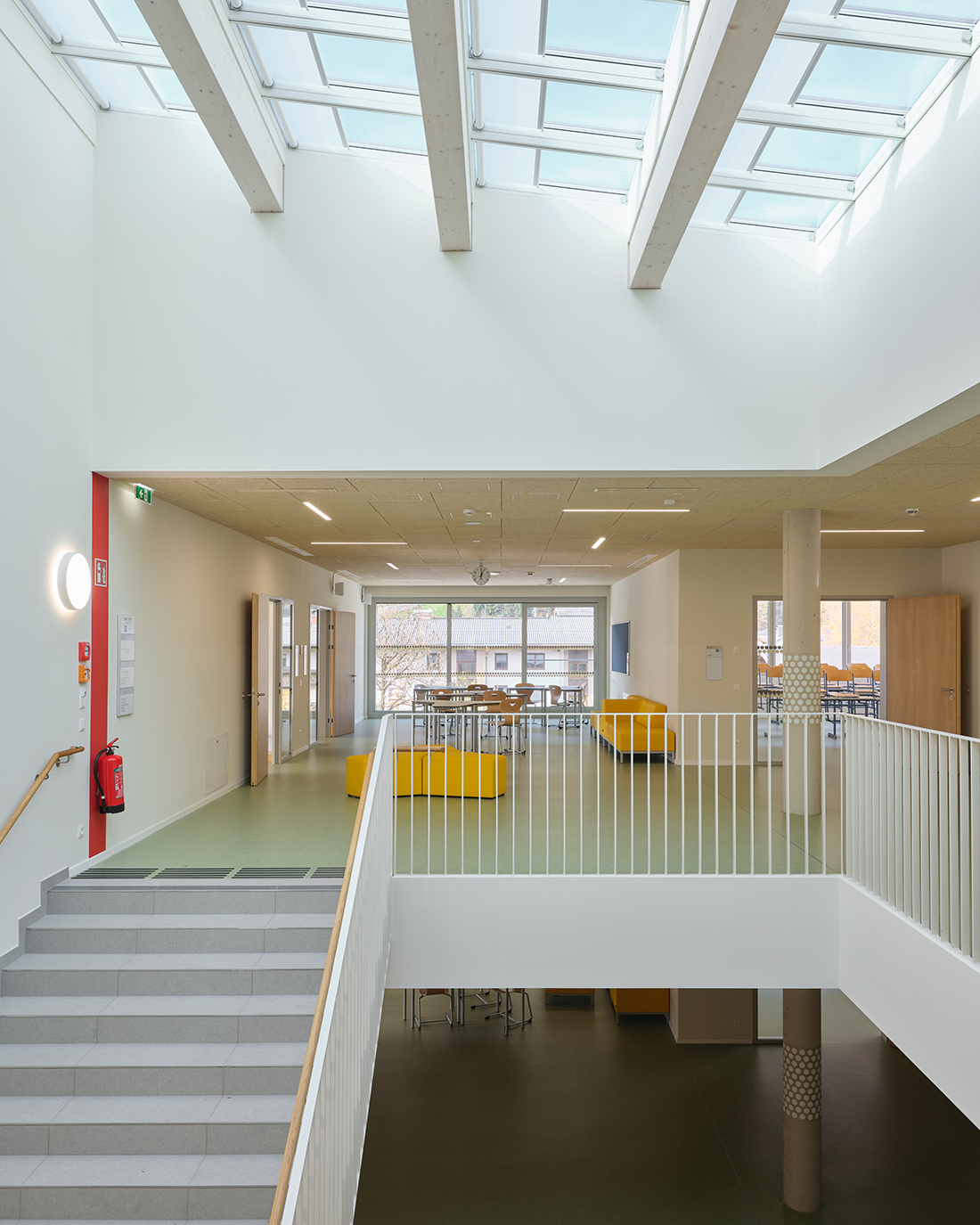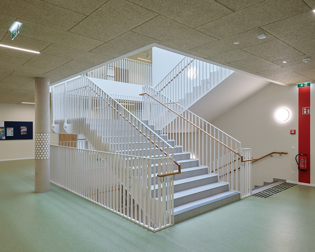 A shared, covered entrance plaza serves as the central arrival area. The renovated east wing connects both schools and houses shared facilities, such as a cafeteria, library, multipurpose hall, administration and IT rooms, creating a campus that promotes synergy and modern education. Sustainability is a key focus, with photovoltaic systems exceeding 200 kWp supplying a large share of on-site energy demand, supported by efficient ventilation, environmentally friendly materials, and high-quality cycling infrastructure.