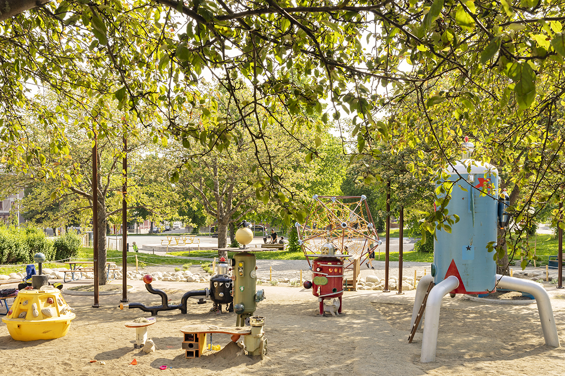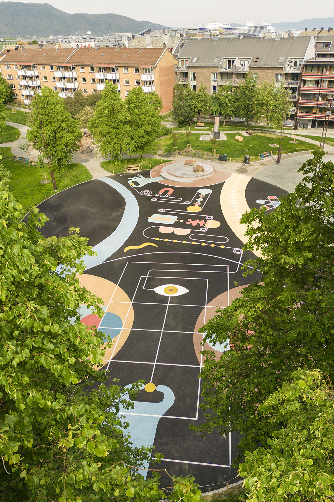 Buranbanen Activity Park is inspired by the industrial character and working-class history of the Buran neighborhood. The color use, play structures, and art expressions give the place a rough and industrial feel. Buranbanen Activity Park even has its own unique play element: “The Matchless Manik”, a fabulous factory machine built from various reclaimed parts.