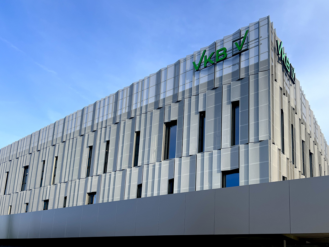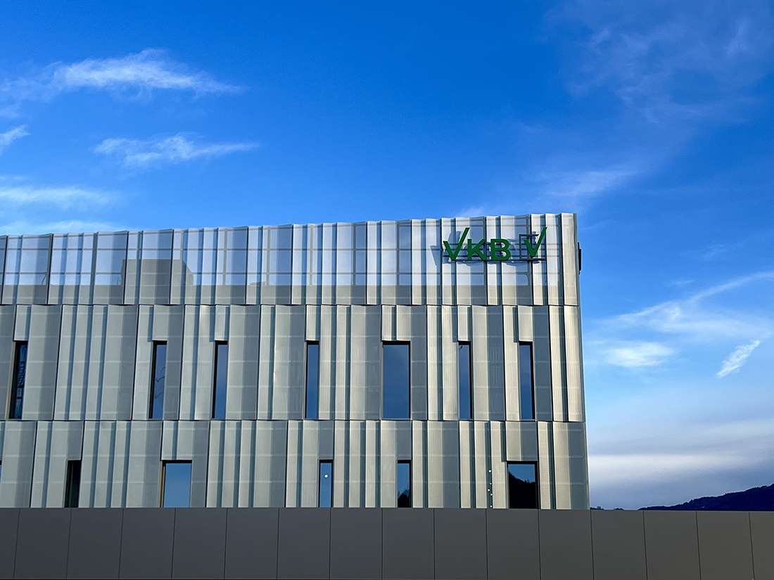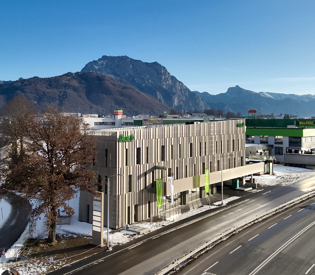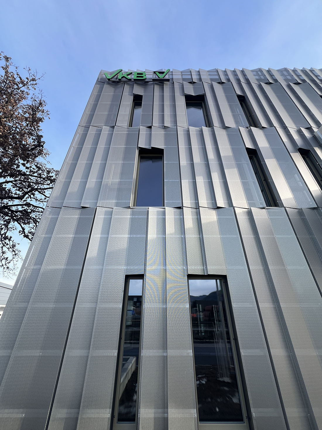 Business Level – New Business Center in Gmunden. The building is defined by a dynamically rising façade and a striking bronze perforated metal cladding that gives it a distinctive identity. It offers five flexible office units across three floors, arranged around a landscaped atrium.
