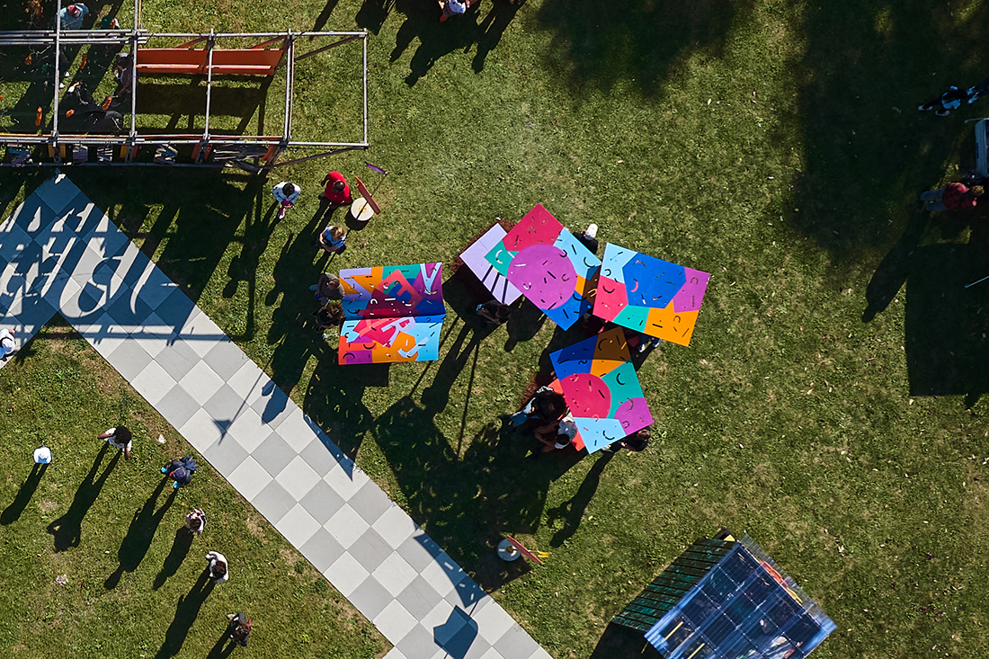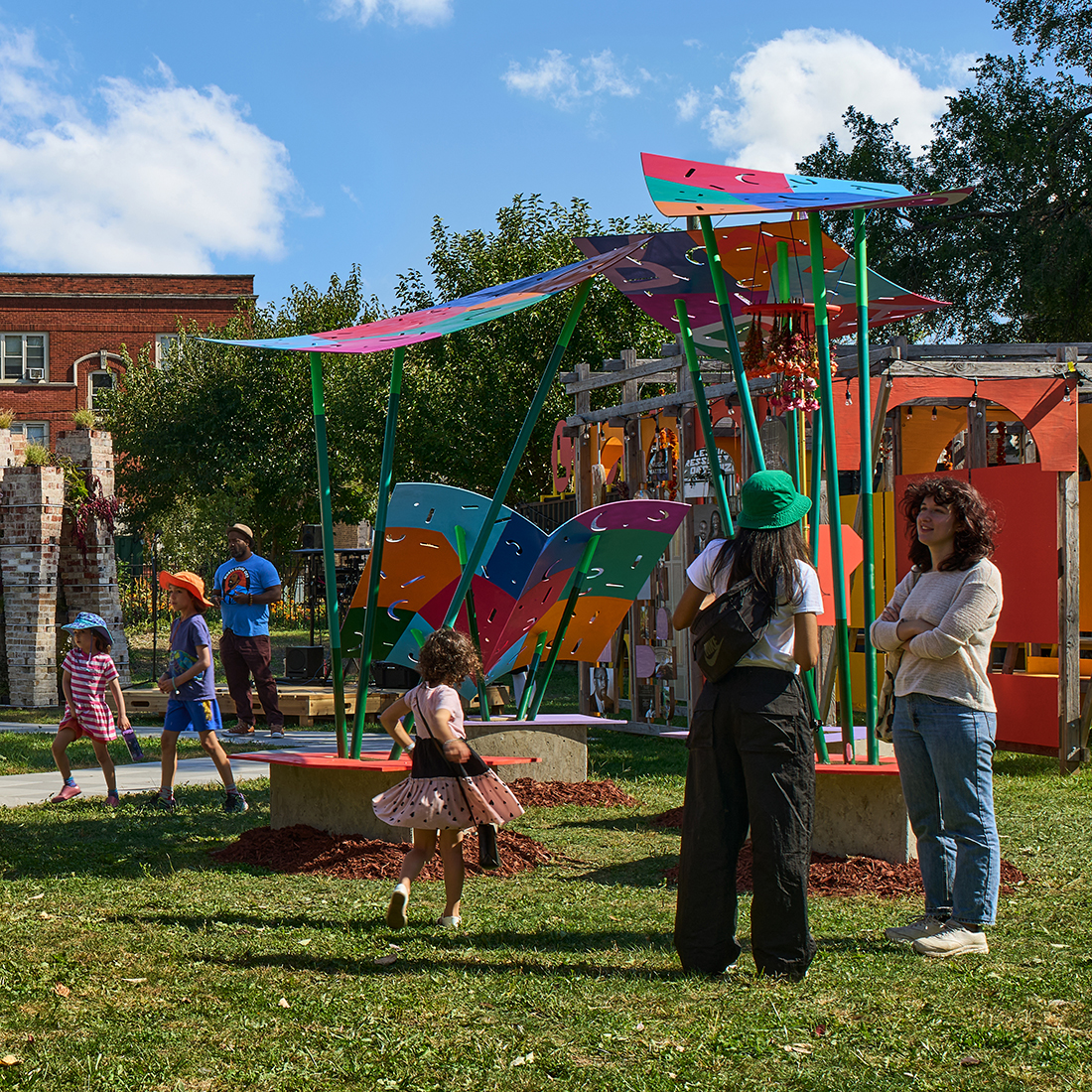 Hidden in the colorful patterns and in the shadows the cutouts cast on the ground on sunny days are letters that can be rearranged to follow one’s imagination. The pavilion was the final piece of a series of landscape-focused interventions on the site, including a passive stormwater management landscape funded by the Chicago Resilient Corridors project and a Playful Learning Landscape installation focused on nature, water, word play, and conservation sponsored by the Chicago Children’s museum. Together, these site interventions define and activate a welcoming, purposeful hub for local residents to foster care and connection to each other and to their public spaces.