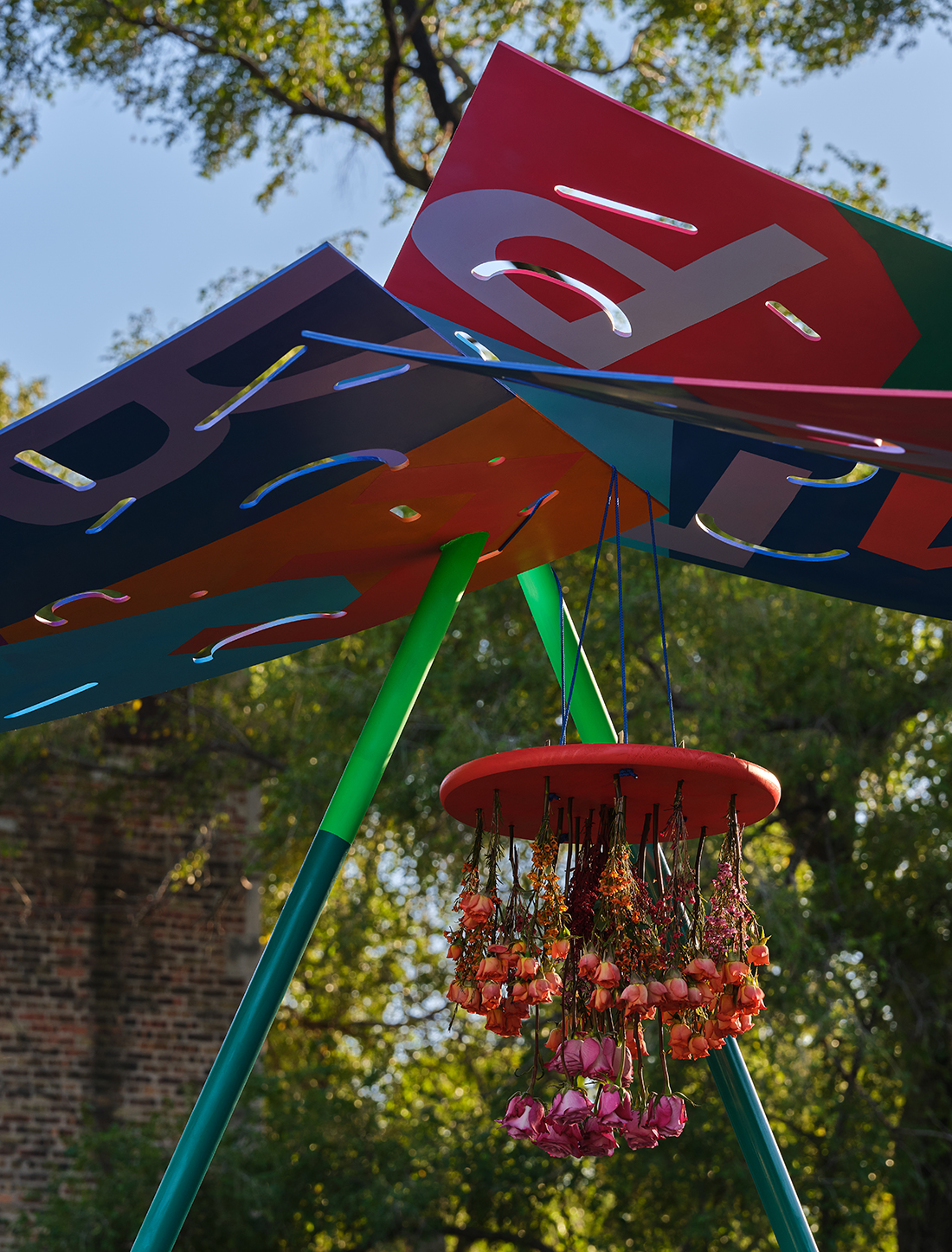 Let’s meet by the book! The “By The Book” pavilion is a haven, an inspiration, a playscape, and a landmark for Chicago’s North Lawndale neighborhood, its children, and their caregivers. By evoking weightlessness – book pages floating in midair – the pavilion design embodies the idea that reading can happen anywhere, at any time, transporting the reader to other worlds. Fabricated out of aluminum, the four-part installation moves with the wind and responds to the bodies that might rest against its stalks.