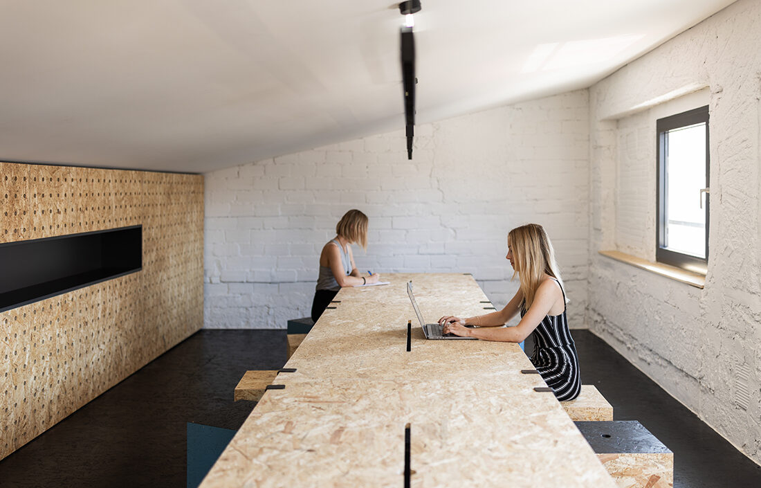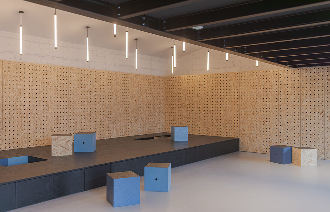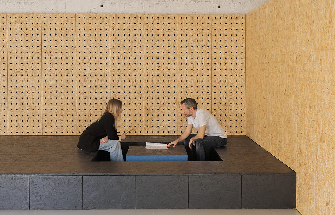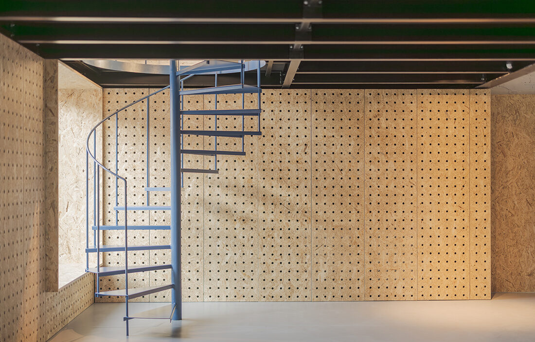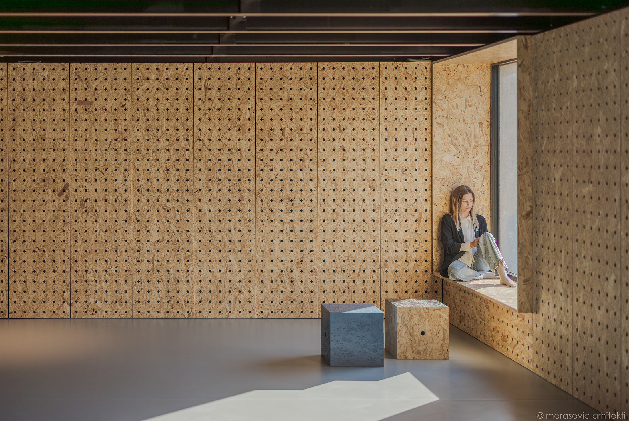 The existing single-pitch volume was reinterpreted with the insertion of a raised platform, creating additional office space. The info point and sanitary core were organized into compact volumes – modest “extensions” that integrate subtly with the main structure and complement the primary program. To achieve spatial clarity, functional adaptability, and meet budget constraints, all installations were executed as surface-mounted systems. These are concealed behind custom-built cabinetry and wood cladding, which act both as storage and a visual backdrop. OSB panels define the material language of the space, partially accentuated with colors drawn from the club’s visual identity.