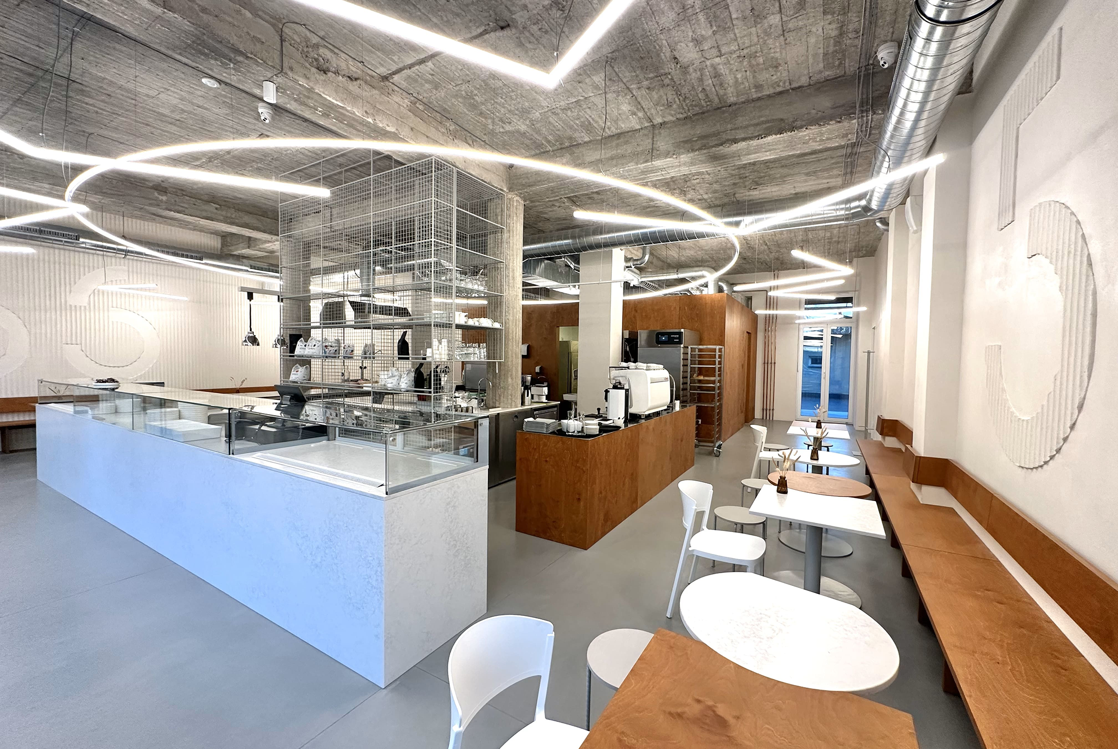 Thanks to the sensitivity of the owners and the chef of the future operation, we managed to push through a proposal that exposes the interior of the building in the truth of materials and structures, and whose main goal is to create a scene for what will play the main role – and that is bakery products and coffee. This leitmotif was written in all our steps. The color scheme of the entire interior is the color of flour, off-white, gray, and the color of pastries – brown (sampling was really done with a yeast bread oven, for whose crust we used wooden plywood).