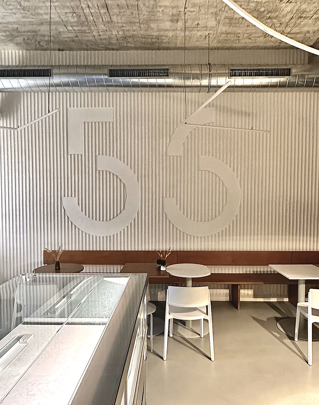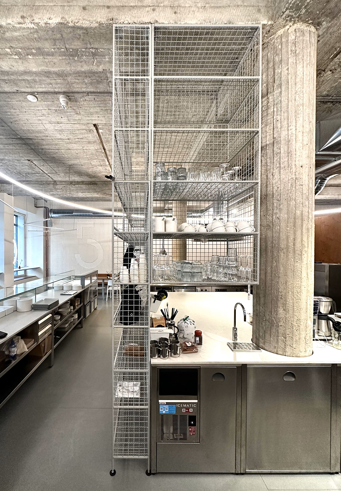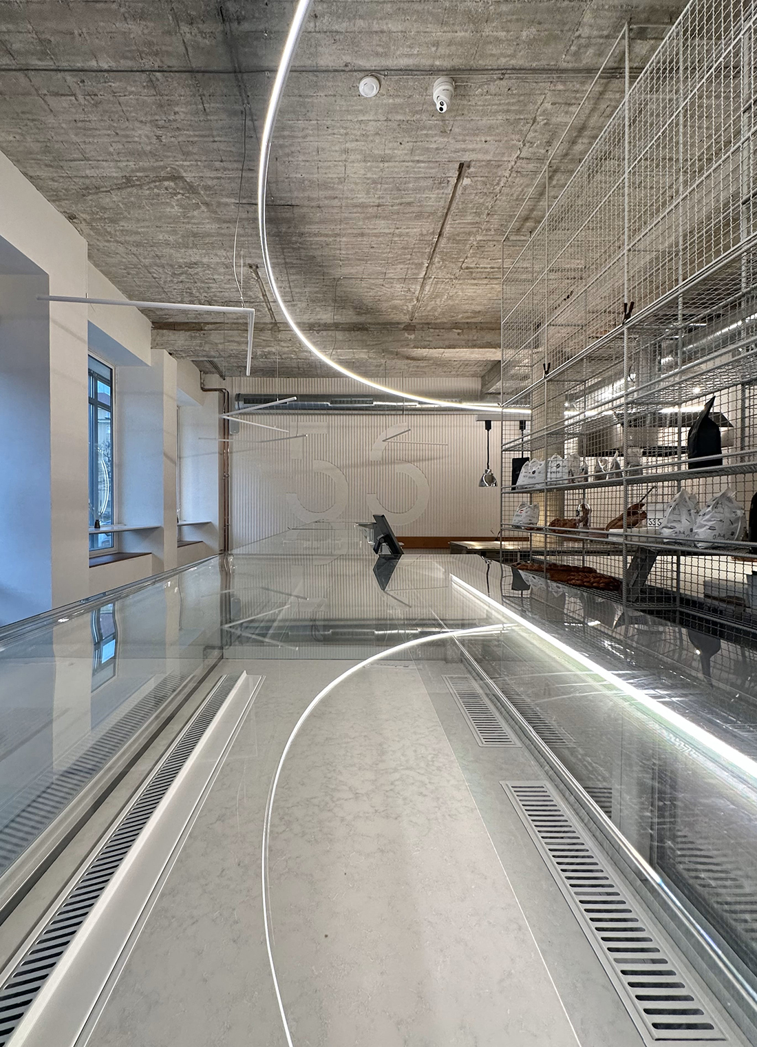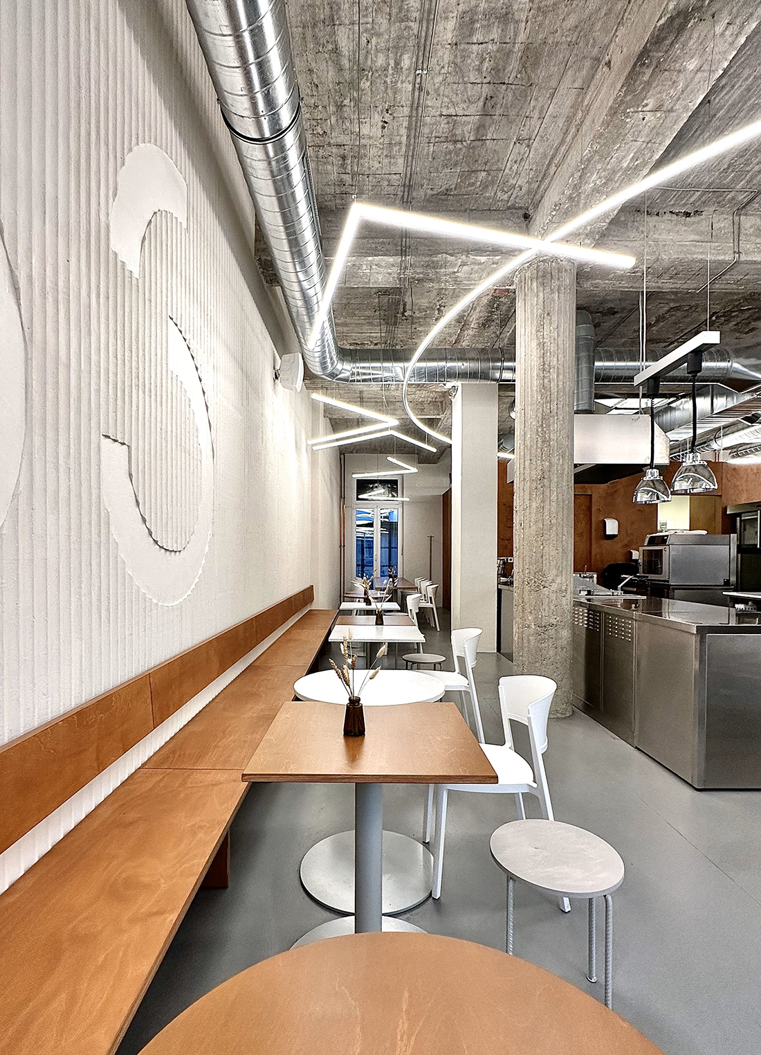 We first saw the space with the backdrop of a former nightclub, and even then, it was clear that we needed to get back to the original structures, original surfaces, and original heights. When we did, it was confirmed to us that the scale of the space is generous, as are the windows that connect the space with the street, and everything is crowned by the height of the original concrete ceiling.