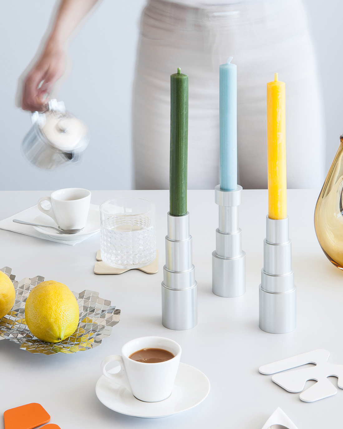 This candle holder set is crafted from recycled aluminium in collaboration with a local manufacturer in Škofja Loka, Slovenia. Each piece is shaped from a solid metal rod, giving it both substantial weight and a robust presence.