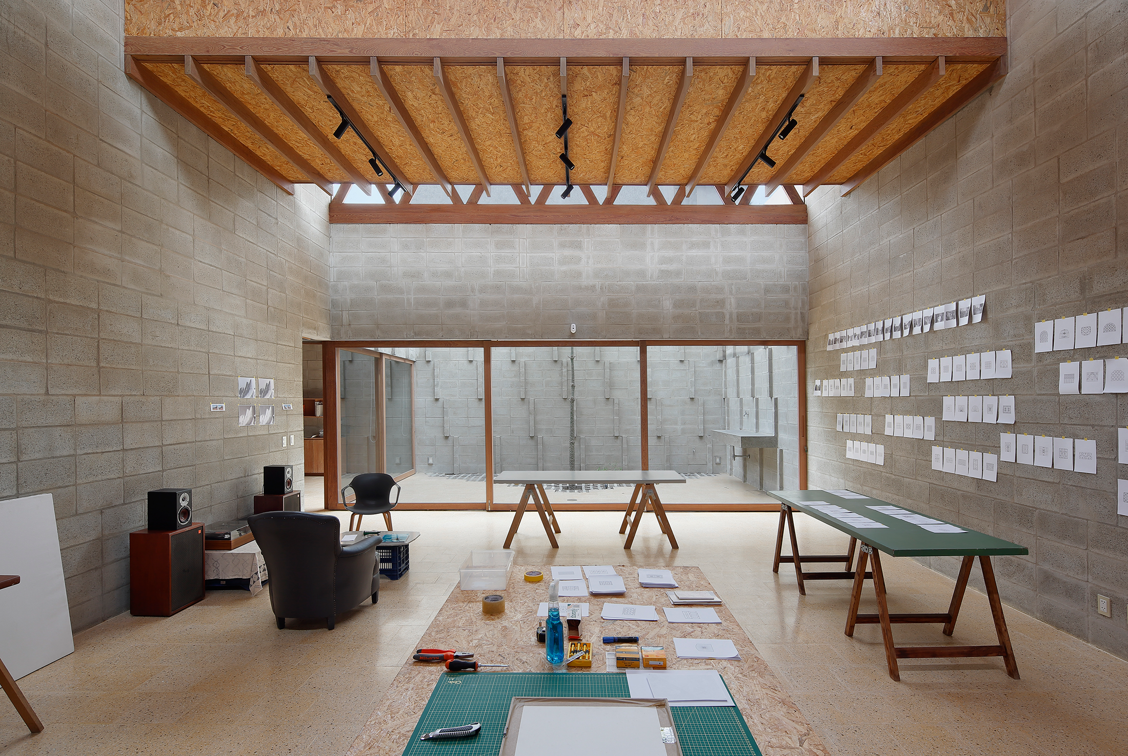 The project in Barranco, Lima, occupies a compact urban lot, and is conceived as a flexible photographer’s studio that can easily adapt into an exhibition space. A front courtyard with planters leads to a