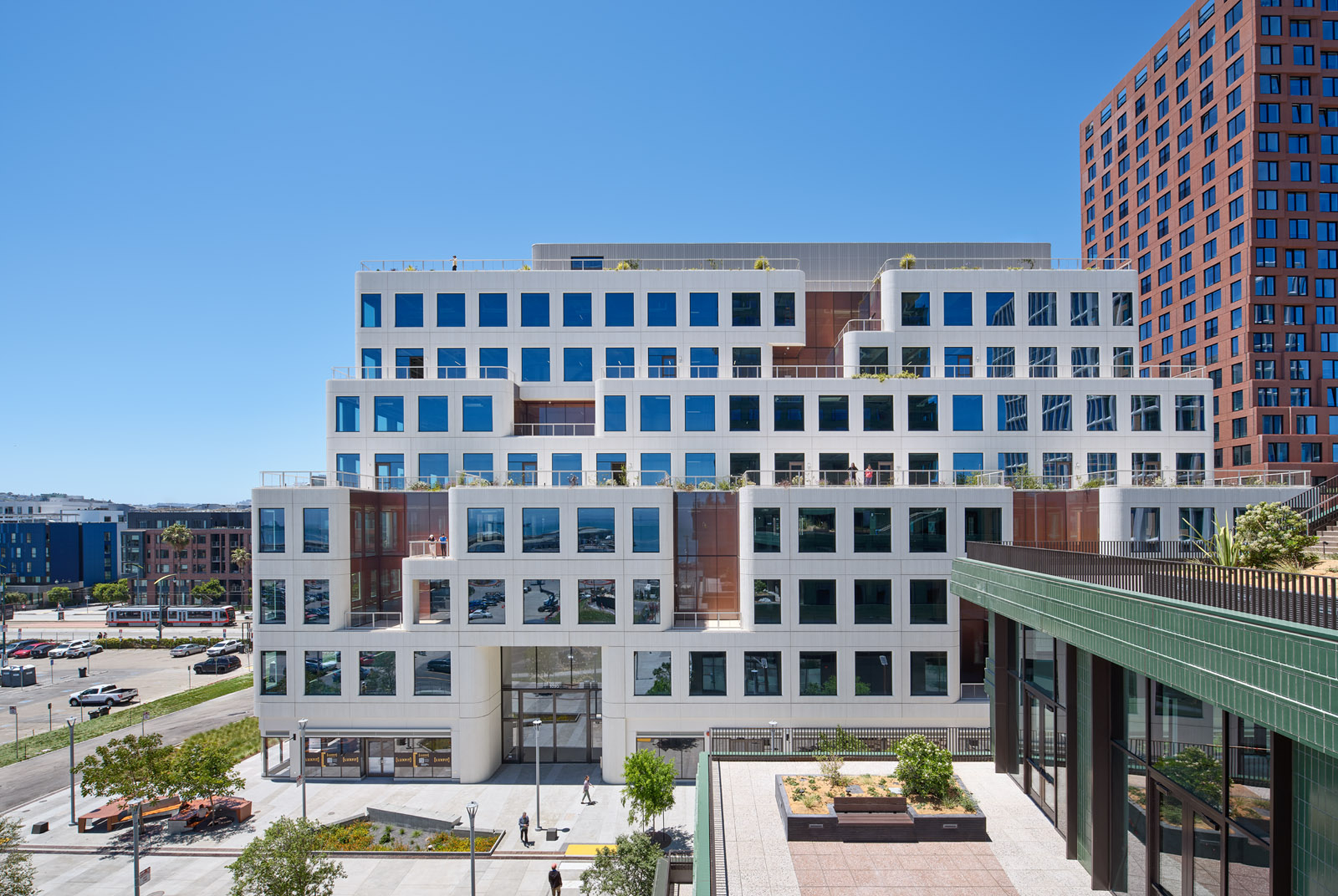 Mission Rock Building B reimagines the future of the workplace by fostering a seamless connection between interior and exterior spaces. Its eight stories feature cascading, carved-out gardens that serve as dynamic workspaces and outdoor