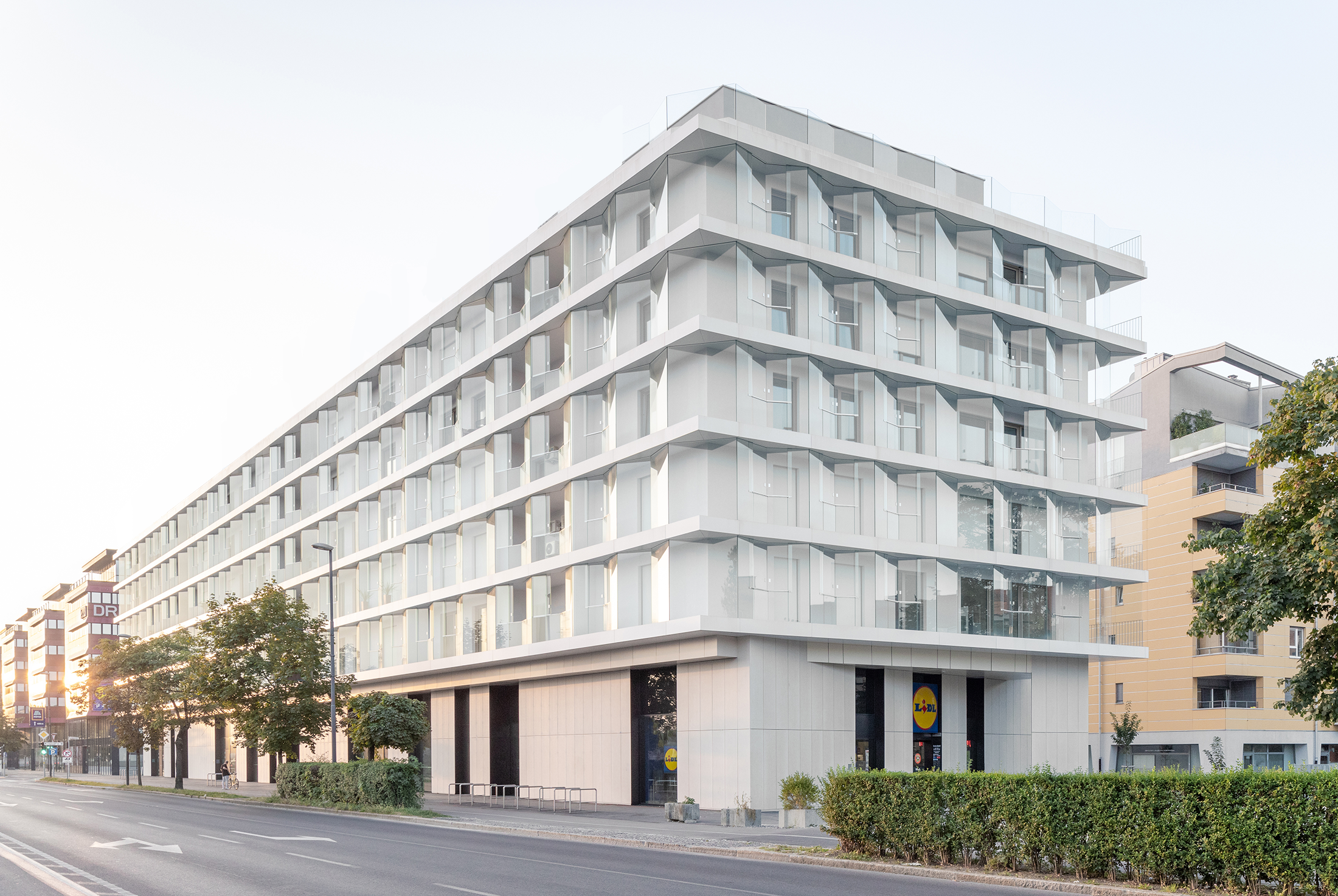 The Campus F.03 building, located in Aveiro, has 23 residential units and a commercial space. The proposal was developed with a focus on the street frontage, taking into account the established urban fabric of