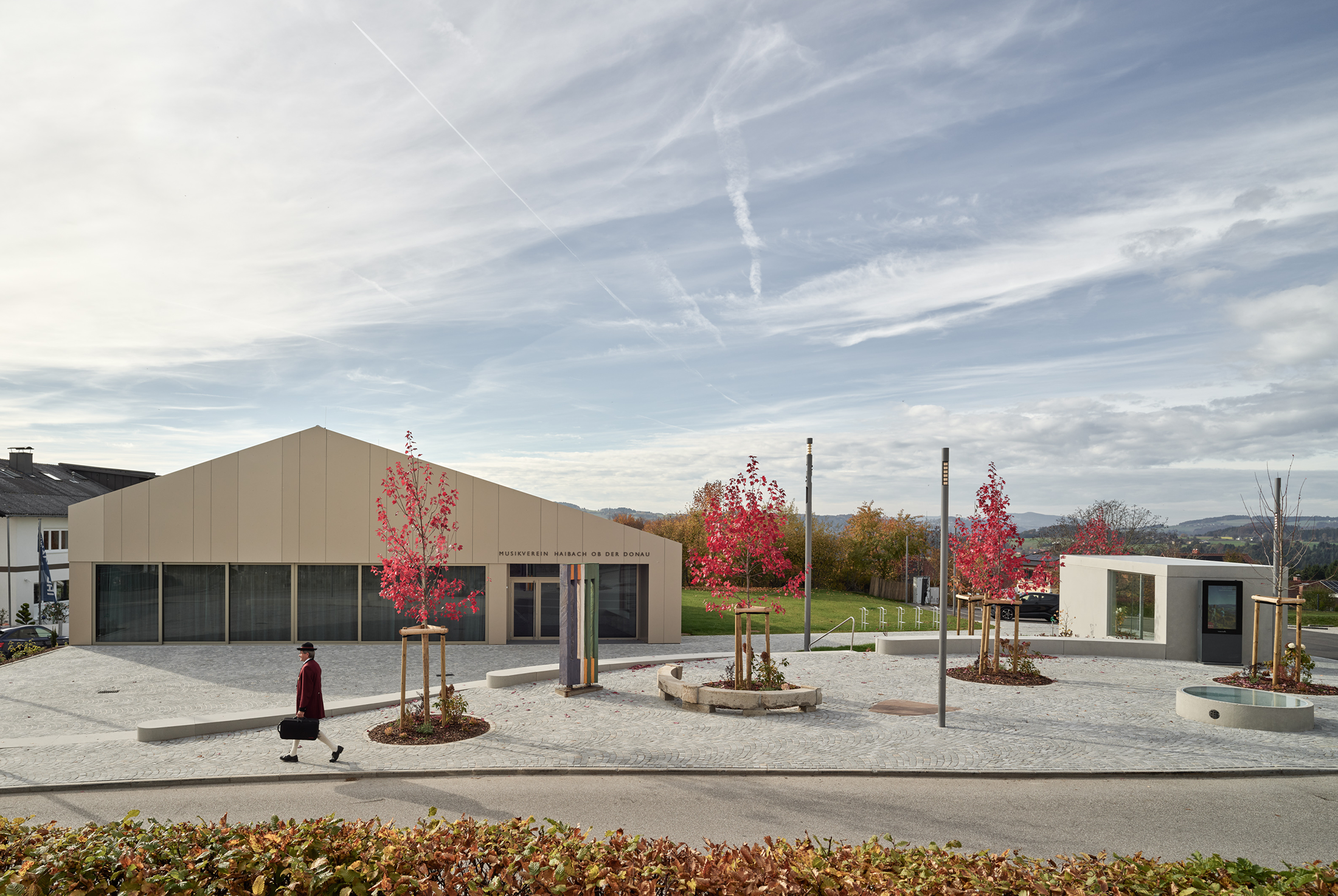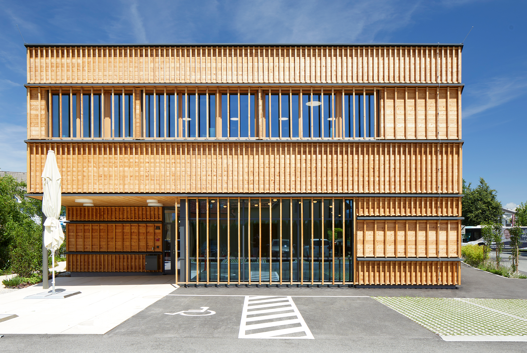 The branch of Kärntner Sparkasse stands prominently along the northern property boundary on Pischeldorfer Str. Clearly visible from both directions of traffic, the building opens up at the corner of the site. The access