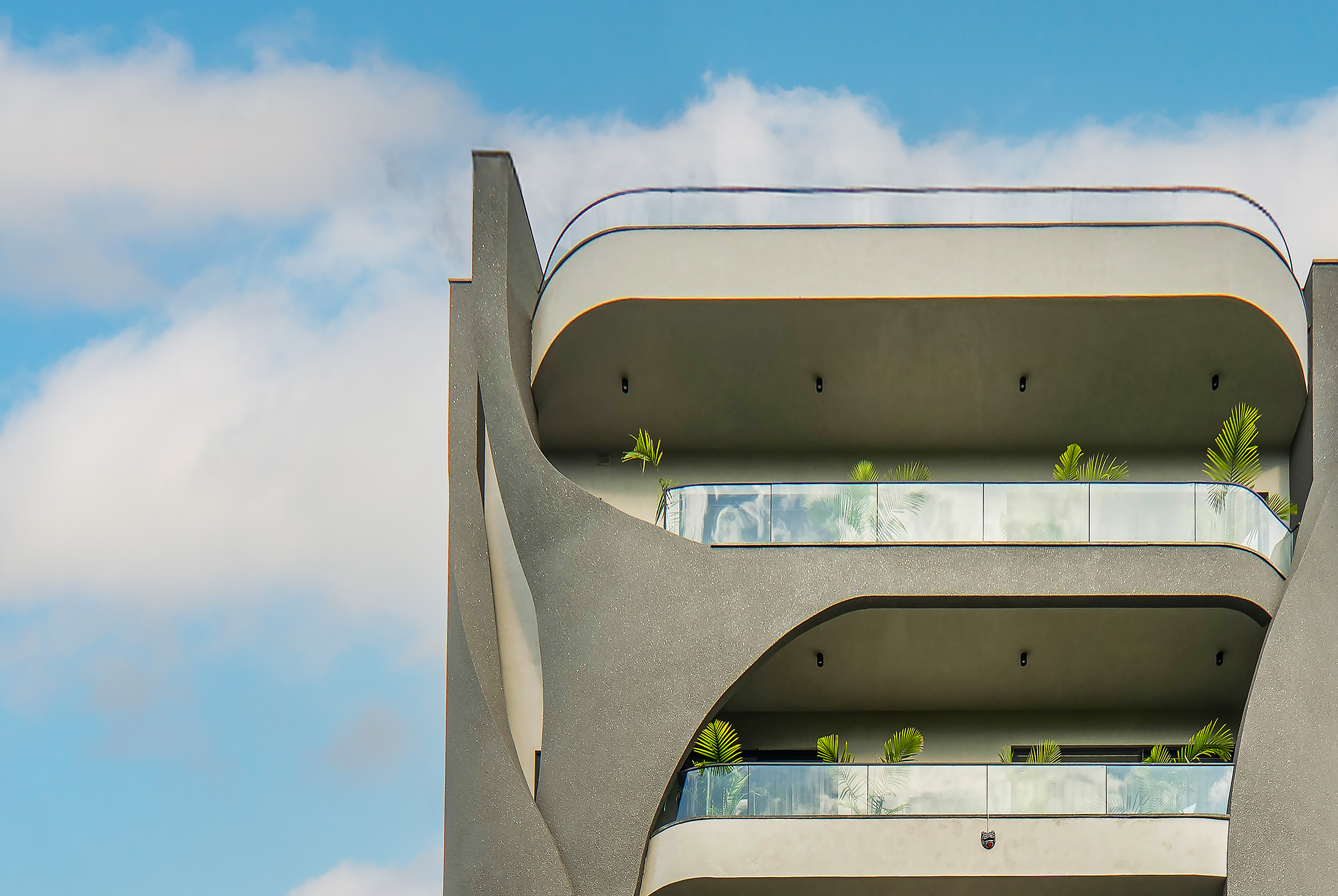 ASRO Arcade explores a dialogue between fluid architectural forms and precise geometric alignment. The project features multiple facades, each uniquely shaped, yet unified through rhythm and proportion. Concrete curves, aluminum fins, and glass planes