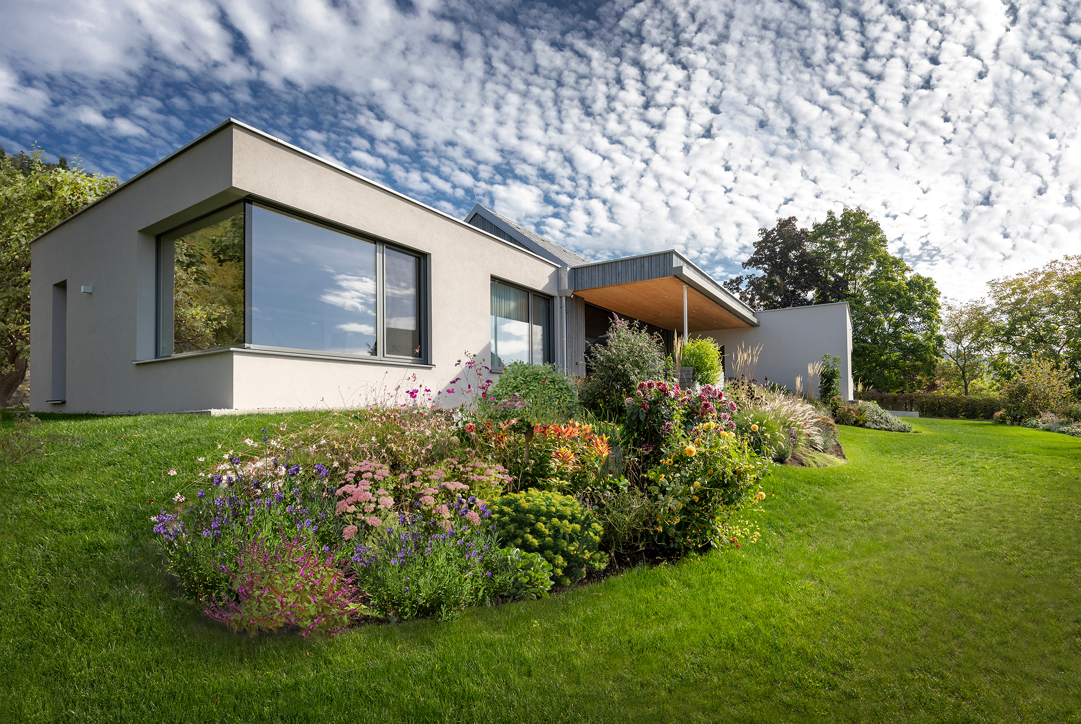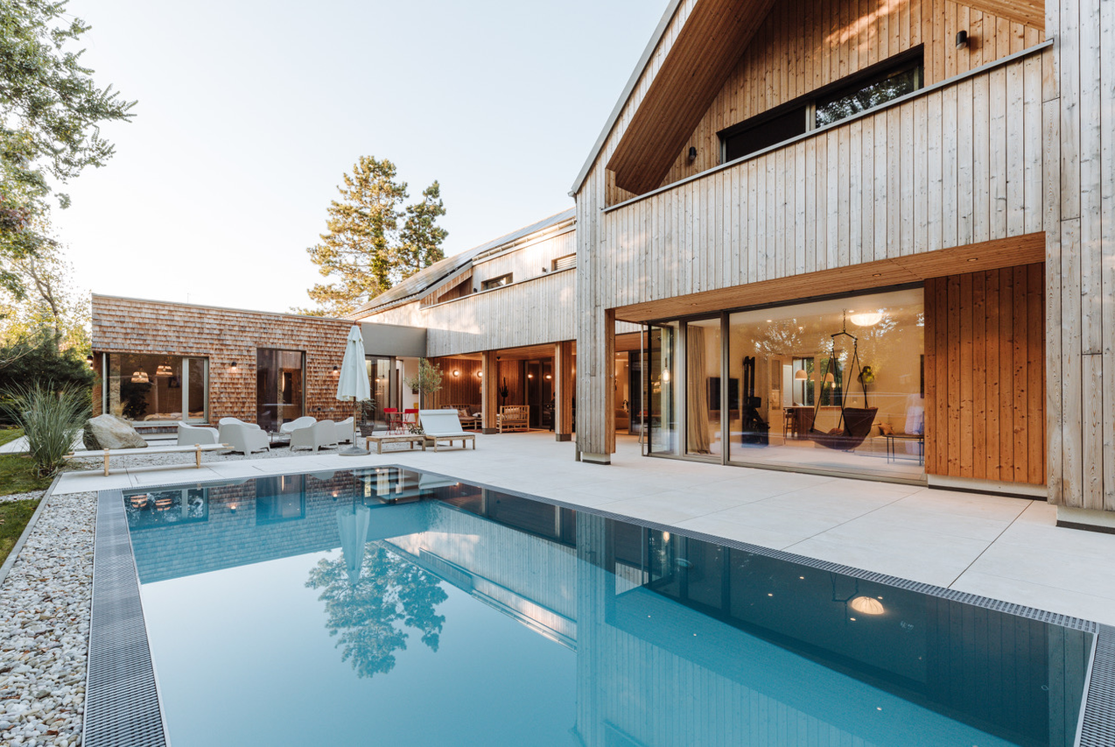 Consistently planned as mono-material and fully demountable: The single-family house is based on a timber load-bearing structure with timber–clay hybrid elements, solid timber slab floors, and beam ceilings. The external walls are insulated with