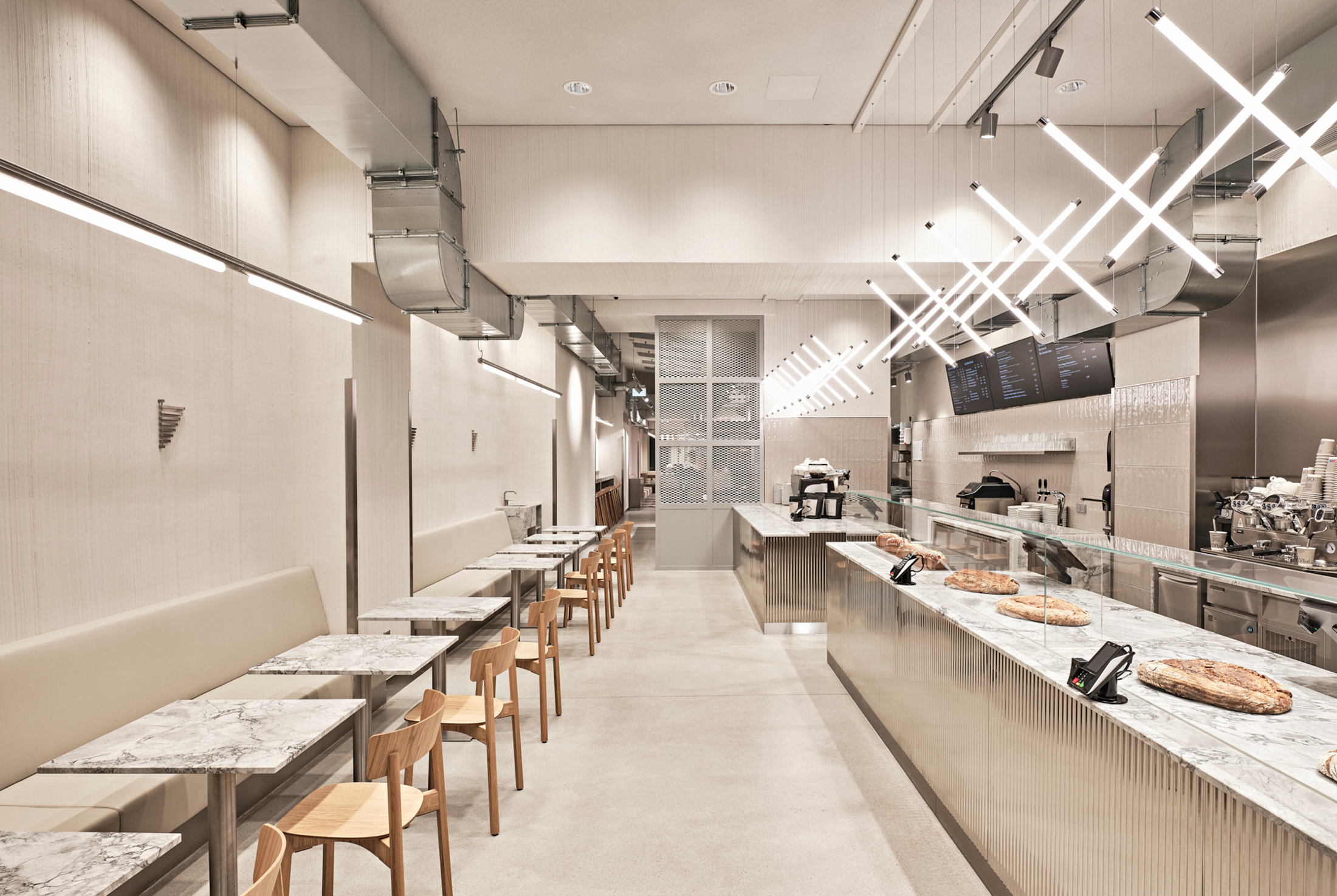 The Öfferl Flagship Store at Mariahilfer Straße 9 is a contemporary bakery café reflecting Vienna's dynamic 6th district. The design transforms the space into a semi-public area, encouraging guests to linger and observe the