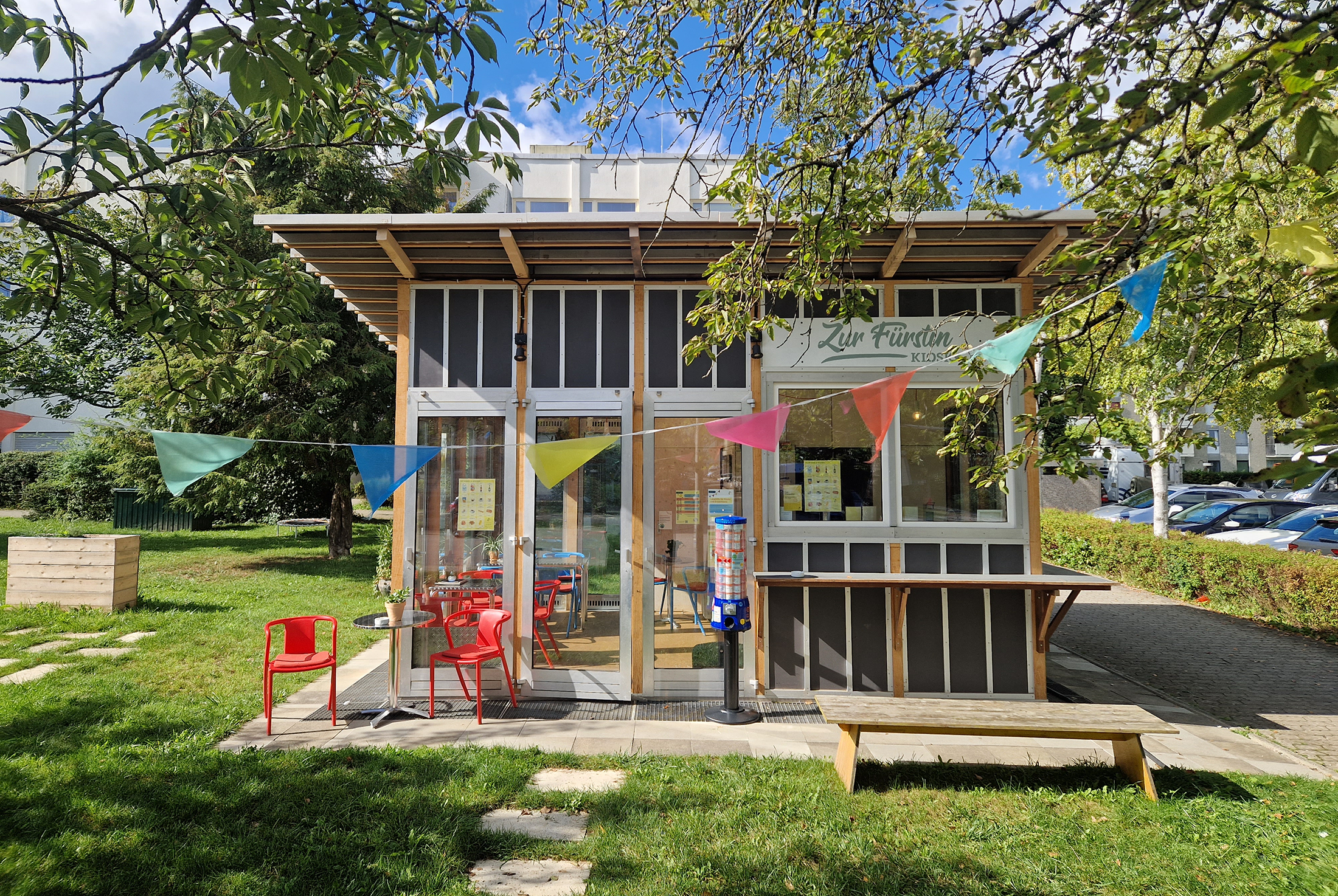 A kiosk as a pilot project for the Building Transition: The small pavilion was built as locally as possible, using reused materials sourced from nearby construction sites and a 1970s residential building scheduled for
