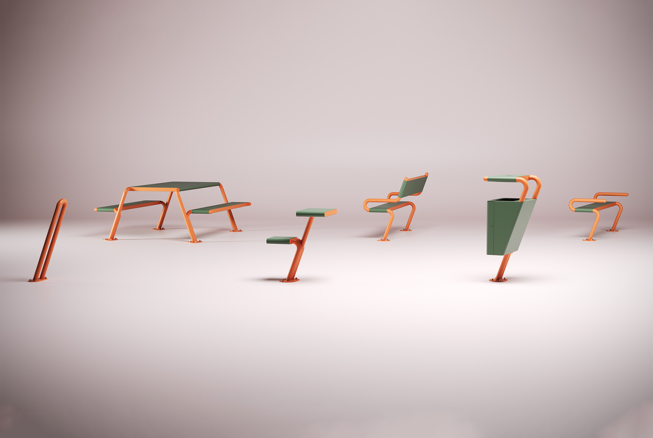Moonwalk is an urban furniture collection designed by Madelu Design studio. Composed of six elements: a bench with and without backrest, a table with integrated seating, a single-seat table, a bicycle rack, and a