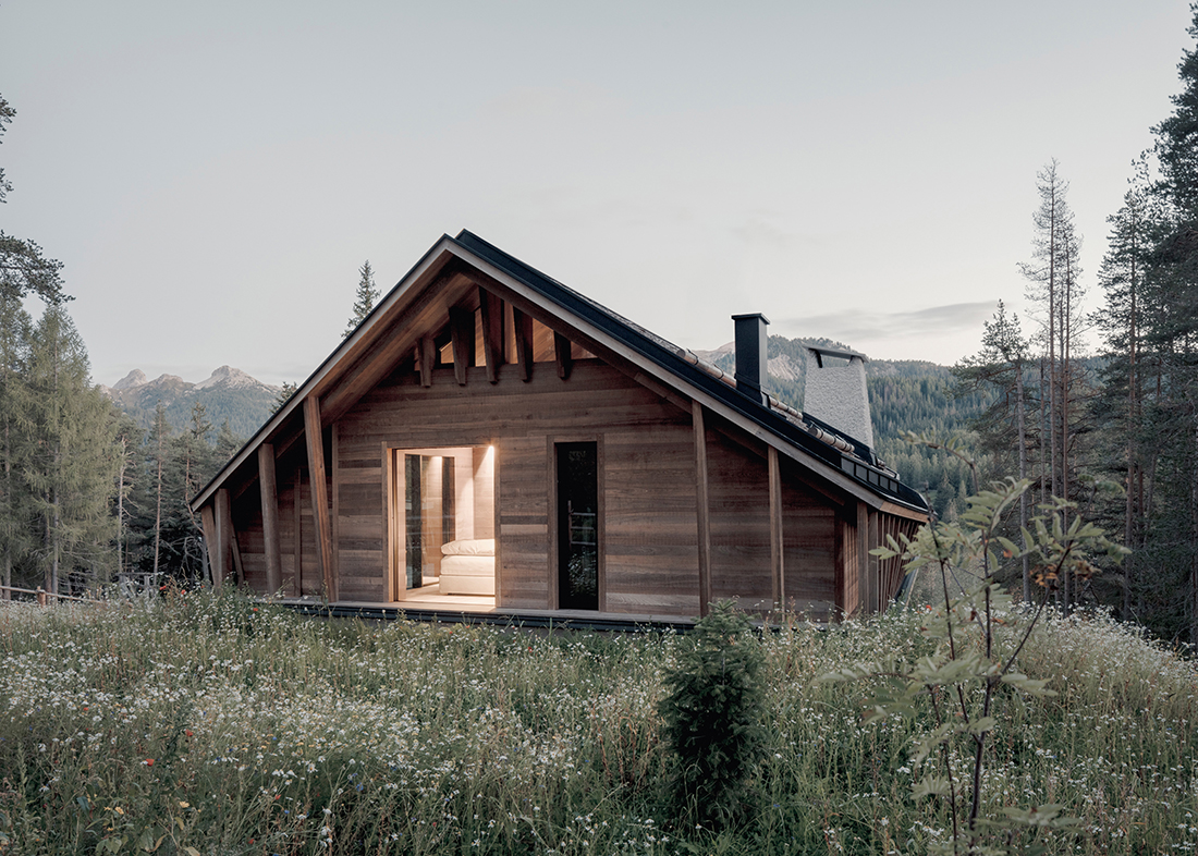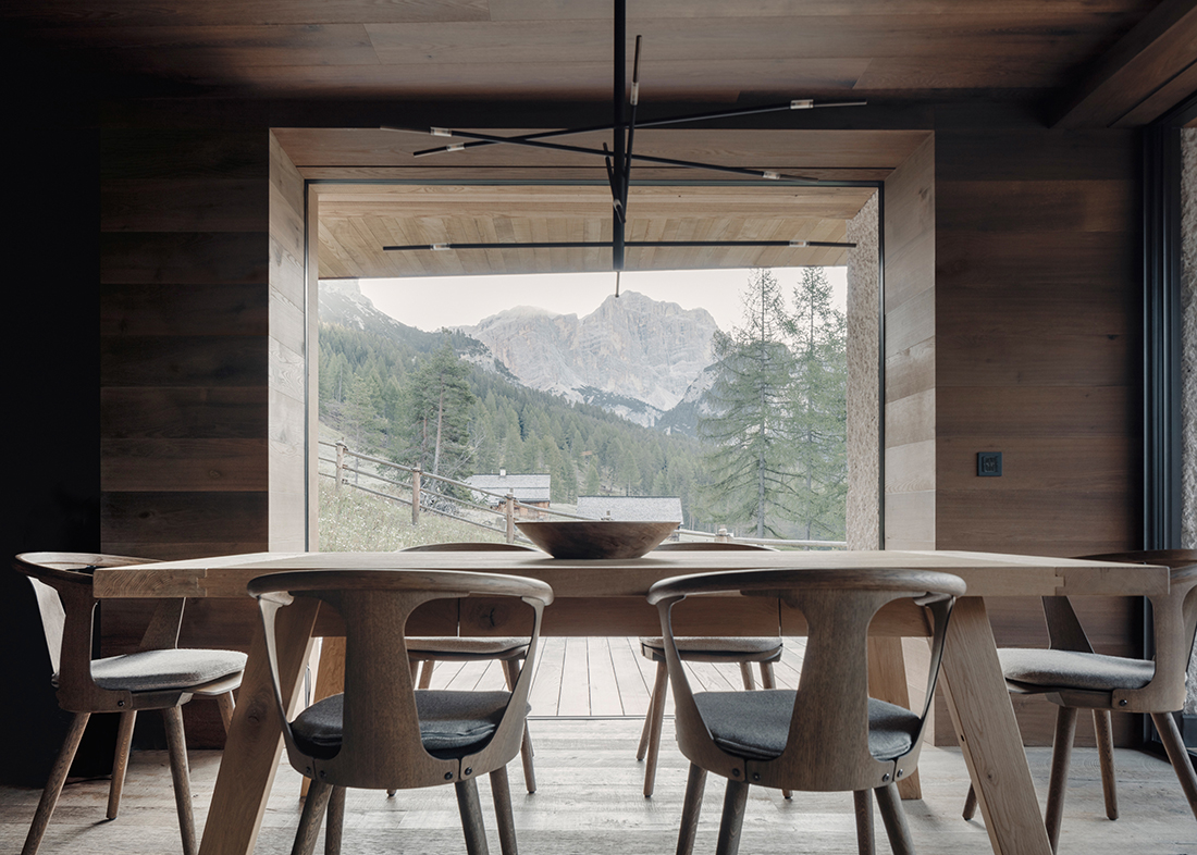 House Conturines boasts a picturesque setting at the forest’s edge, offering stunning views of the Dolomites. Its design embraces local tradition: a solid, partly embedded ground floor supports an overhanging, timber-framed upper level with a pitched roof, blending the building into the Alpine landscape. Façades and roof reinterpret regional heritage in a contemporary language.