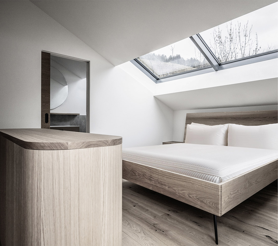 50% simplicity & 50% sophistication: Cësa La Raida is born from the transformation of a previous residential structure. Replacing the former building, this newly reconstructed intimate edifice exudes a sense of timeless elegance with its clean straight lines intersecting a palette of pristine whites and accents of rich, dark wood. The entrance on the ground floor, housing two holiday flats and a main flat on the upper floor and attic, is framed by minimalist landscaping and showcases doors crafted from the warmth of larch wood, paying homage to the building’s history while embracing its contemporary vision.