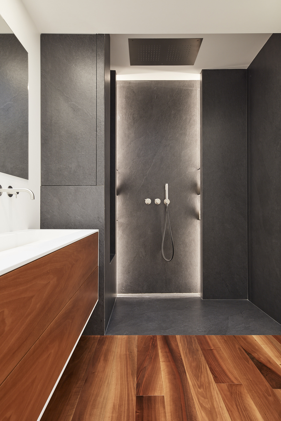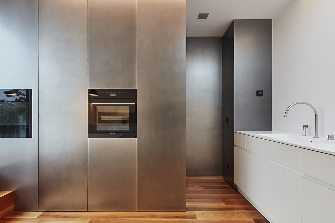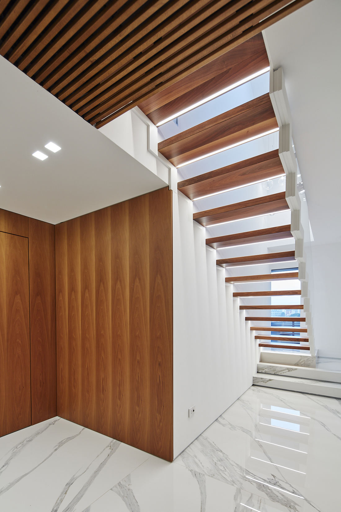 CFP House is the renovation of a two-level penthouse with views over the City of Udine and the Italian Alps. The entrance, wrapped in refined walnut paneling, conceals the elevator and access to the sleeping area. Calacatta marble dialogues with wood and envelops the sculptural staircase, which becomes lighter as it rises. On the upper floor, the living area, beneath a vaulted ceiling, opens onto the terrace, while concealing the other rooms. The entire project plays with the concept of concealing spaces, guiding visitors on a journey of discovery.