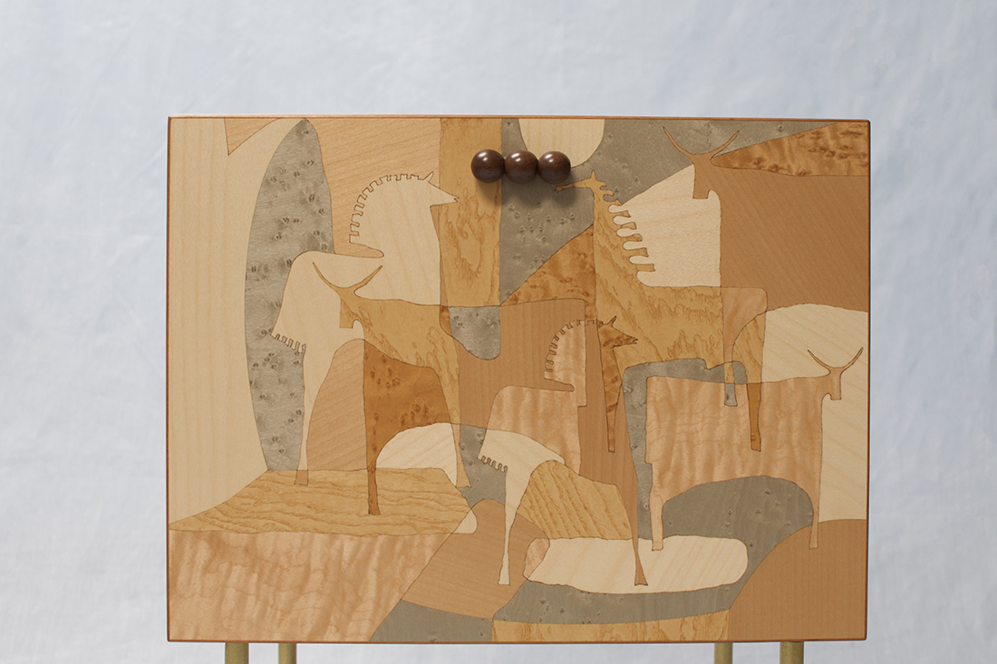 The nightstand features the brand’s trademark wood marquetry surface, complemented by turned wooden paws, offering the viewer a precise and detailed finish. This radiates a warmth that is endearing at first sight. Eszter Kunos, the designer of the pattern, was inspired by the beauty and elegance of mid-century bronze animal statues. The result is a perfect harmony of traditional craftsmanship and modern technology.
