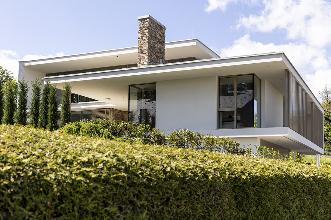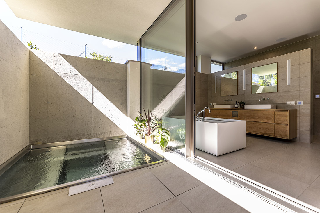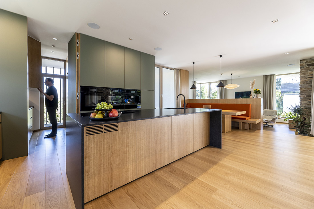 The villa is equipped with a photovoltaic system providing electricity for the building and e-cars, and a deep bore heat pump for heating and cooling via ceilings and floors. All built-in furniture was designed by our office and made by a carpenter. Lighting is from XAL, chairs and lights mostly from VITRA, sliding elements and glazing partly from SKYFRAME and partly wood-aluminum mullion system from KAPO, and aluminum windows and doors from Slovenia. The whirlpool and stainless steel pool are from Polytherm.