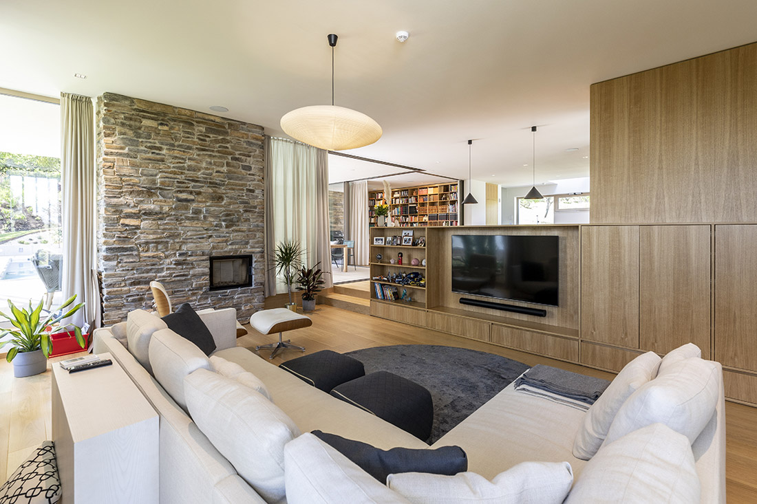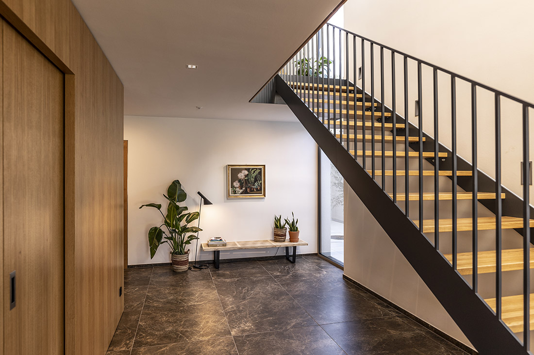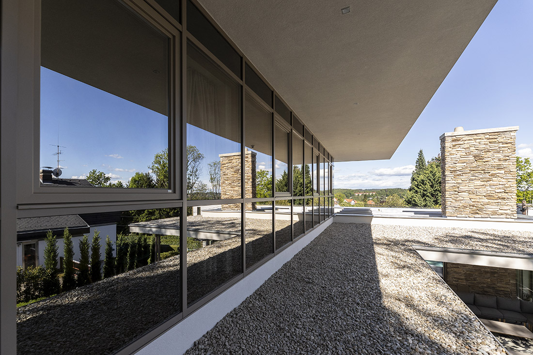 A simple steel staircase with a glass banister leads to the next level, comprising the lounge and master bedroom. A morning balcony facing east invites relaxation, while an intimate spacious terrace with radiant heaters and access to the stainless steel outdoor pool allows seamless indoor-outdoor integration facilitated by fully retractable glazing. The living area, furnished by Minotti and Vitra, is directly accessible via a small height offset. The stove with a viewing window and stone cladding by Geopietra adds warmth, continuing into the exterior. The working area is behind a delicate sliding door by Rimadesio, leading to the master bedroom with private toilet, dressing room, spacious bathroom with access to the stainless steel whirlpool, and bedroom with direct access to the terrace and pool. A single staircase leads to the top floor, where the roof terrace and three children’s rooms, each with its own bathroom and separate toilet, are located. Structural sun protection (cantilevers) prevents summer overheating, with rooms featuring a wooden post-and-beam facade.
