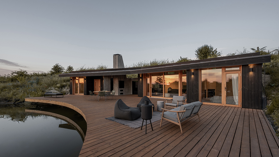 Dug into a mound with a green rooftop, the house becomes part of the horizon. A 135 m² terrace by the water offers breathtaking views of sunrises and sunsets, while the wooden floors enhance the connection with nature. Inside, the main living area comprises a living room, bedroom, sleek kitchen, and minimalist bathroom, with a cozy guest room providing additional privacy.