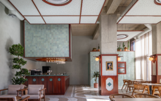 In the floor plan, the bar is centrally placed, inspired by the geometry of a secretaire, with reinterpreted brass handles and a massive green marble top. The back bar frames this perspective through the shelving unit for the alcohol bottles. The shelving is commanding through size, but is dainty, thanks to the materiality of the perforated brass and its delicate process of manufacture. The space is remodeled through mirrors placed on the back bar, creating depth, while the suspended round mirror gives guests a view of themselves in the boudoir atmosphere.