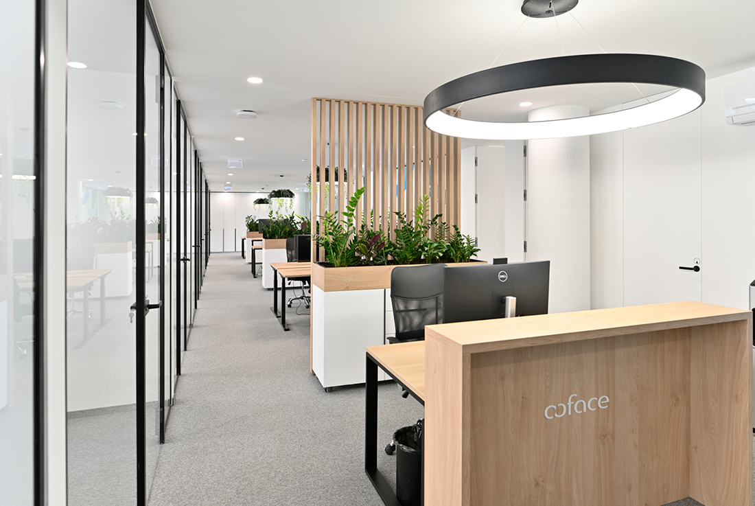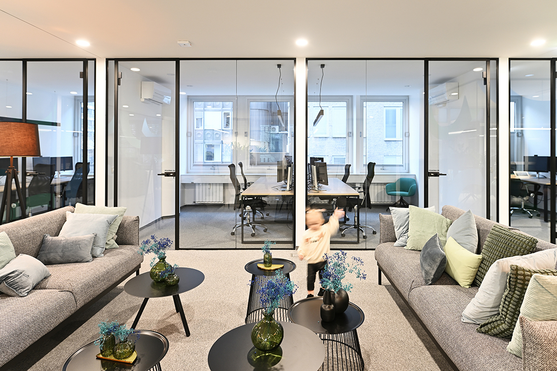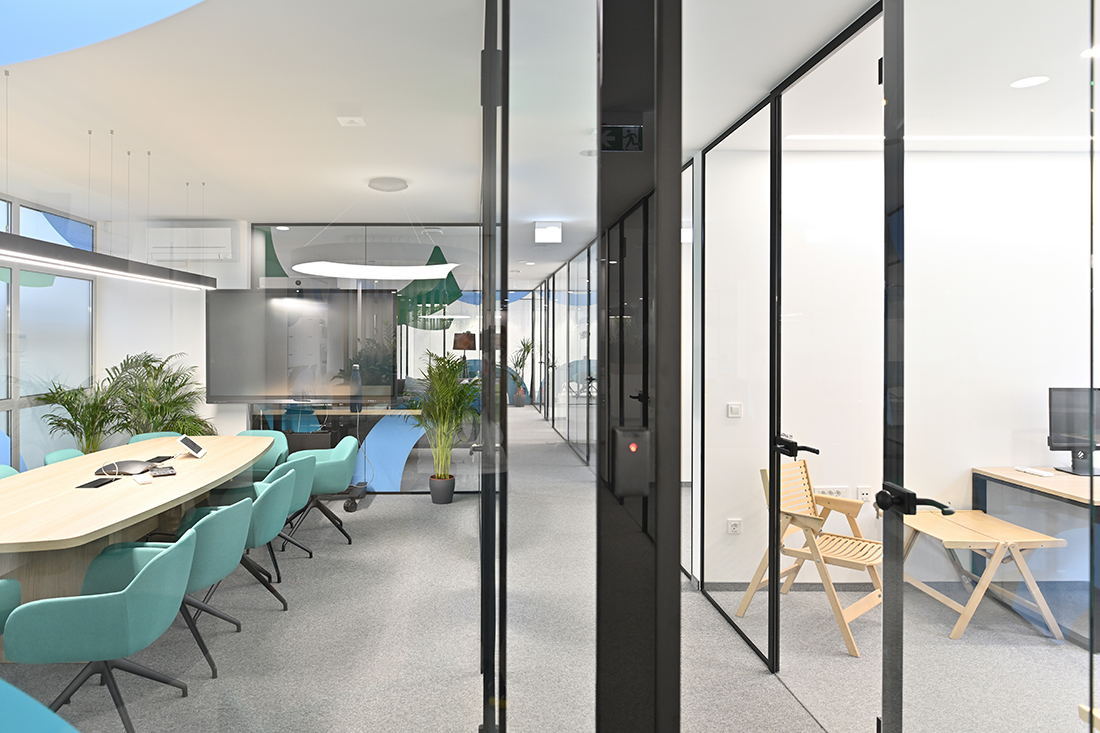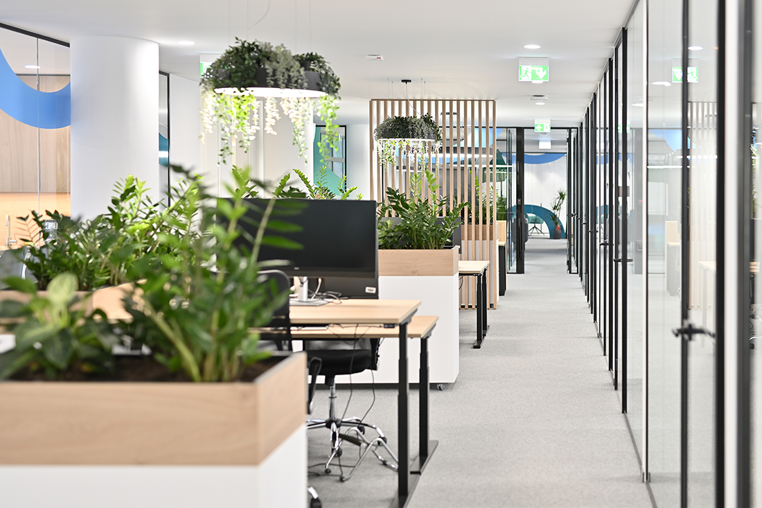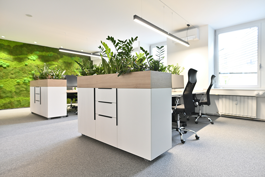A modern office space distinguished by its minimalist and fresh design. Individual work units are arranged around an open floor plan, with glass-walled offices that promote collaboration and creativity among employees. Green barriers create dedicated relaxation spaces, while a living green wall and upholstered lounge furniture provide a comfortable area for socializing and unwinding. This thoughtful design fosters both productivity and well-being.
