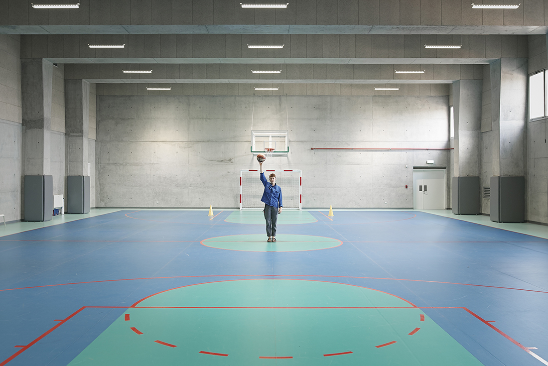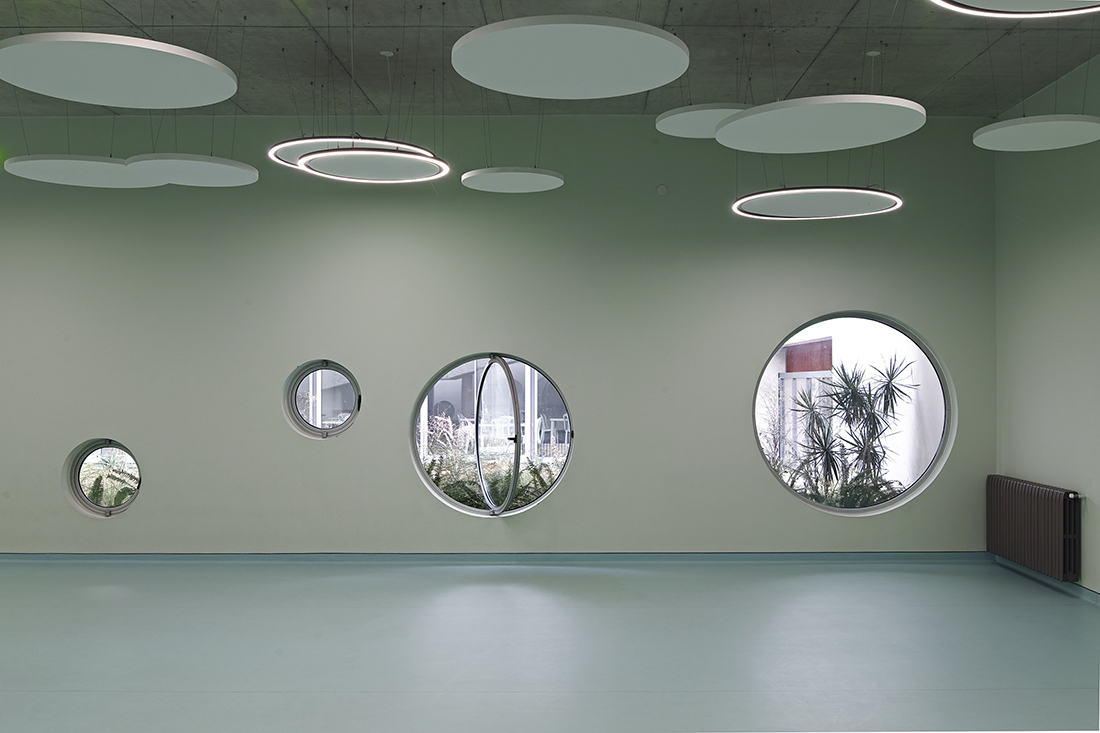 Sheltered outdoor spaces, double-height volumes, and playful circular windows foster interaction, while painted and raw concrete, and leaf-patterned walls dialogue with the landscape. By turning topography into a design advantage, the project cultivates curiosity, community, and a vibrant campus life.