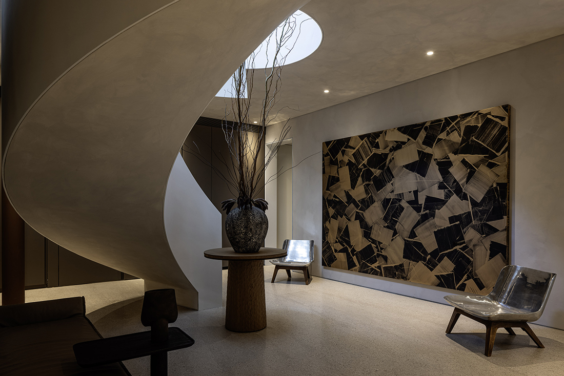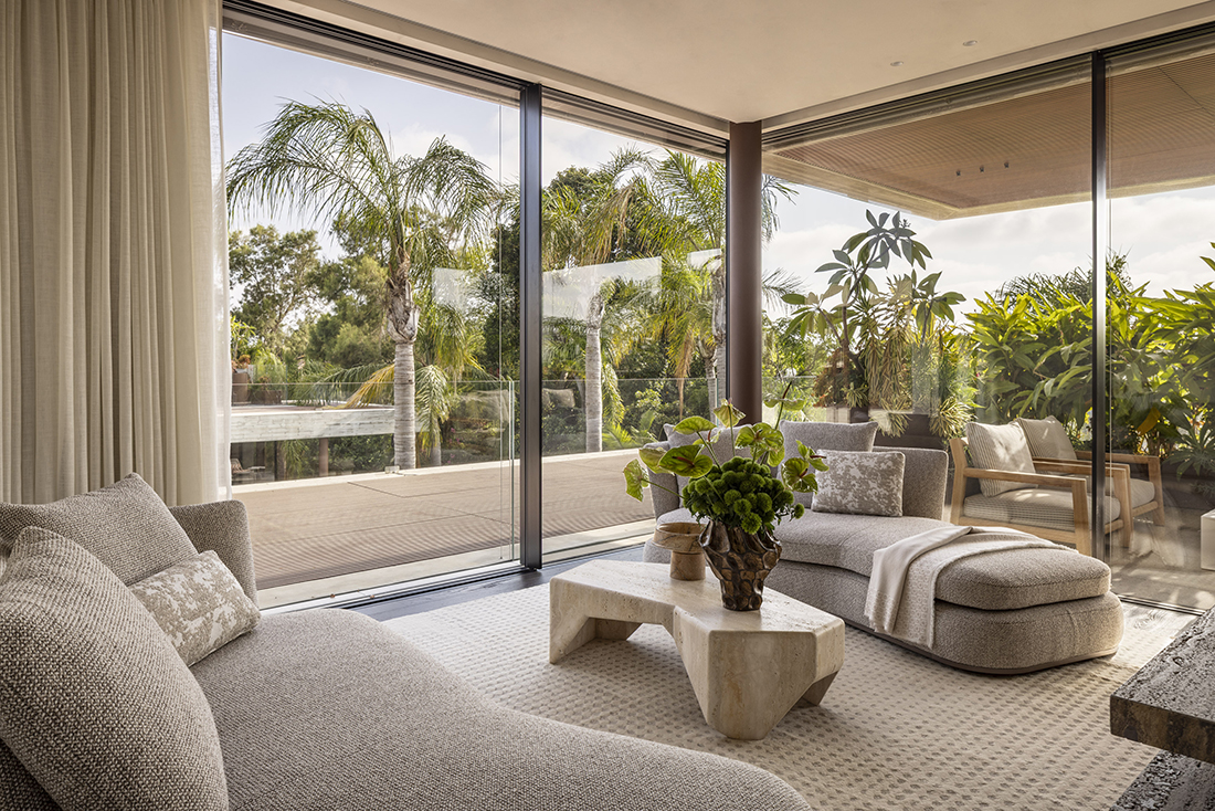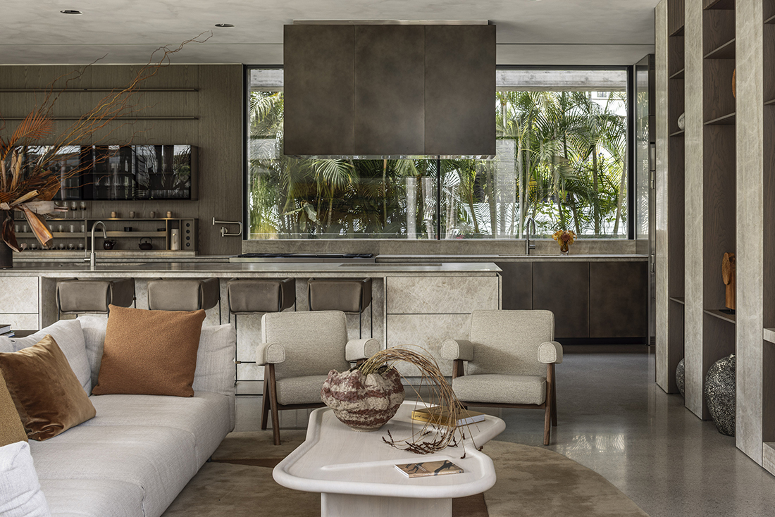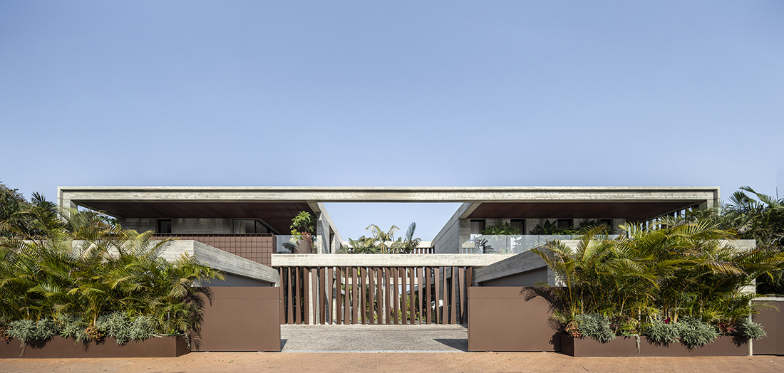 Instead of approaching the two plots as distinct units, the design treats them as part of a seamless flow. Two independent volumes are linked by a generous, open-sky patio and bespoke Corten louvers that mark a wide threshold. This defining architectural layout frames the courtyard as the true heart of the home, seamlessly connecting the main residence with the children’s wing, and drawing the eye toward the pool and lush terraces beyond.