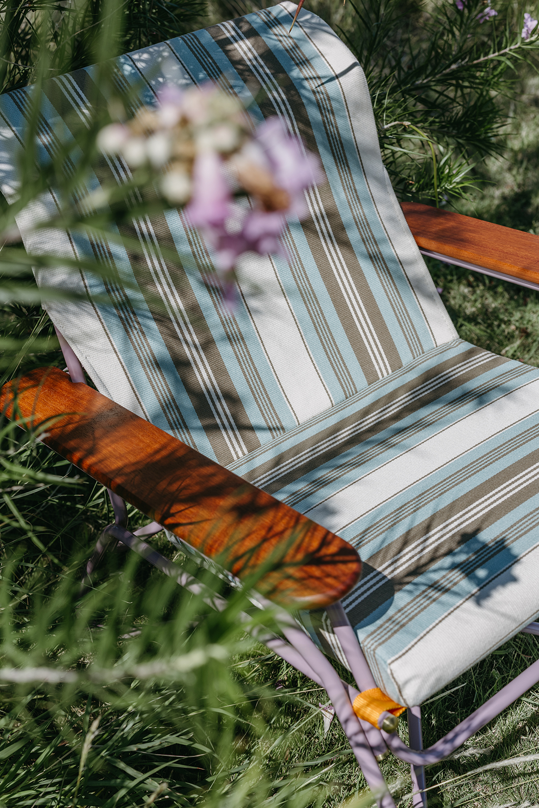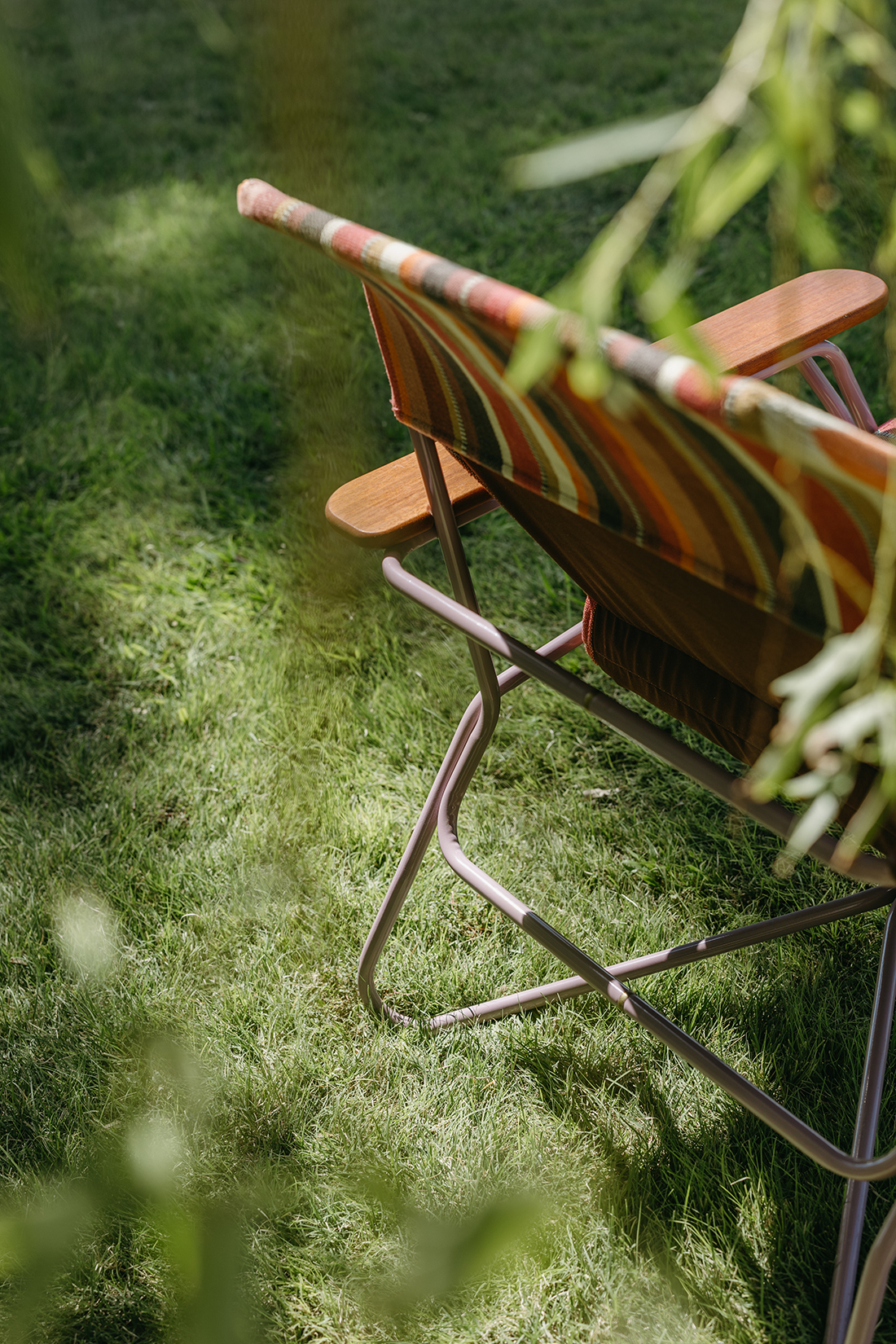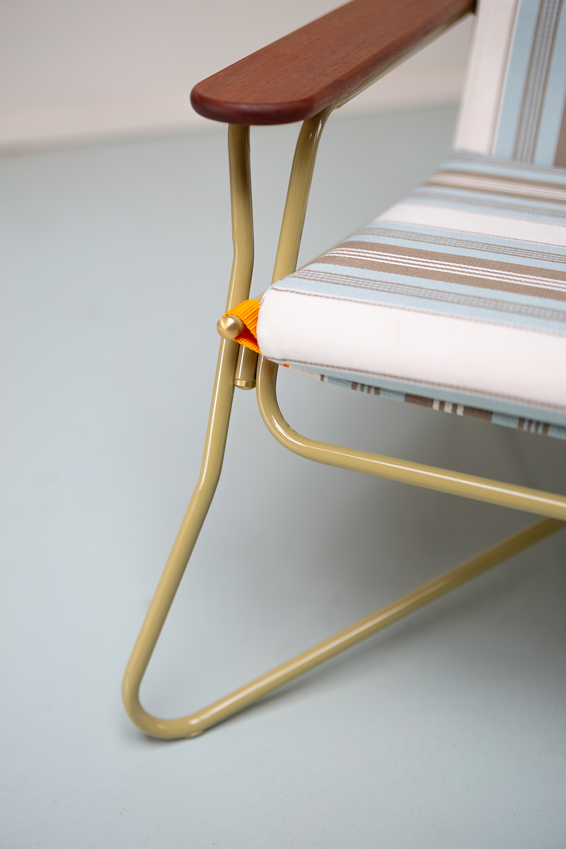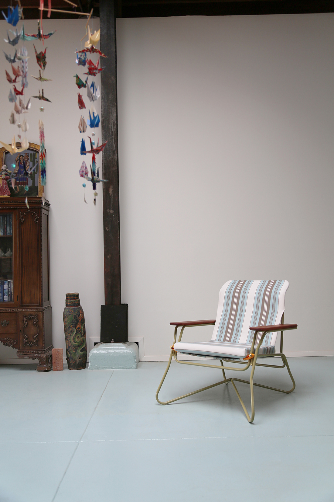 The chair comes together as a series of intersections and parallels between these four pieces. A textile sling hangs on the frame to make up the seat and back of the chair. Mahogany armrests and bronze caps finish out the details. The final version was realized over the course of one year, with numerous iterations in both the sling and the frame.