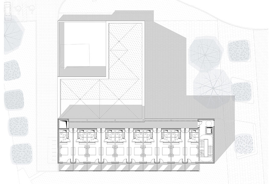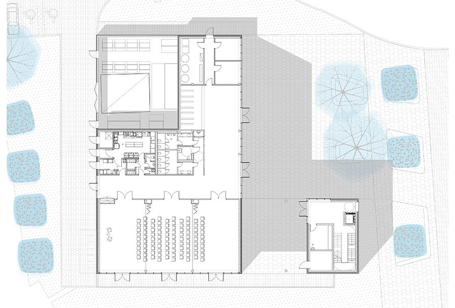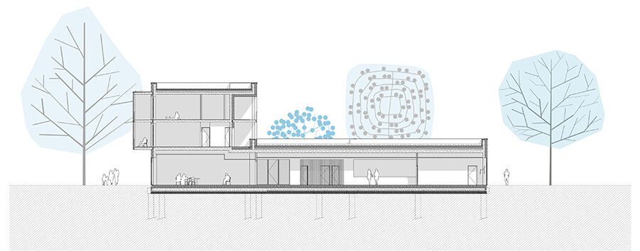 The building’s appearance is defined by its two primary functions, housed in separate wings. The conference hall is a single-story block on the ground floor, featuring a green roof and a large opening offering views of the lake. Perpendicular to the mass of the conference block, the first and second floors host a bridge-like apartment block. One side of this structure rests on top of the conference hall, while the other is supported by the staircase section.