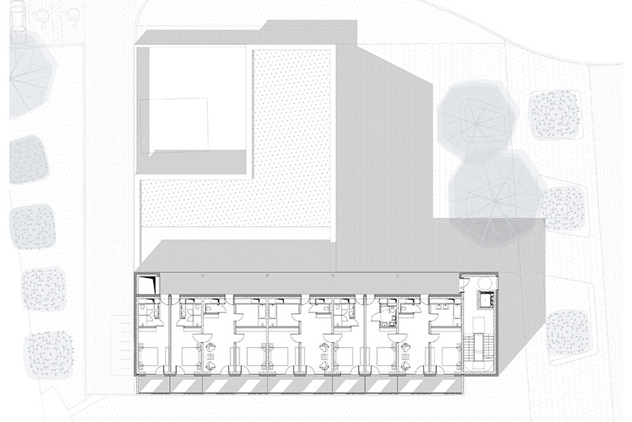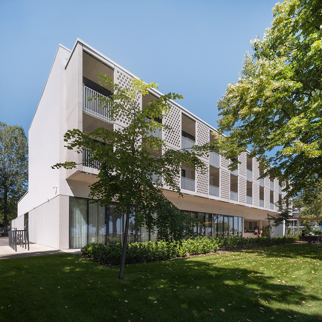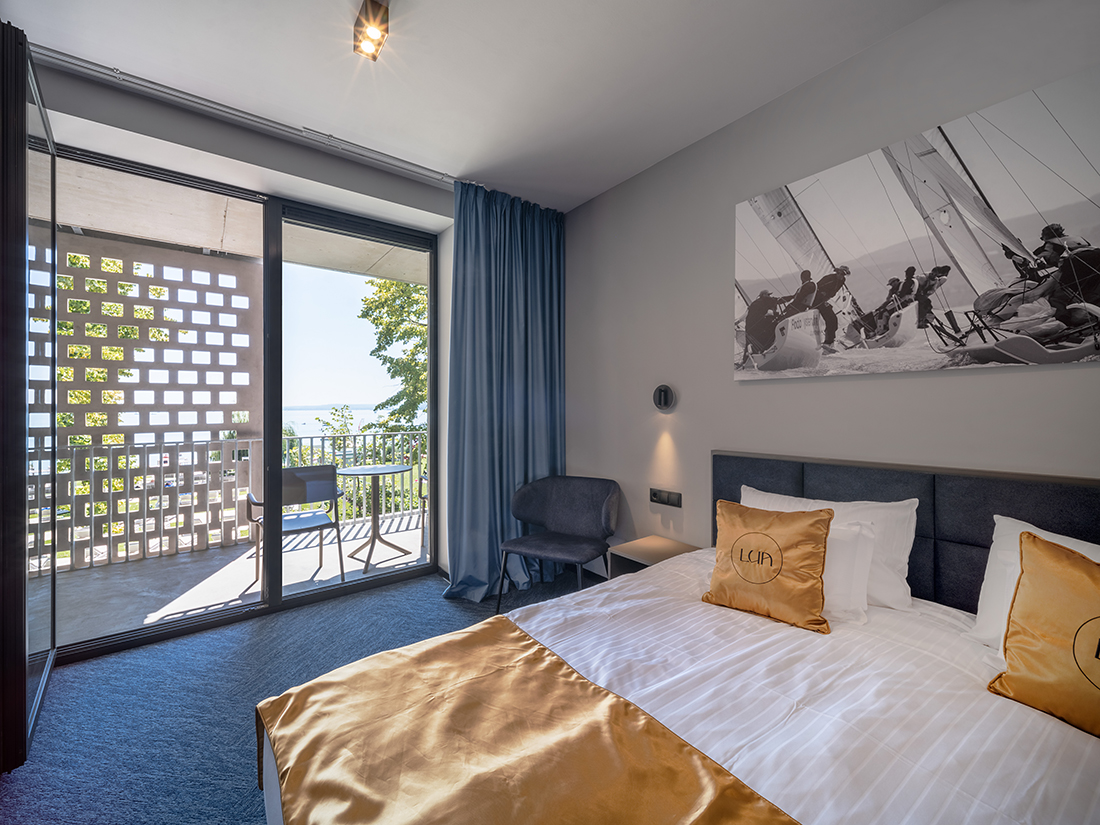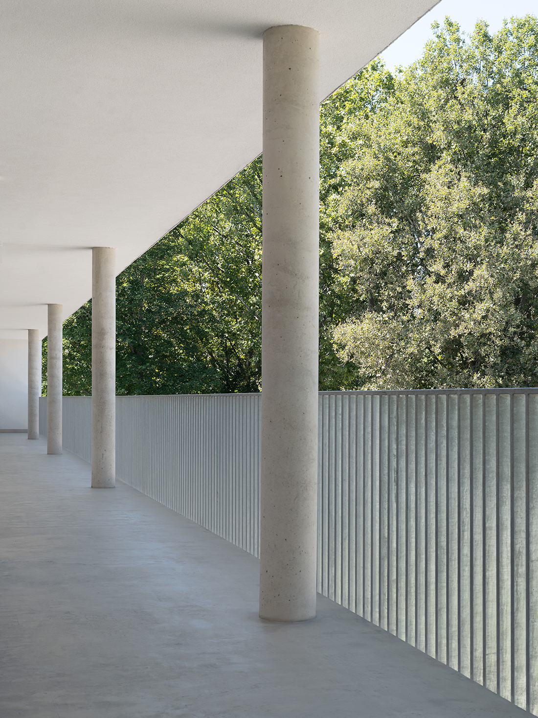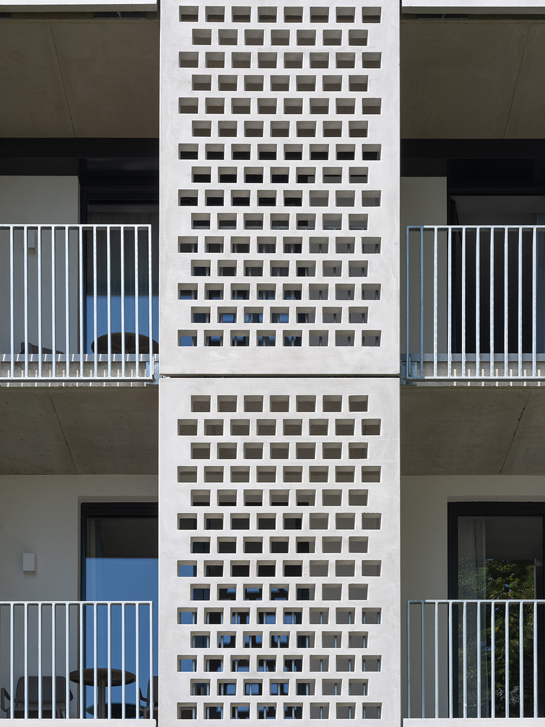 The ground-level opening beneath the “bridge” provides a direct view of the lake from the entrance square behind the building. The apartment rooms are enhanced by a balcony strip, offering a stunning panorama of the lake. A standout feature of the building is the curtain of prefabricated concrete shaders on the balconies, which pay homage to the late-modernist architectural traditions of Lake Balaton.