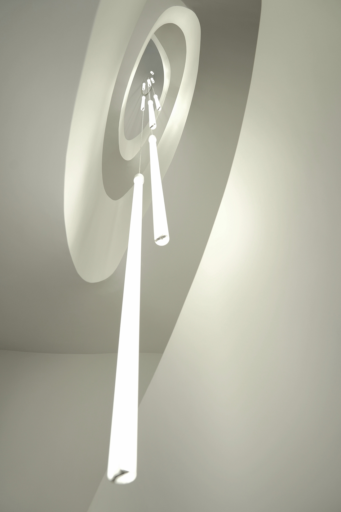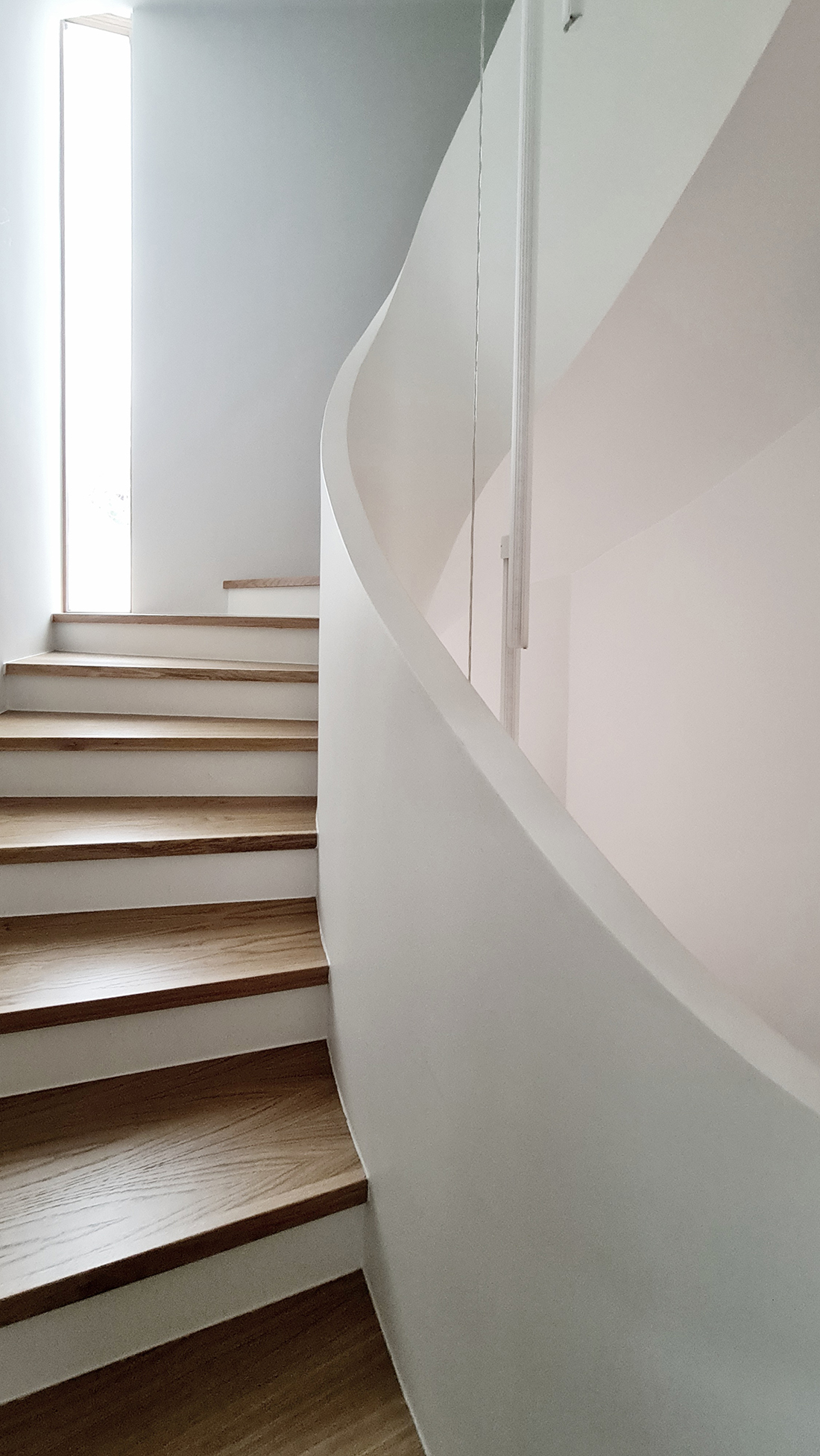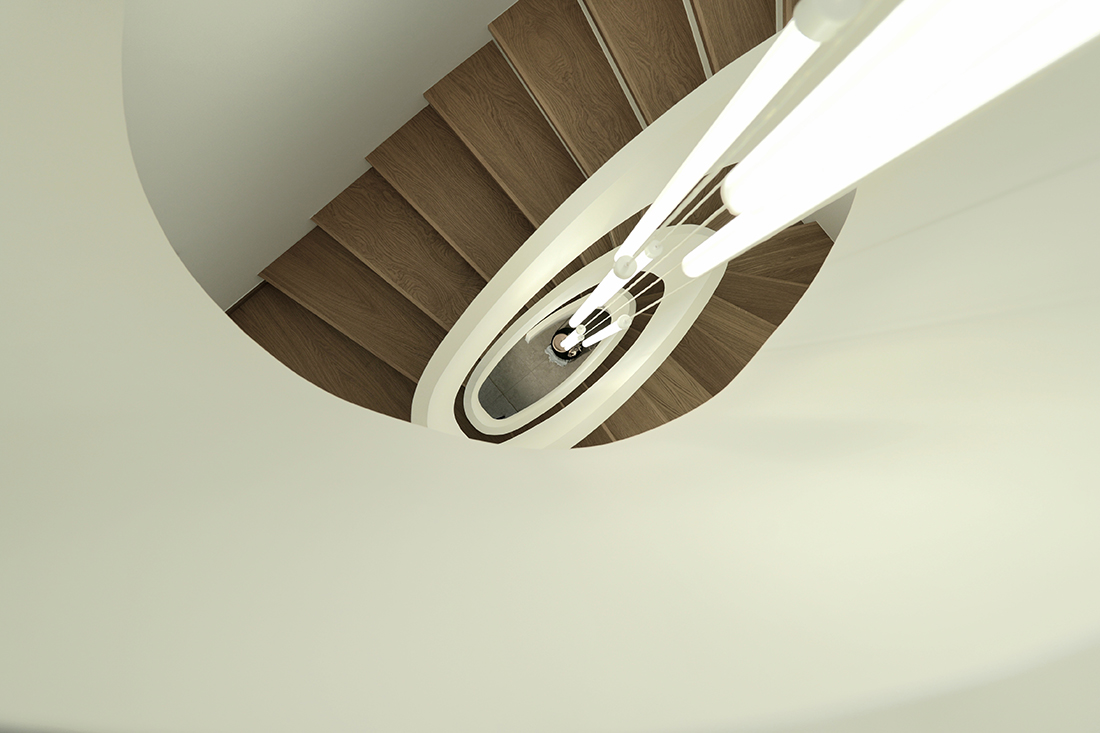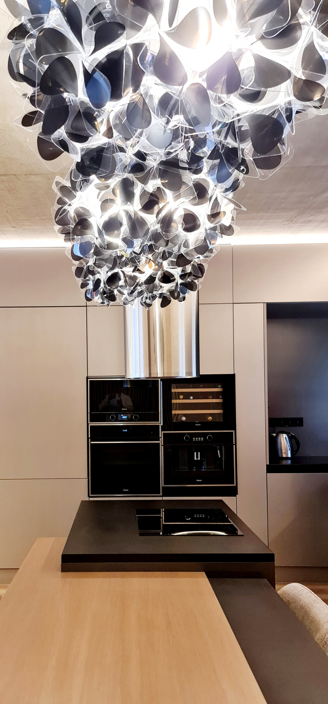 The floors are connected by a striking staircase that becomes a focal point of the home. Within the spiral space, a chandelier serves as a unique piece of industrial art. The interior design was guided by the principles of restraint and grandeur. A limited palette of colors and materials was used throughout. Clean, simple shapes and surfaces combine to form an elegant whole. In selected areas, large printed wall images soften the strict geometry, adding warmth and a sense of home.