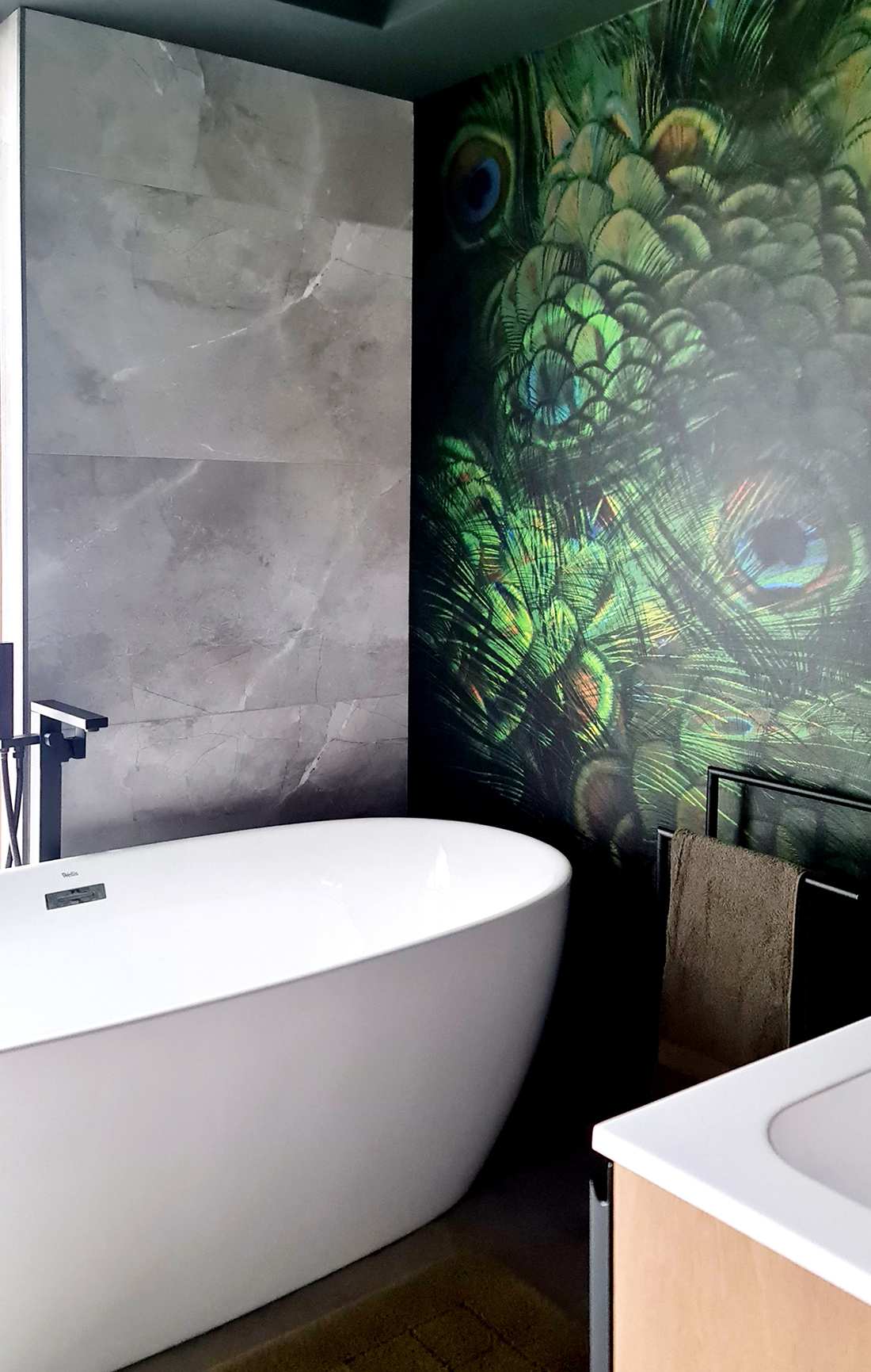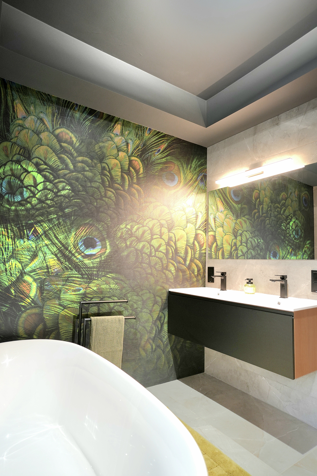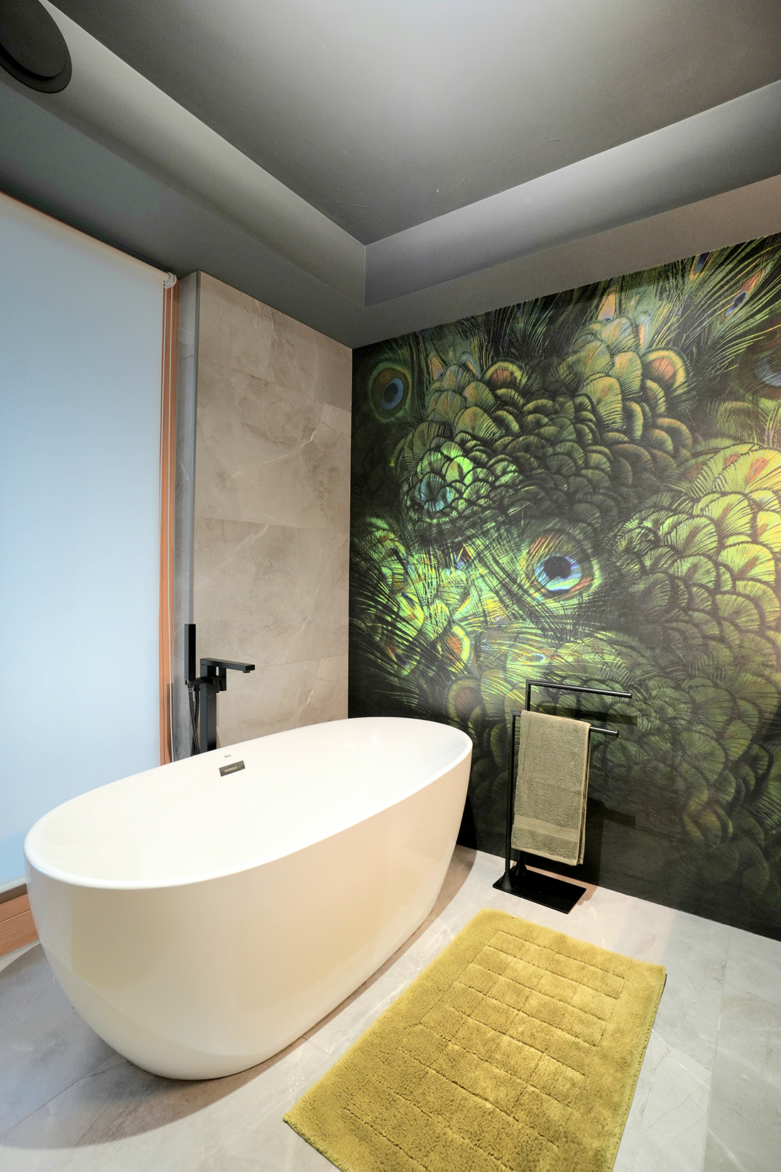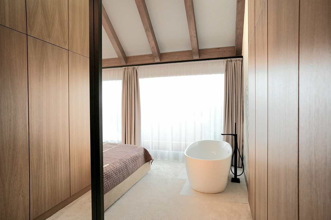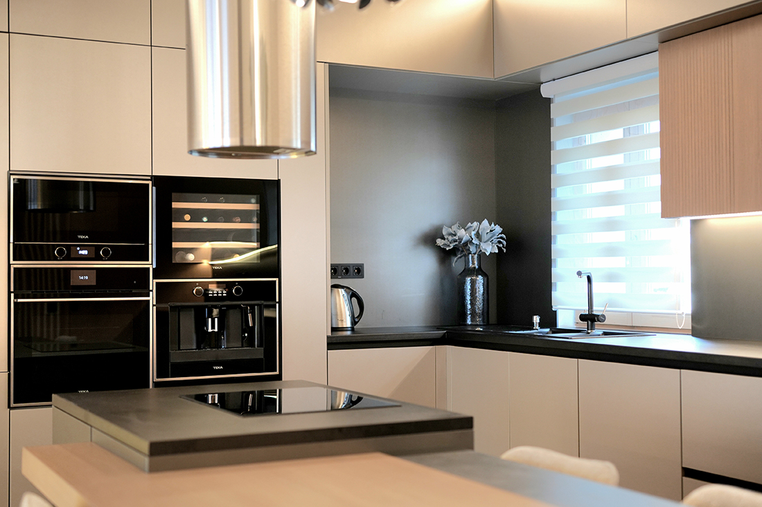 The floors are connected by a striking staircase that becomes a focal point of the home. Within the spiral space, a chandelier serves as a unique piece of industrial art. The interior design was guided by the principles of restraint and grandeur. A limited palette of colors and materials was used throughout. Clean, simple shapes and surfaces combine to form an elegant whole. In selected areas, large printed wall images soften the strict geometry, adding warmth and a sense of home.