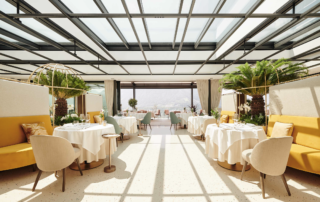 In 2018, the building was again extended by 9 generous suites for families and communal areas. The theme of the wooden sticks was applied once more: starting again from the existing topography this time they did not un-fold into the roof surface but were designed to form the ceiling cover of the cantilevering entrance and parking area: the thematic conclusion of the Strata-Alma-Paramount Alma. The strategy of Strata and Paramount Alma is continuously followed-up: starting from the steep terrain, the larch wooden sticks peel off the volume, form covered outer spaces, are partially brought into the interior, then turn into the ceiling of the access and parking deck to create an atmospheric and thematically coherent space, which allows framed views into the surrounding mountain landscape.