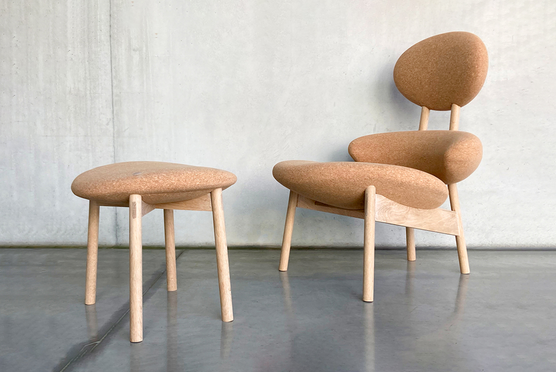 We have recreated the rounded shapes characteristic of upholstered furniture using sustainable materials. Instead of traditional upholstery, the soft parts are made from lightweight, durable, and renewable cork. Thanks to the advanced injection moulding of granulated cork, Corker allows efficient mass production with minimal material use. Its construction integrates traditional tenon-and-mortise joints, reinforced with wooden rods – combining strength with aesthetic refinement.