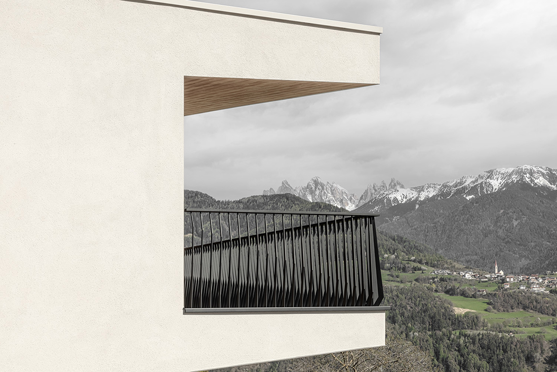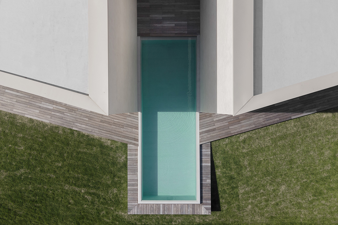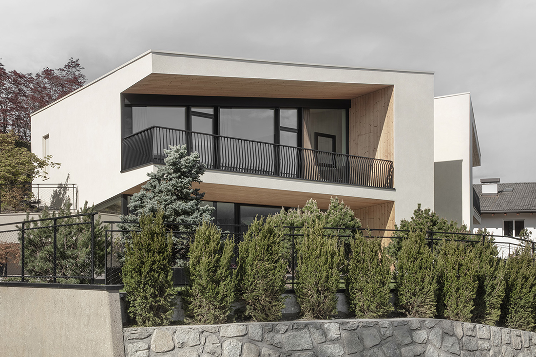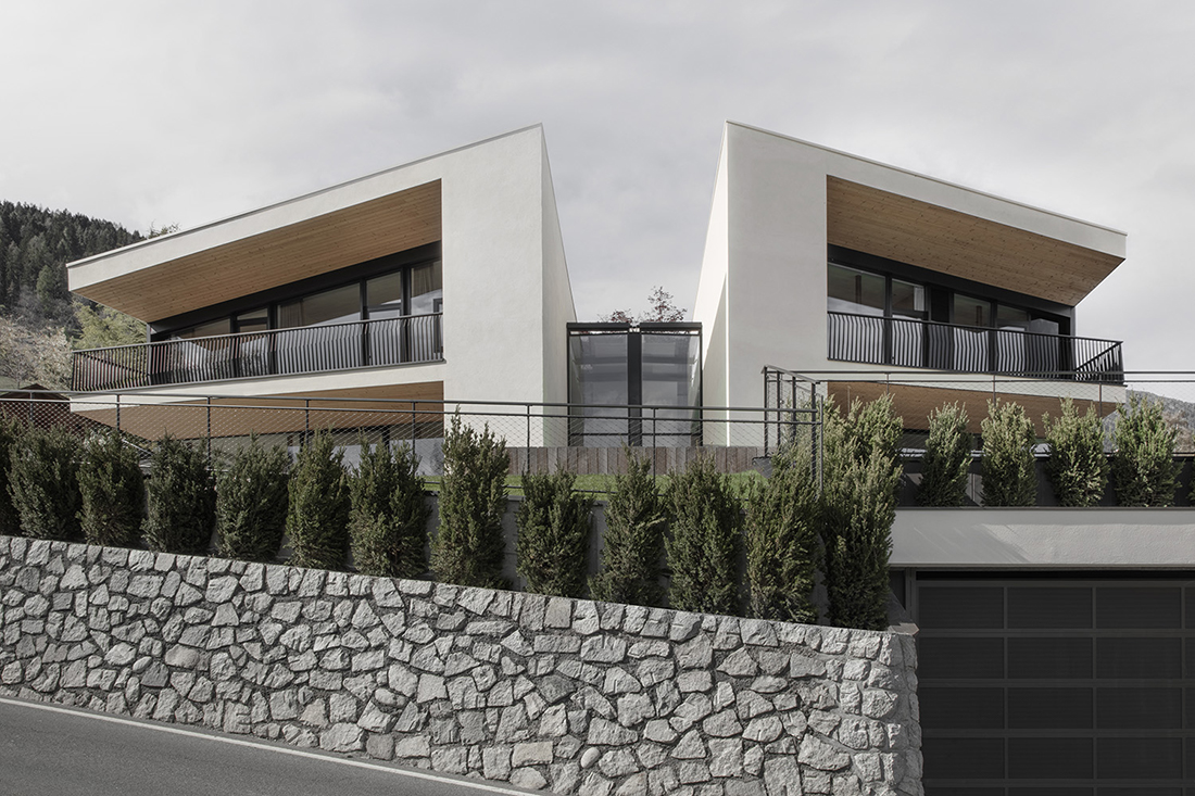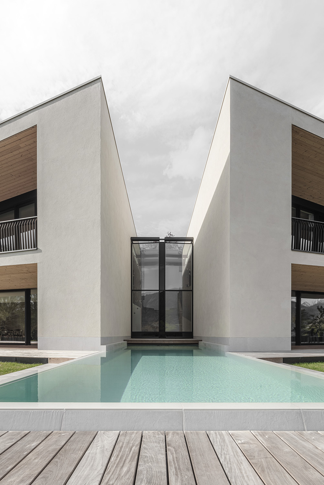 In Feldthurns, two clients realized their dream of a semi-detached house that reflects their shared passion for sailing while maintaining privacy for each family. The design reinterprets the classic gabled roof, splitting the building into two volumes that seamlessly reconnect. Positioned to face southeast and southwest, the two halves are unified by water – expressed through the south-facing pool and a glazed staircase at the rear.