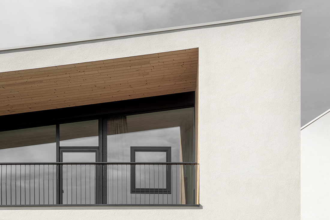 The façade features a light ivory, mineral-based texture that envelops the entire structure, while the roof is clad in color-coordinated sheet metal. Powder-coated metal accents, including the garage door and other metallic elements, along with pinewood gratings for the balcony cut-outs, complete the restrained material palette, enhancing the building’s harmonious aesthetic.