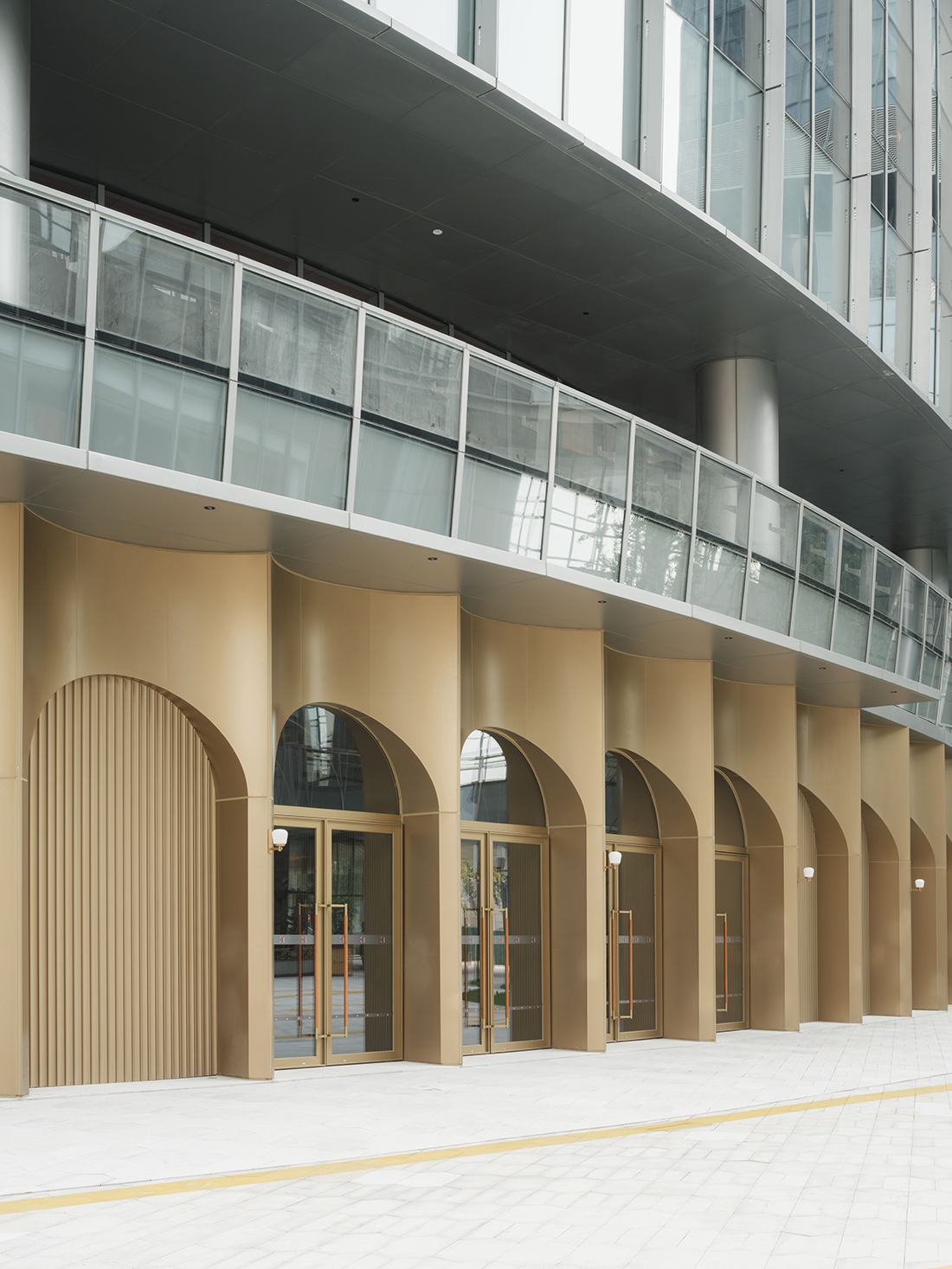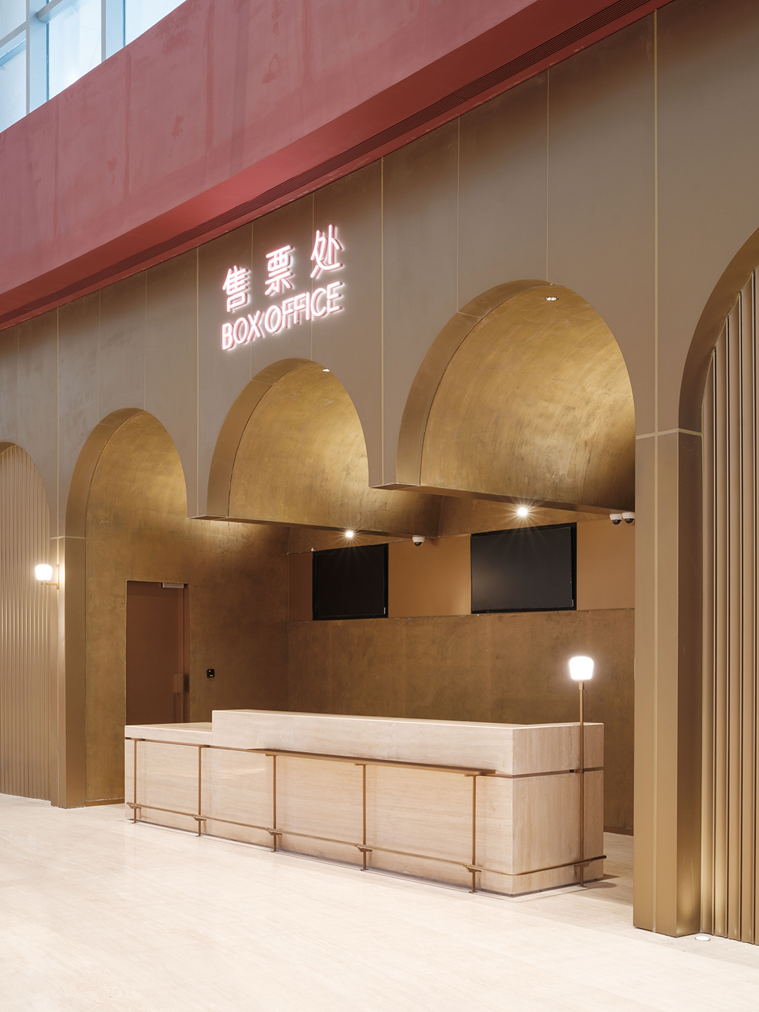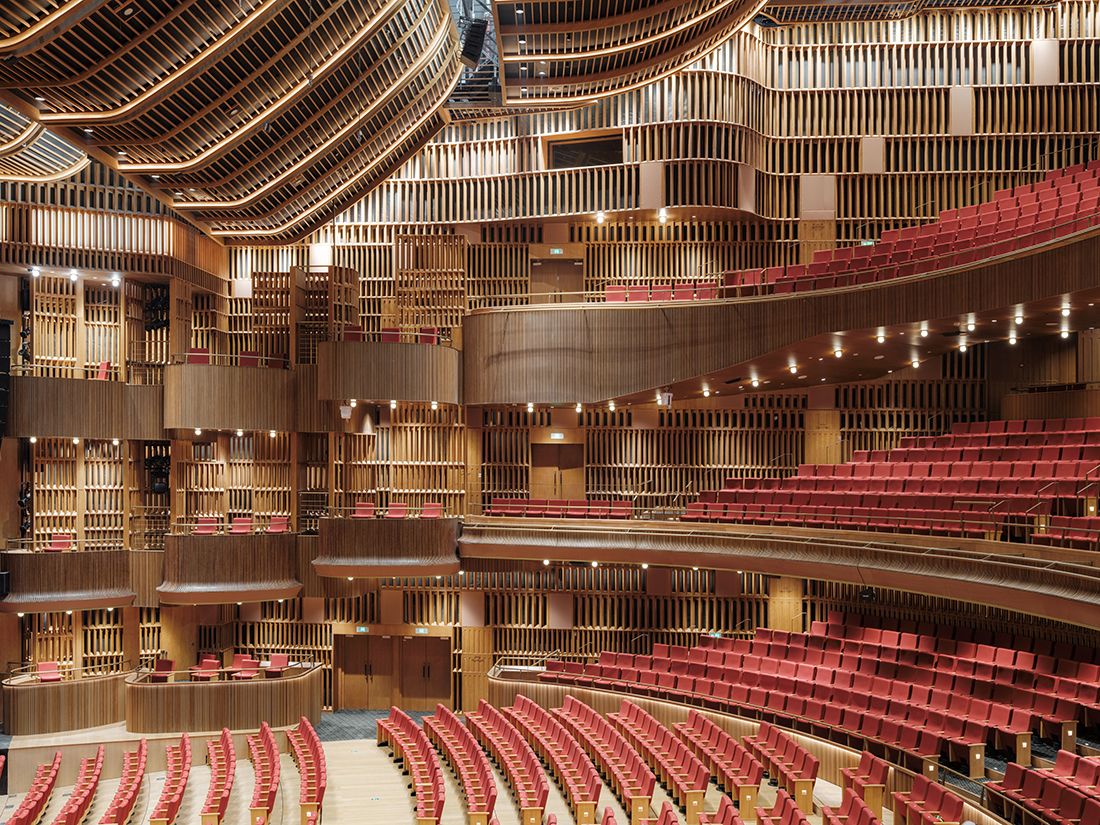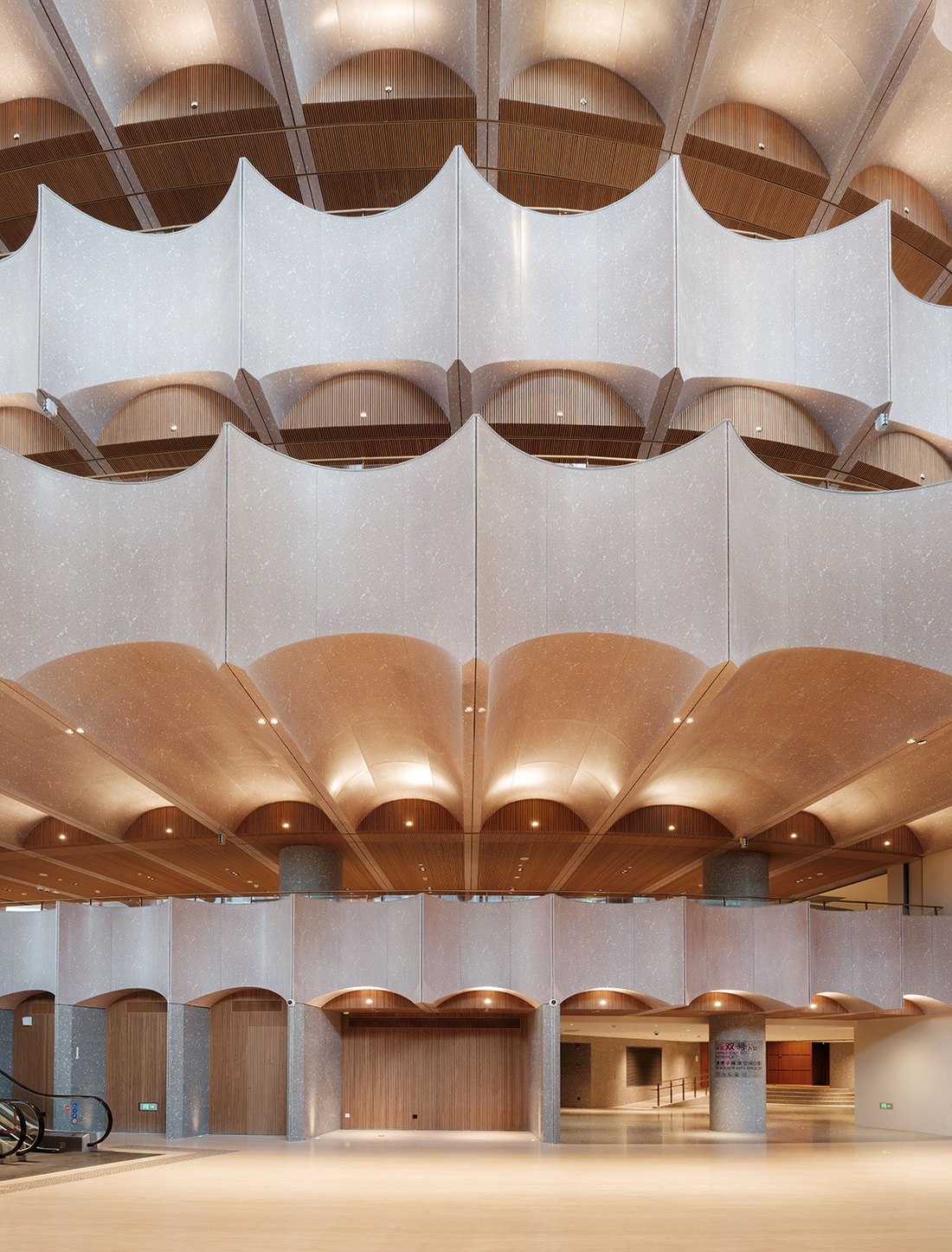 Neri&Hu’s interior design concept for the project is “the arena”, a contemporary interpretation of the classical archetype. The grand theater, its lobby, concourse, and the circulation paths encircling it are all defined by a series of arches. A strong impression is made in the five-story atrium space, where the full height of stacked layers of arches can be viewed. From any given position, your eye is drawn up and down, across the spaces; visitors take on a duality of roles – both observer and performer – such that the atrium itself becomes another stage. Within the 2.500-seat grand theater, warm oak envelops the entire theater performance hall, the repeating arch motif here not only echoes the arena concept, but also helps to fulfill the acoustic requirements of the theater.