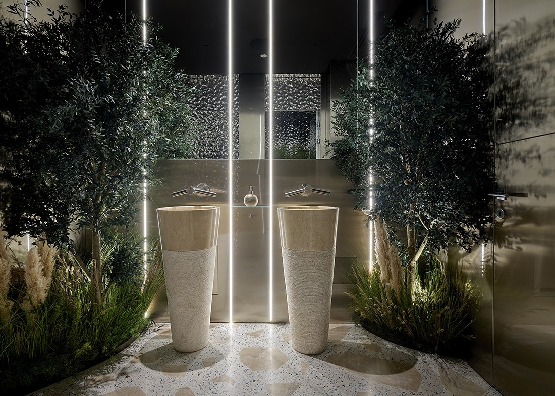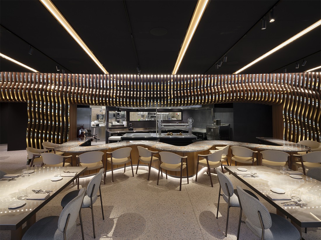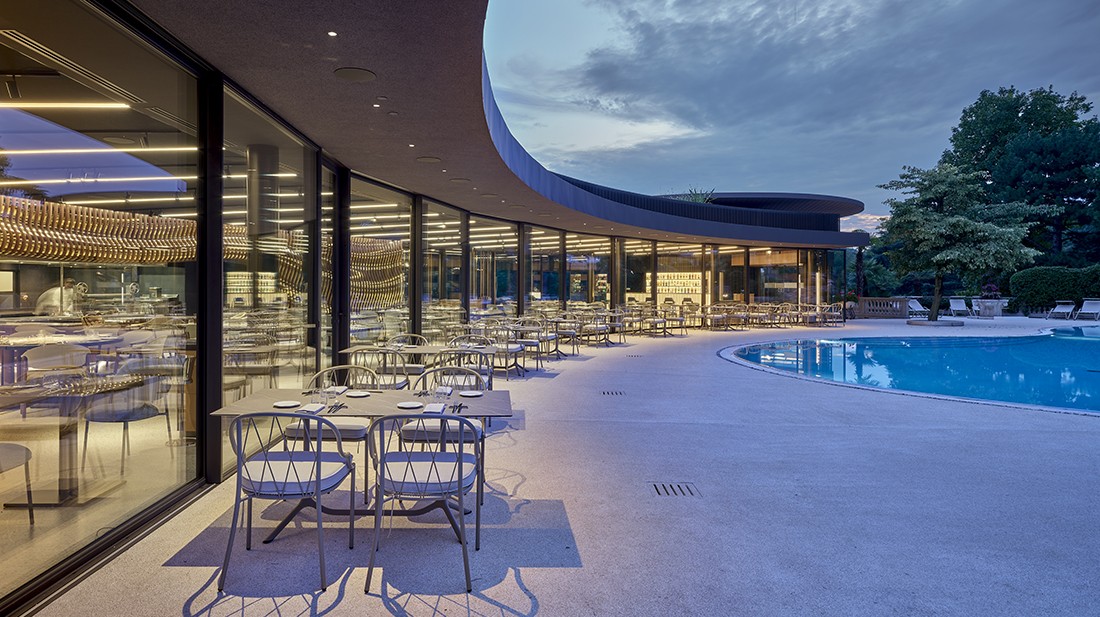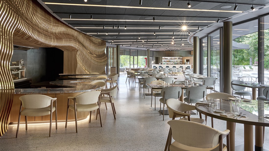 The interiors, designed as a large, open space with a lounge bar, show grill, and visible preparation areas, extend conviviality outdoors through wide openings that dissolve the boundary between dining room and nature. A sculptural, organic wall in oak and gold serves as the central element, embodying both tradition and innovation, while authentic materials, natural light, and refined comfort contribute to creating an elegant, immersive environment deeply connected to the Cerea family’s heritage.