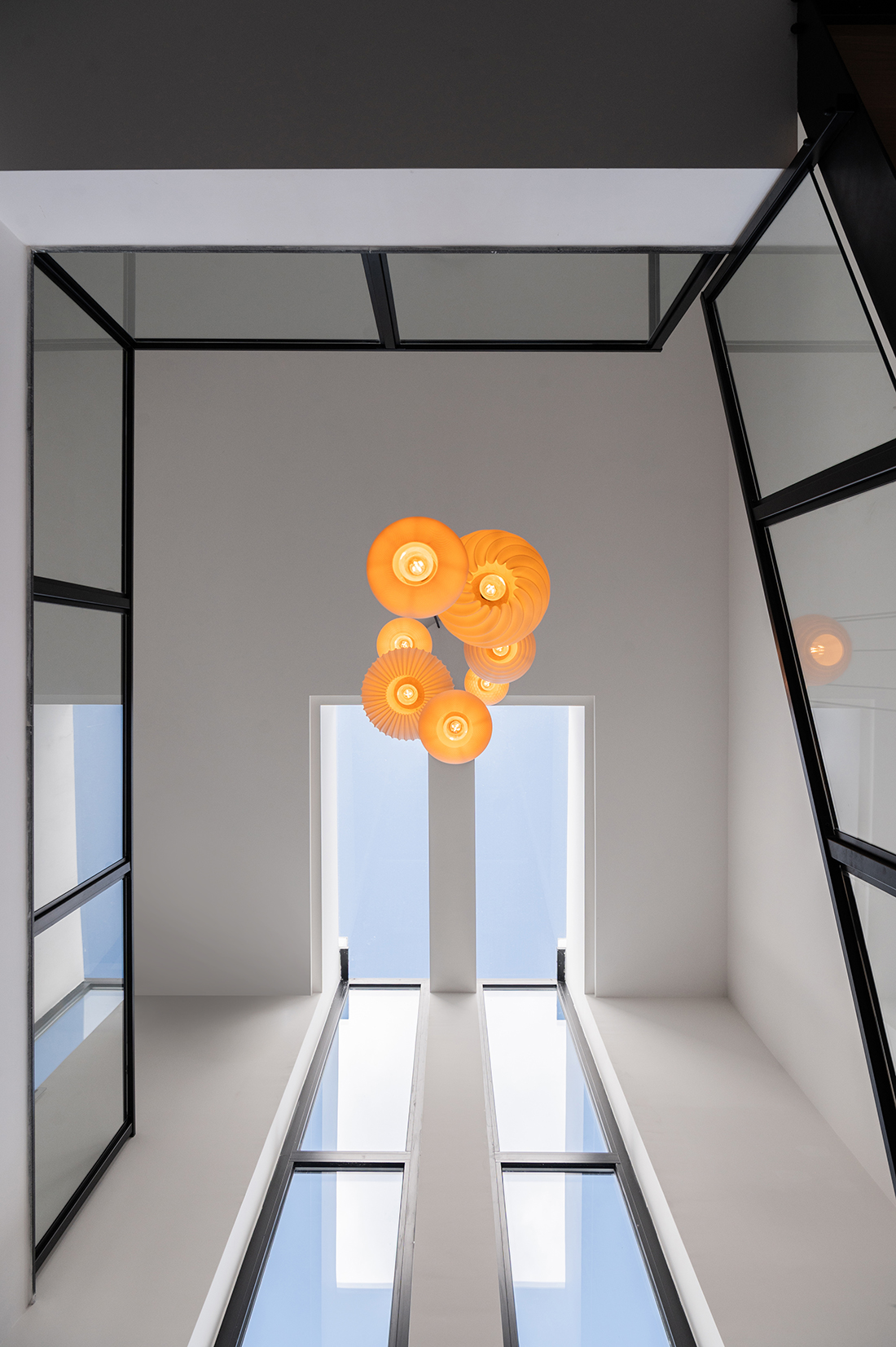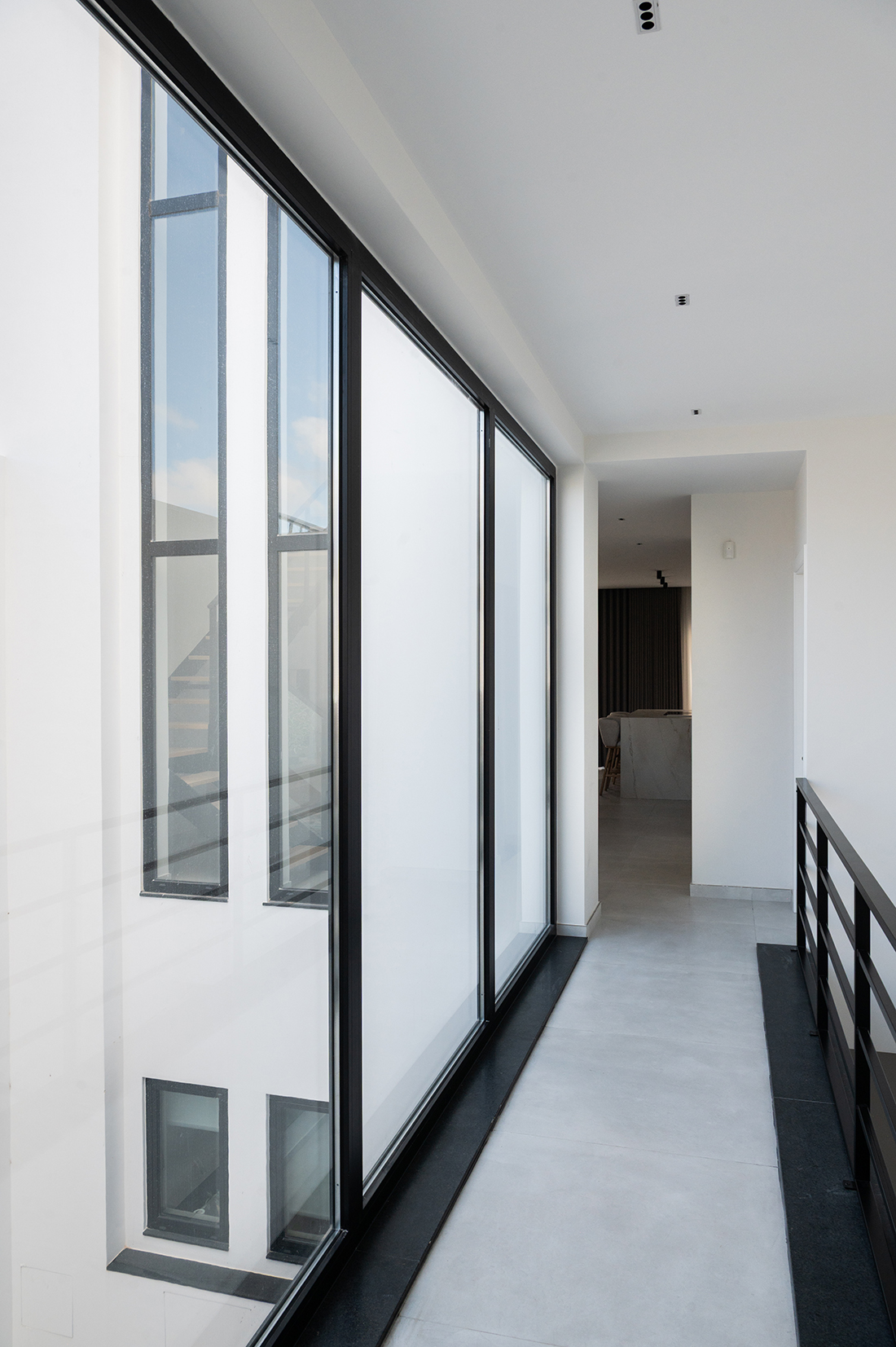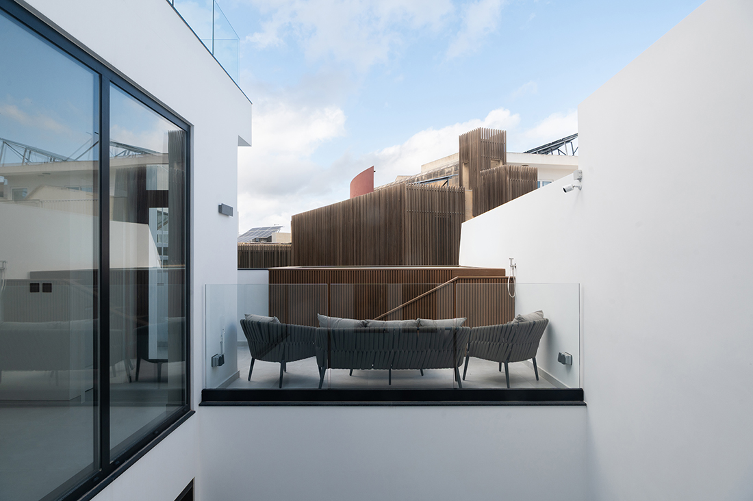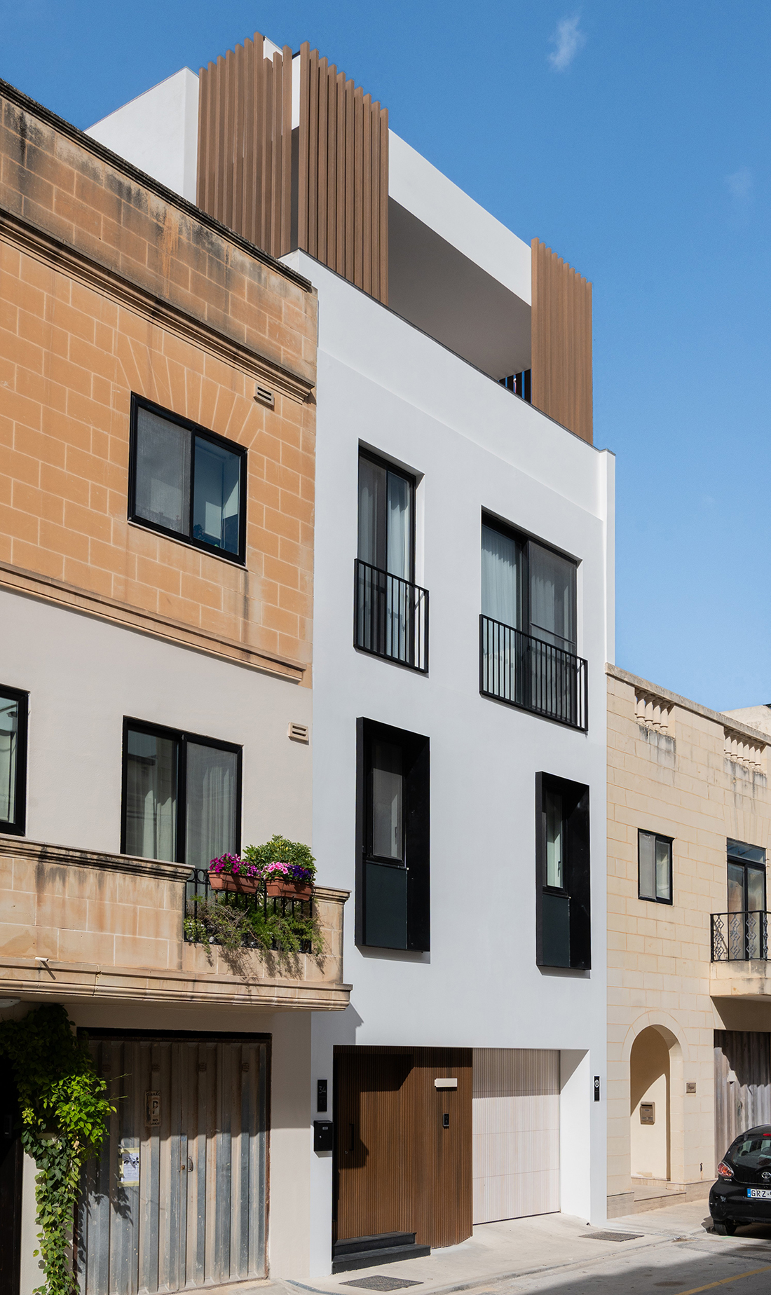 The courtyard pierces the site’s depth and acts as a vertical spine, bringing daylight to each level. Two 2-storey-high apertures rise from the courtyard and wrap around the roof as skylights, illuminating the double-height living space into a shifting play of light. The lower bedroom level enjoys a serene ambience and generous daylight from front and back facades, and the courtyard, creating a calm and private retreat. The ground floor accommodates a garage and a professional workspace, with an entrance from the rear street – integrating a historical masonry wall as a tactile link to the building’s past. This project is a new exploration of terraced living, material honesty, and the poetic potential of light in Maltese domestic architecture.