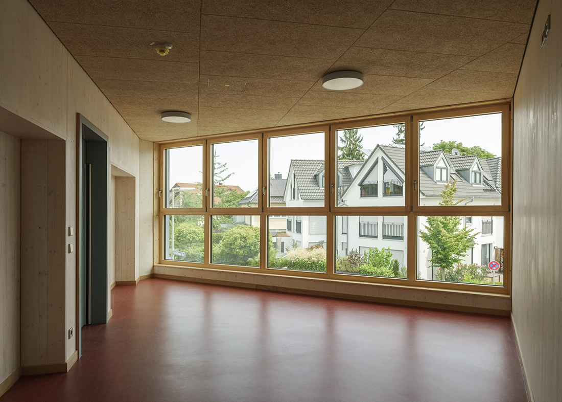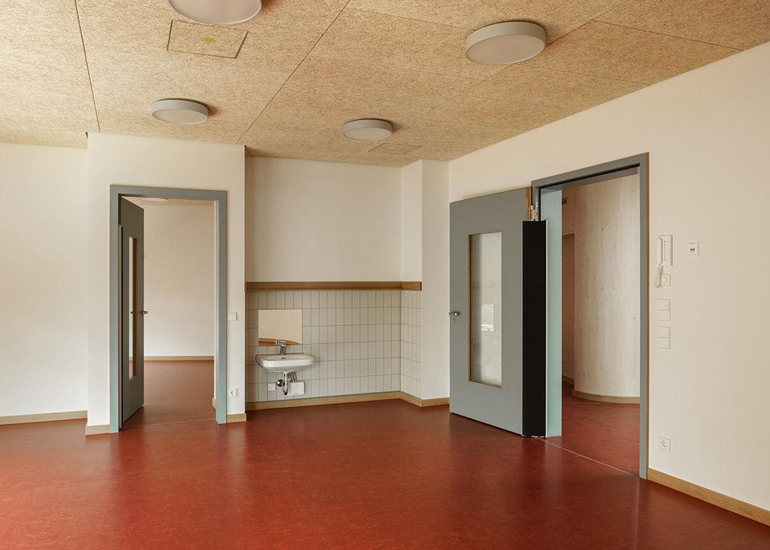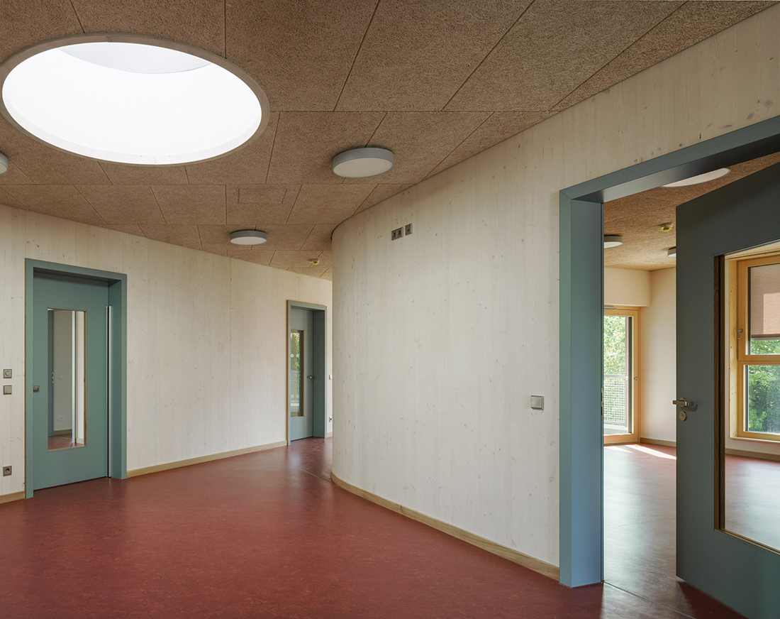 The three building components frame a multifunctional central area that serves as a foyer, cloakroom, and play corridor all in one. On each floor, the multifunctional area extends all the way up to the façade, allowing for natural lighting and ventilation. Rounded walls seamlessly connect the various zones. The central space is defined by solid wood walls and ceilings that are, at the same time, both robust and atmospherically appealing. A skylight contributes wonderfully to this friendly, bright look and feel.