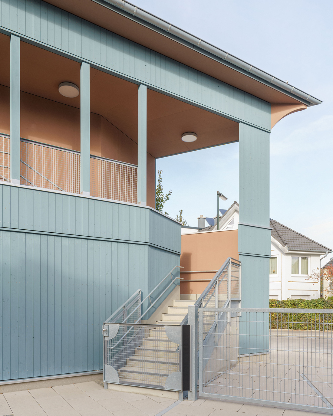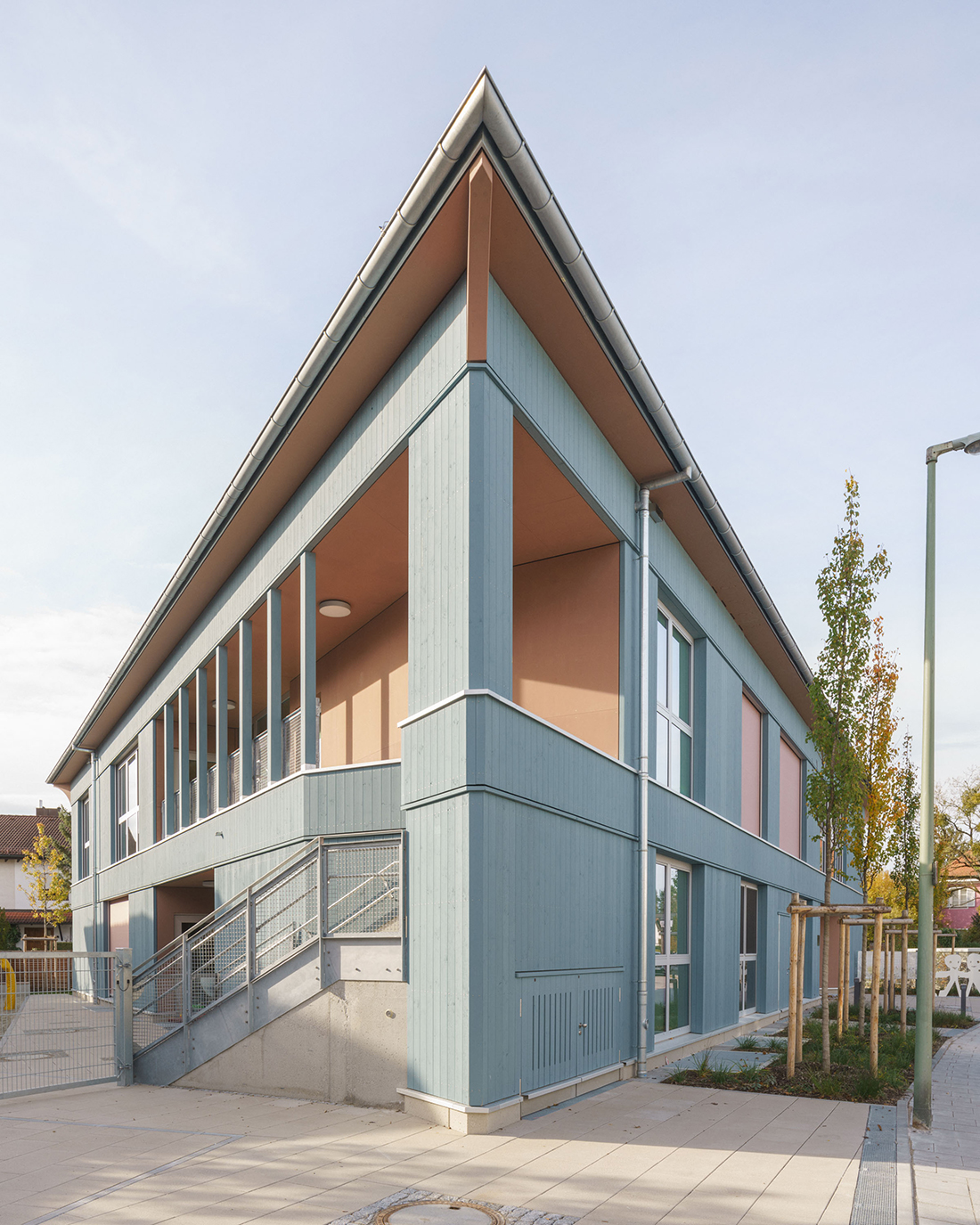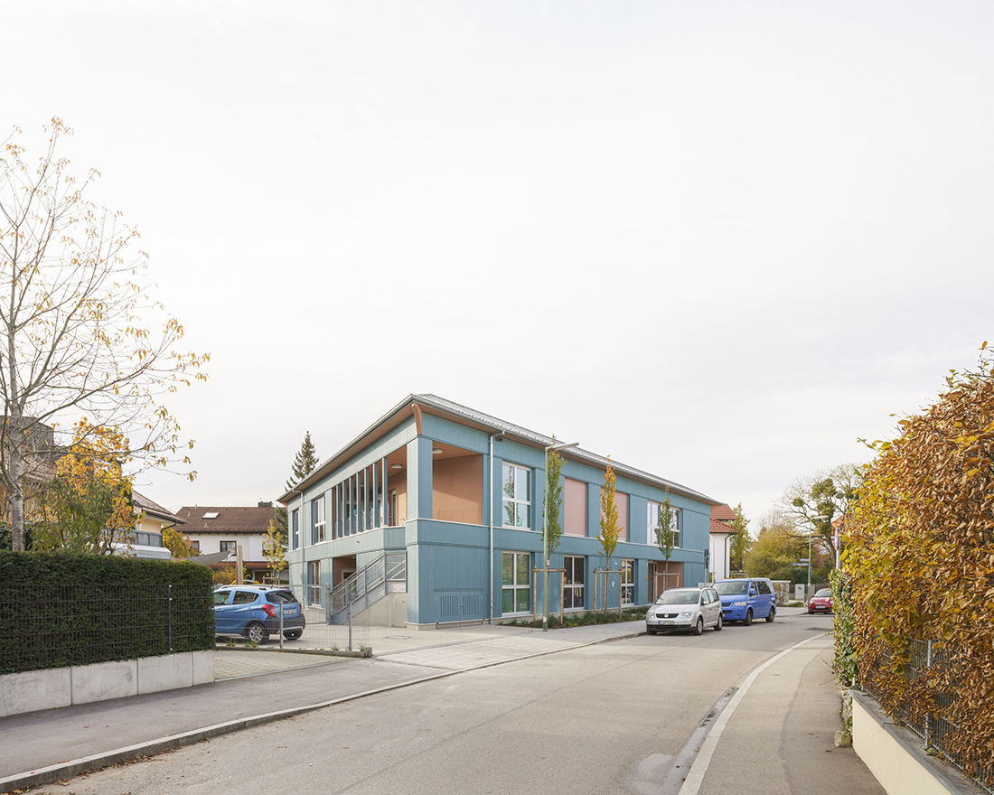 Right at the heart of Munich’s Hadern residential quarter, there is one last small plot of land that is yet to be developed. It is a triangular property at a fork in the road, and it is earmarked to become home to a three-group day care center. The center’s design fully exploits the potential of the somewhat cramped plot of land, proposing a triangular wooden building painted light blue, which stands fully detached and highly recognizable at the intersection.