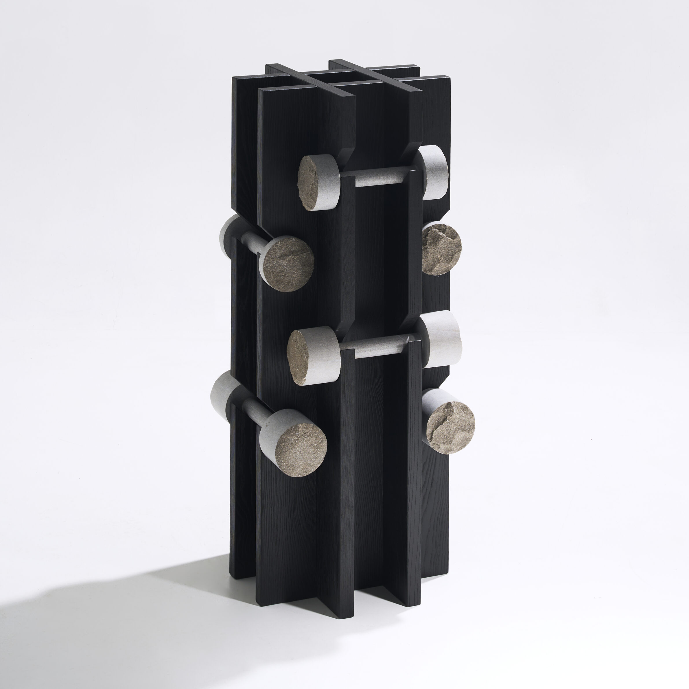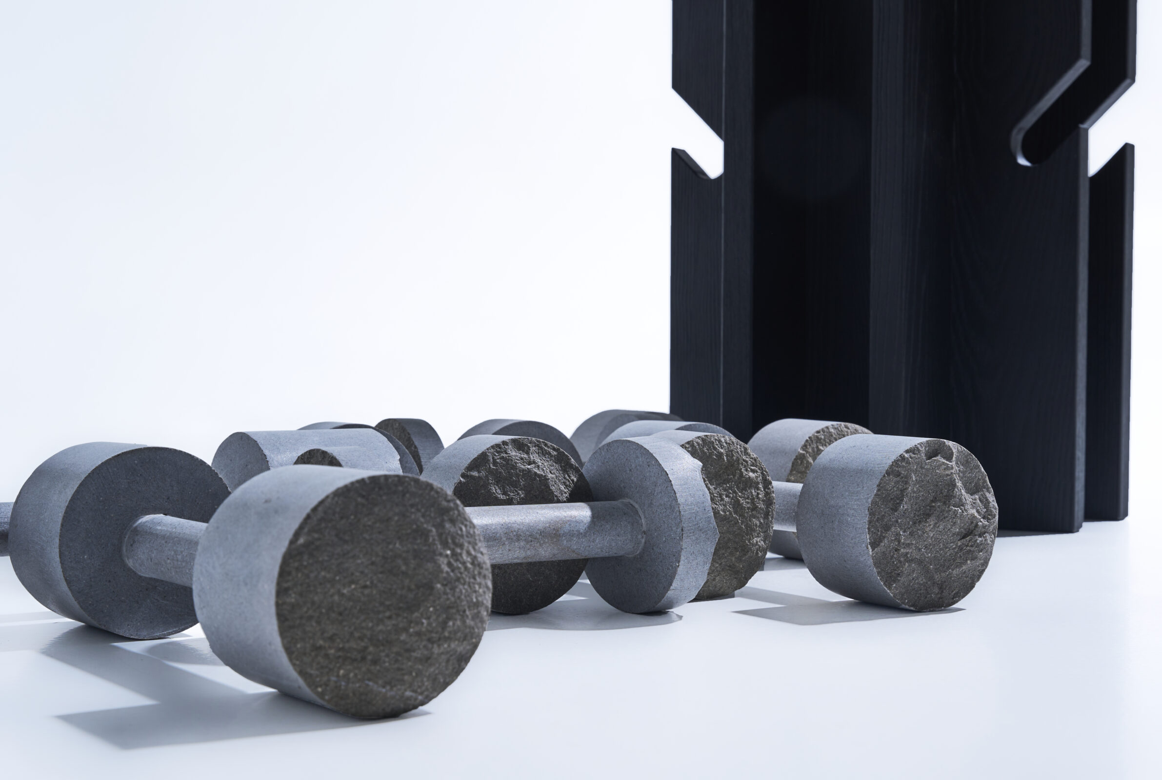 ​Plinto emerges from a fertile tension between the artisanal gesture and design thinking, where form is not merely drawn but arises as the outcome of a conscious, material-driven process. In this object, the gym apparatus emancipates itself from its purely technical dimension to assume a domestic and symbolic value. The innovation lies precisely in this shift: Plinto transforms a functional device into an element of collectible design, capable of inhabiting a space with the same dignity as a sculpture or a piece of furniture. The form is determined by the hand of the artisan, who interprets and guides the material toward its final expression, making each piece unique. The ash wood structure, finished with an open-pore varnish, enhances the natural texture of the grain, while the Piasentina stone dumbbells confer upon the object the sculptural and singular character described above.