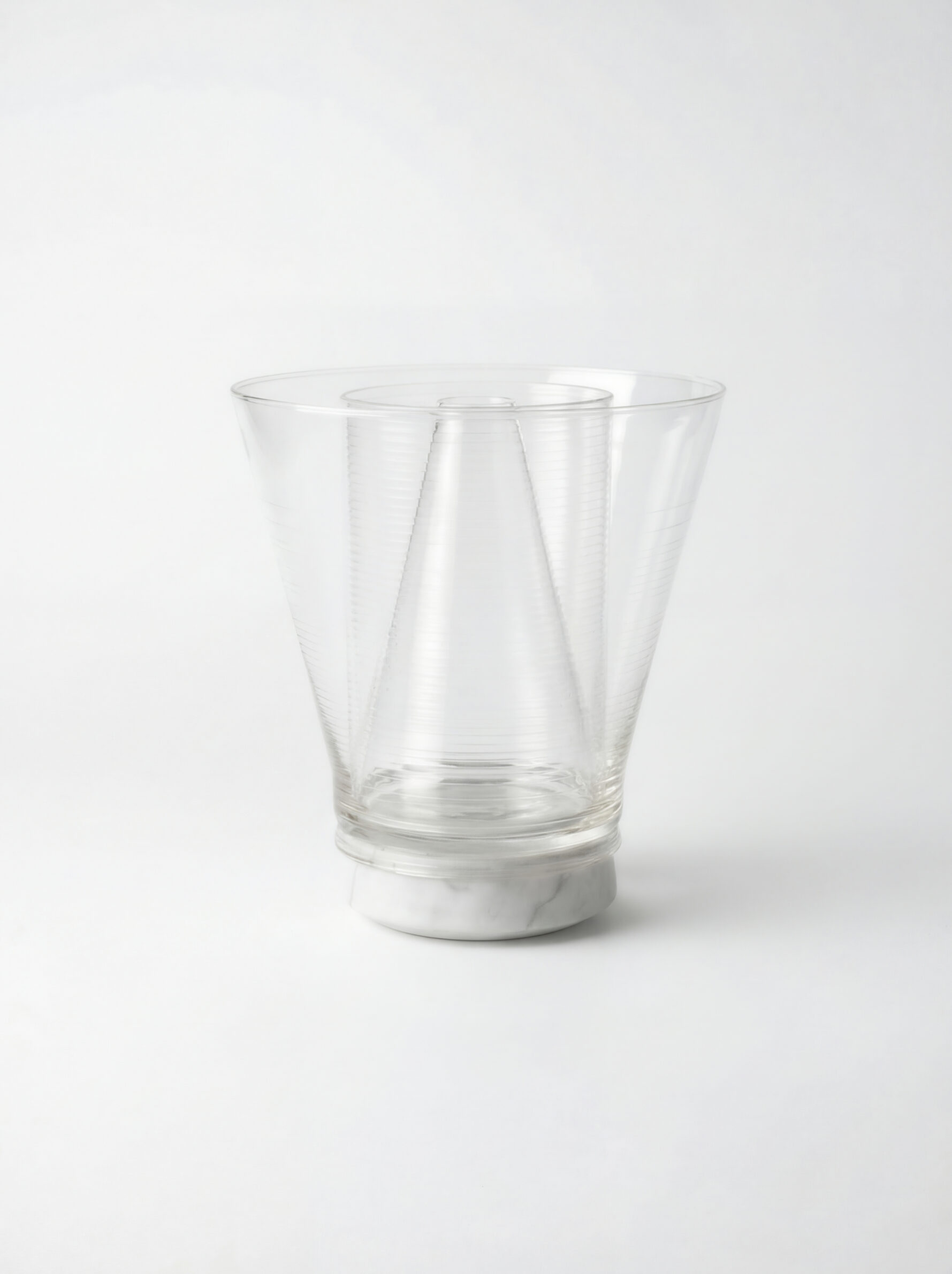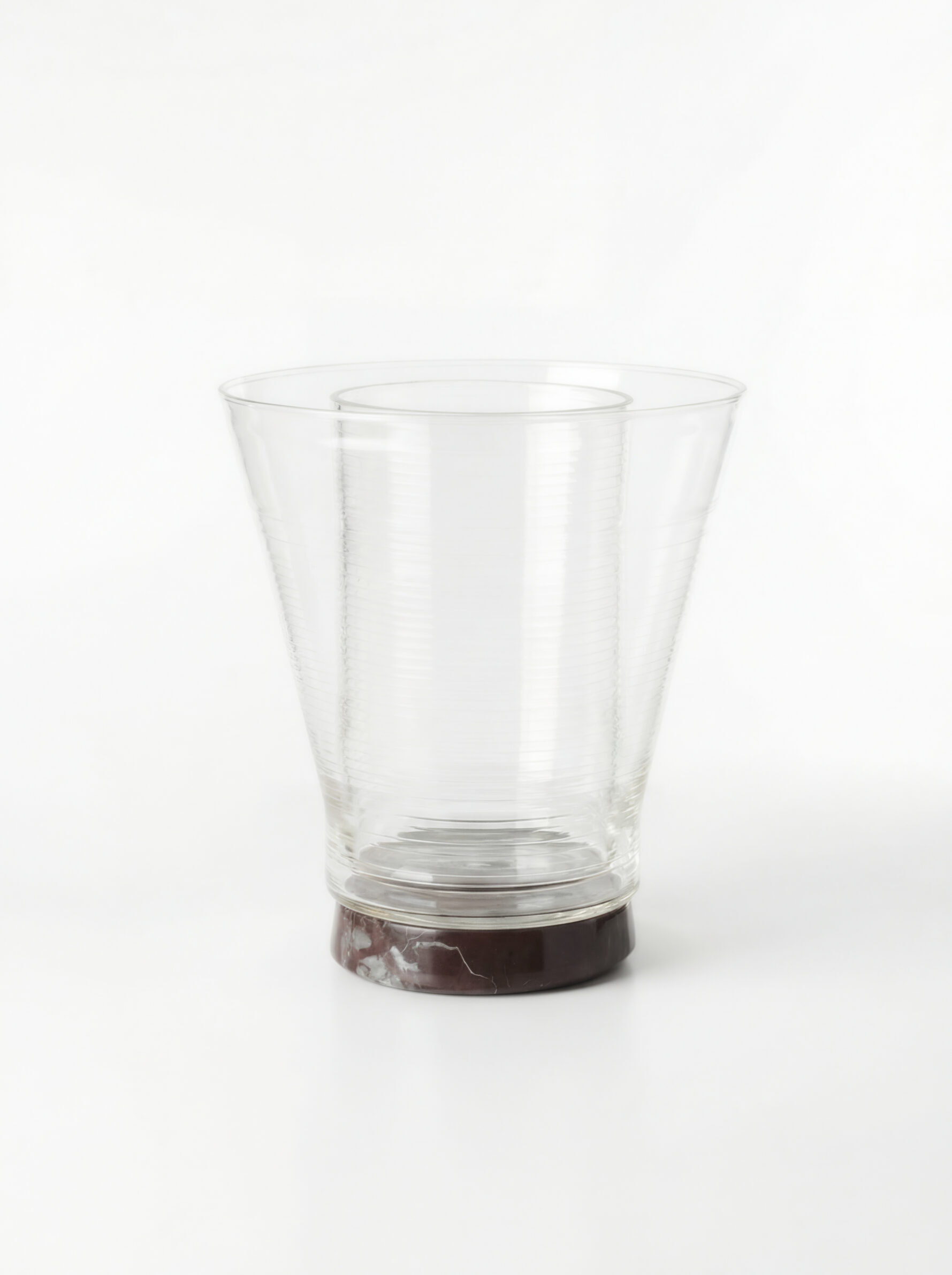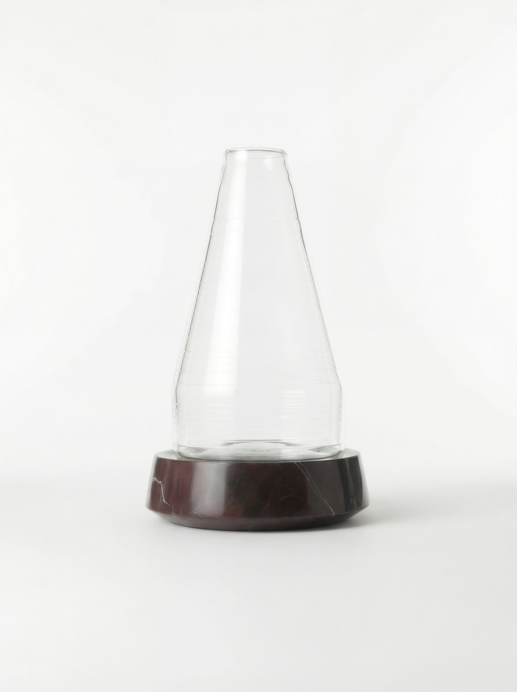 Roseto is a vase that takes shape through the person who uses it, adapting to the number of roses and to the gesture with which they are arranged. A base in marble and three elements made of glass define an essential system that changes each time according to the composition. A single rose finds space in the smallest element, ten in the intermediate one, one hundred in the largest. Each quantity activates a different configuration, designed to respond directly to the presence of the flower. The three elements can be used individually or together and, when combined, even without water, they build a compact and almost sculptural presence. The stone provides stability, the glass receives without interfering. Roseto does not impose a form but lets it emerge from use, from the number of flowers and from the way they are arranged in space. In this minimal balance, the object remains the same and at the same time is never identical to itself.
