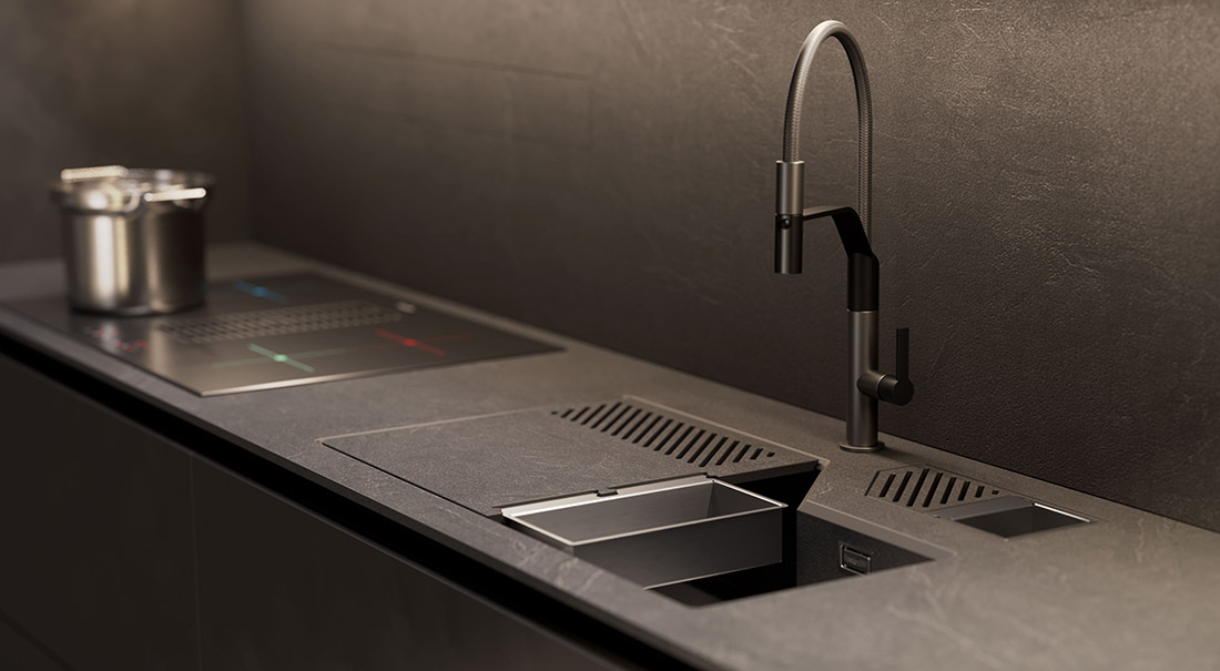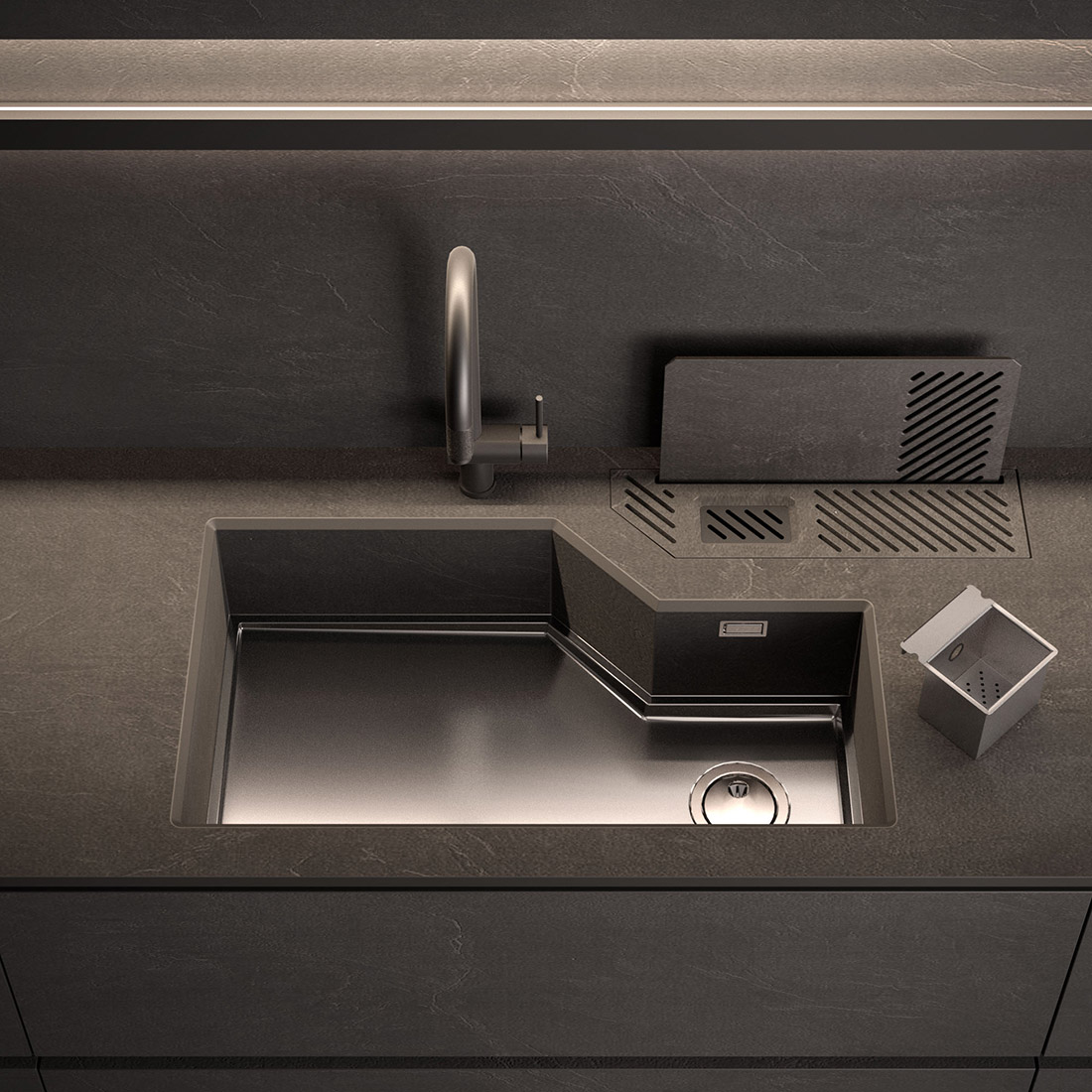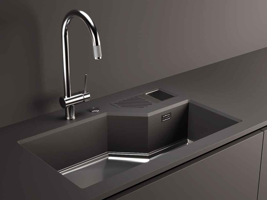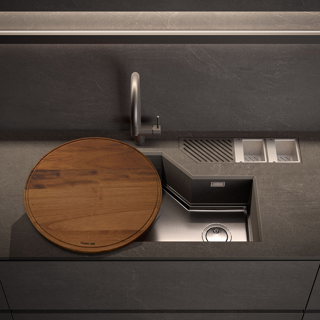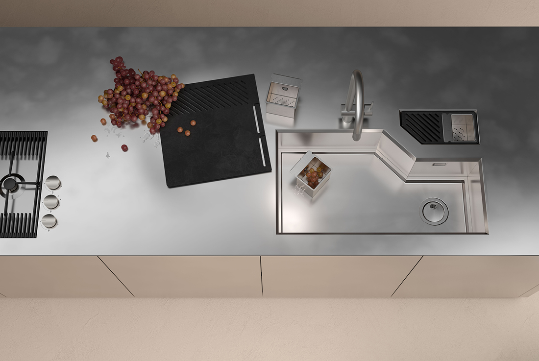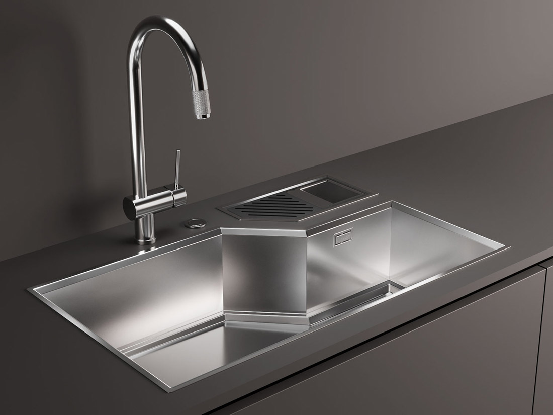 The Diade sink can be customized with small bowls and stainless steel colanders that are easily movable and repositionable as needed. Additionally, the range of accessories includes two types of chopping boards in different shapes and materials to complement the system.