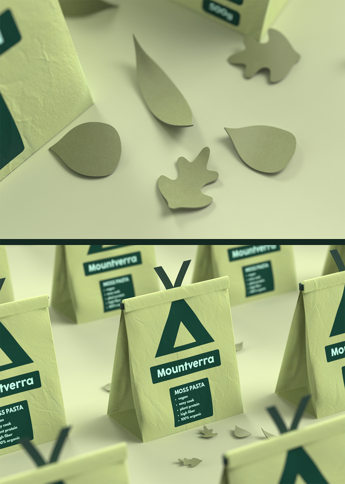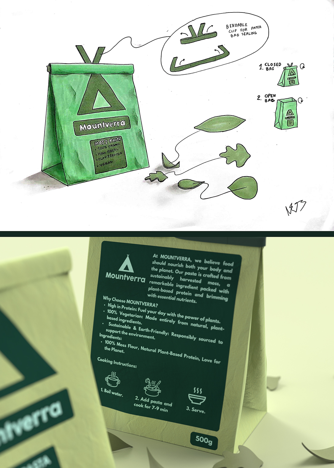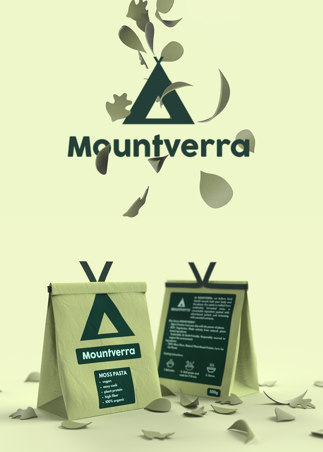 The core concept behind Mountverra is rooted in nature. The pasta is imagined as a vegan, organic, and eco-friendly alternative to conventional products, designed specifically for consumers who appreciate sustainable living, plant-based nutrition, and environmentally responsible choices. Moss, an unconventional yet nutrient-rich ingredient, symbolizes resilience and natural balance, making it an ideal starting point for this design exercise.